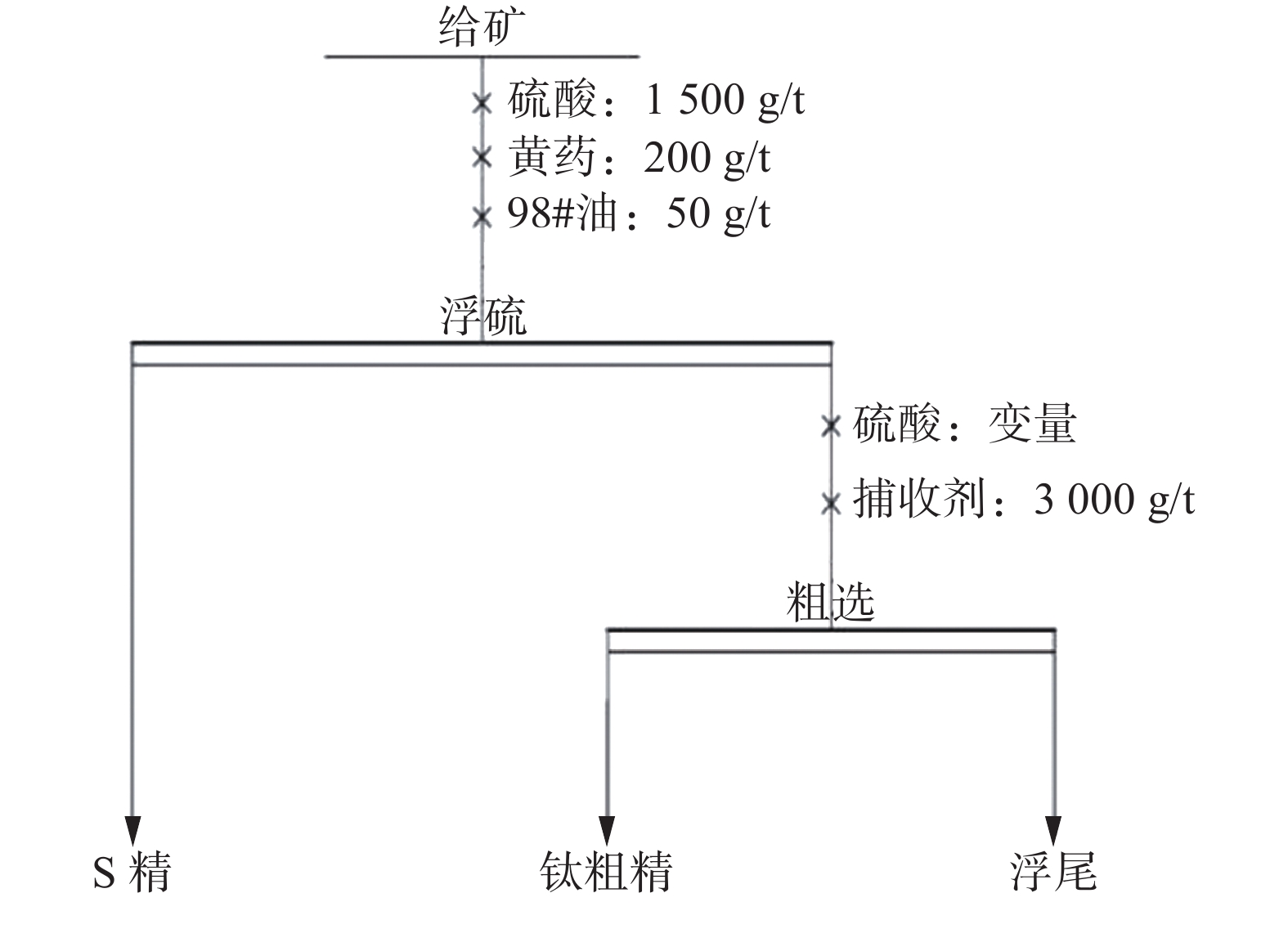 捕收剂用量/(g·t−1) 产品 产率/% TiO2品位/% TiO2回收率/% 2200 S精 5.82 16.12 5.07 钛粗精 32.93 39.87 71.03 浮尾 61.25 7.21 23.89 给矿 100.00 18.48 100.00 2600 S精 5.93 16.23 5.17 钛粗精 36.36 38.67 75.52 浮尾 57.71 6.23 19.31 给矿 100.00 18.62 100.00 3000 S精 5.71 16.37 5.01 钛粗精 39.50 37.14 78.60 浮尾 54.79 5.58 16.38 给矿 100.00 18.66 100.00 3400 S精 6.23 16.69 5.50 钛粗精 42.06 35.82 79.68 浮尾 51.71 5.42 14.82 给矿 100.00 18.91 100.00 3800 S精 5.65 16.08 4.81 钛粗精 45.54 34.06 82.22 浮尾 48.81 5.01 12.96 给矿 100.00 18.86 100.00 -