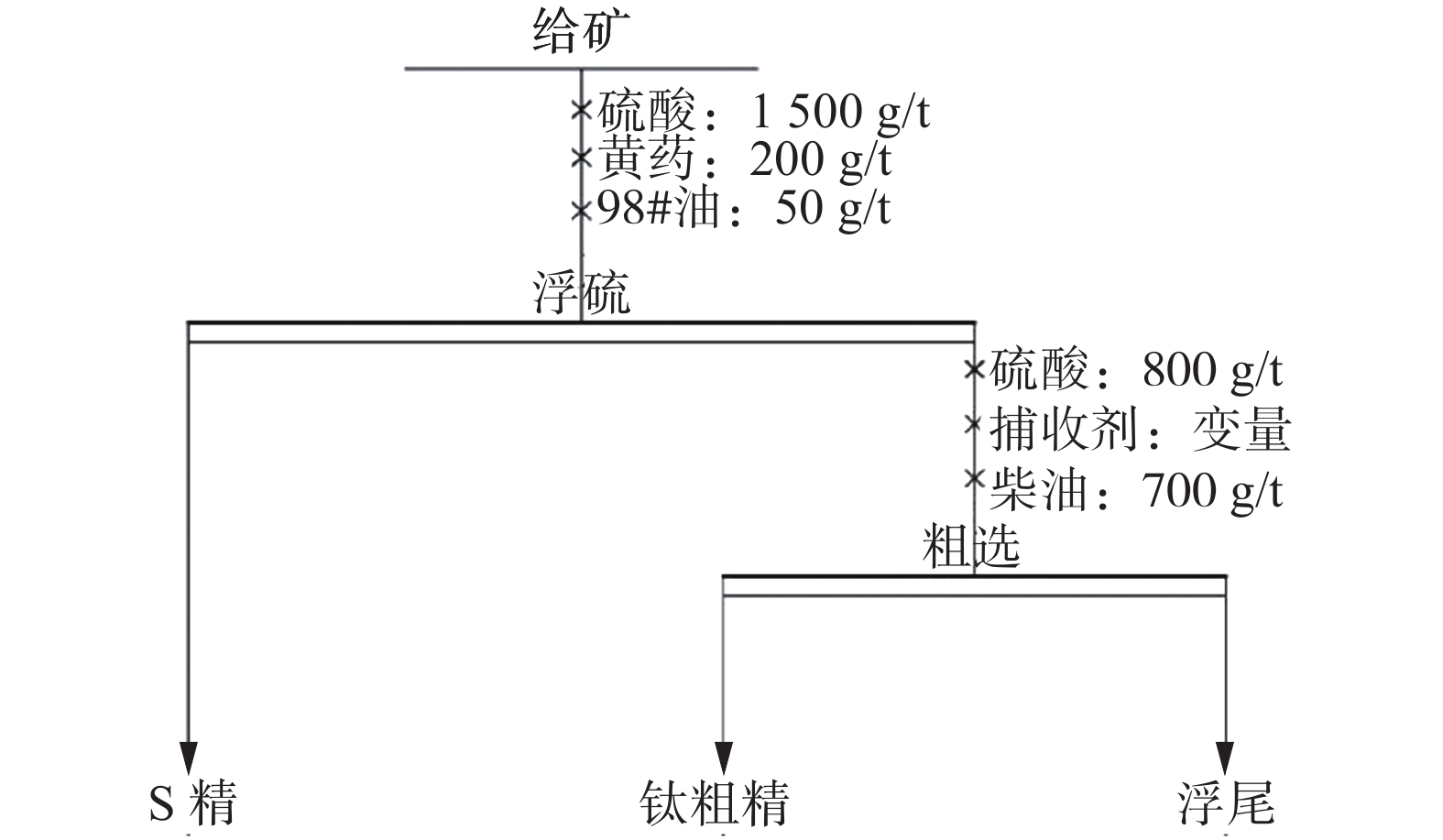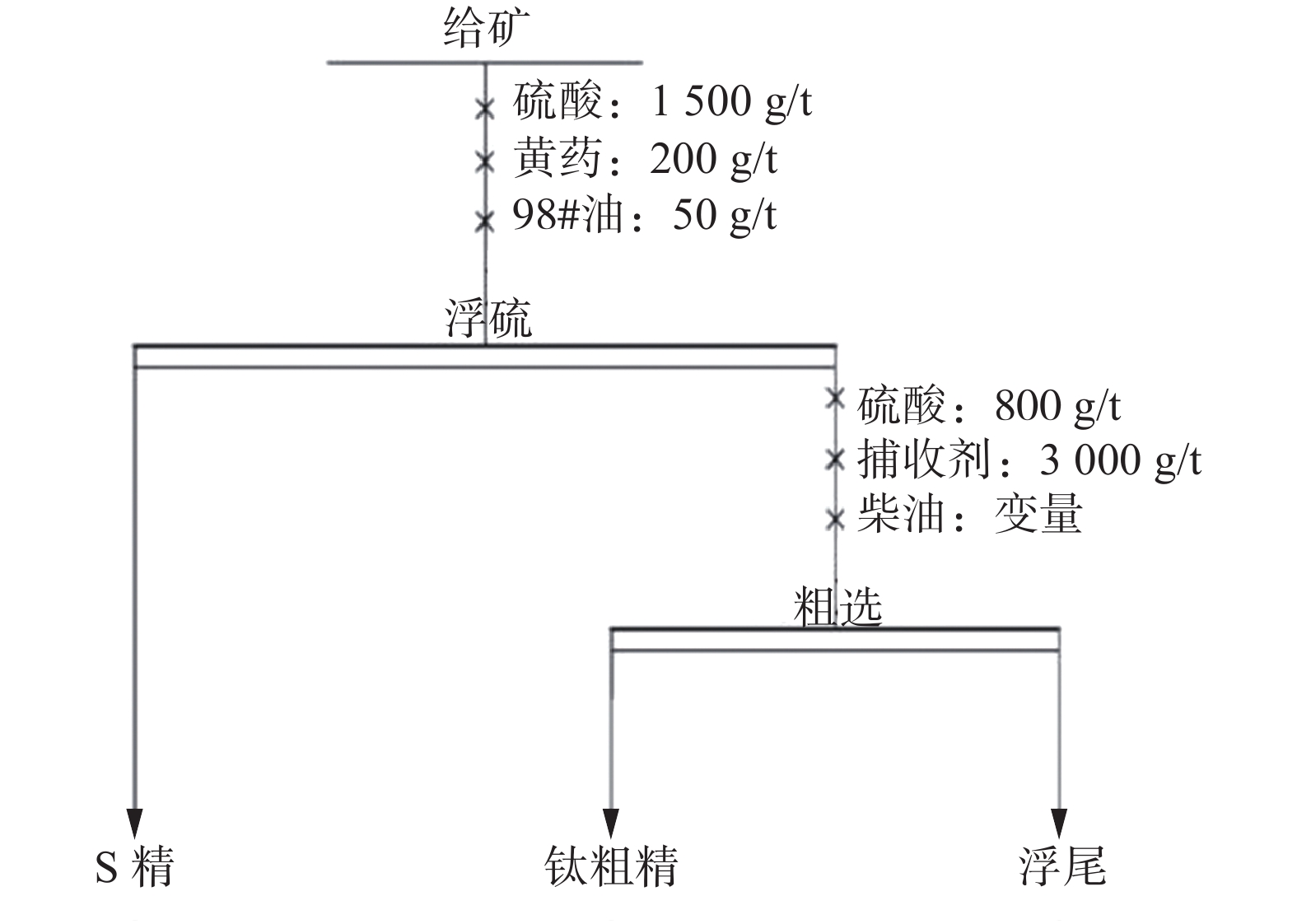 硫酸用量/(g·t−1) 产品 产率/% TiO2品位/% TiO2回收率/% 600 S精 6.18 16.58 5.44 钛粗精 47.47 30.68 77.21 浮尾 46.35 7.06 17.35 给矿 100.00 18.86 100.00 700 S精 5.43 16.38 4.84 钛粗精 39.50 34.38 73.86 浮尾 55.07 7.11 21.30 给矿 100.00 18.39 100.00 800 S精 6.67 16.84 5.95 钛粗精 35.13 38.66 71.92 浮尾 58.21 7.18 22.13 给矿 100.00 18.88 100.00 900 S精 6.85 17.59 6.50 钛粗精 31.13 40.42 67.92 浮尾 62.02 7.64 25.58 给矿 100.00 18.53 100.00 1000 S精 5.03 16.37 4.39 钛粗精 28.32 42.44 64.06 浮尾 66.66 8.88 31.55 给矿 100.00 18.76 100.00 表 11 柴油用量条件试验结果