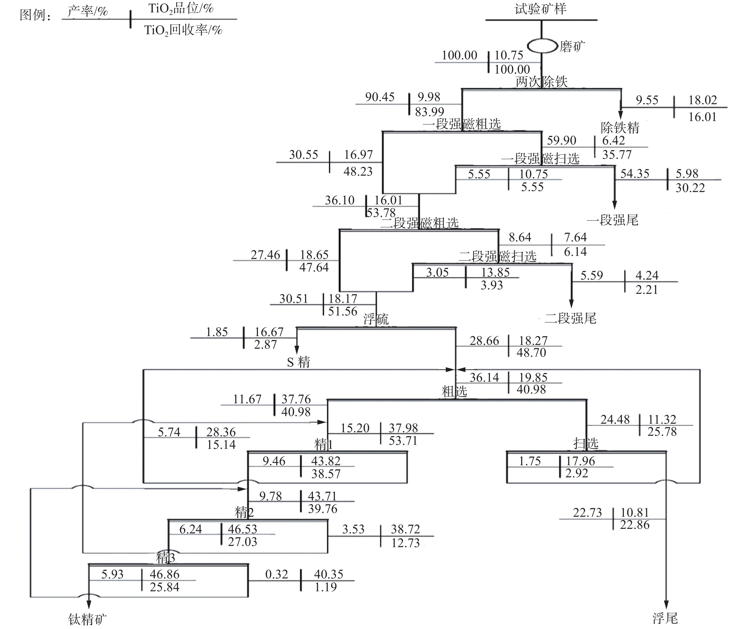 产品 产率/% TiO2品位/% TiO2回收率/% 精矿 66.91 12.55 78.11 尾矿 33.09 7.11 21.89 给矿 100.00 10.75 100.00 表 5 强磁选磁场强度条件试验结果