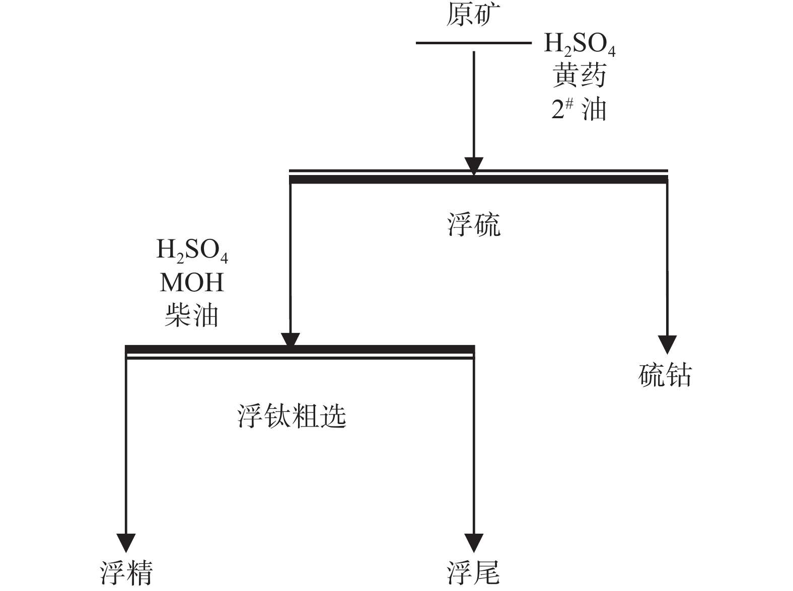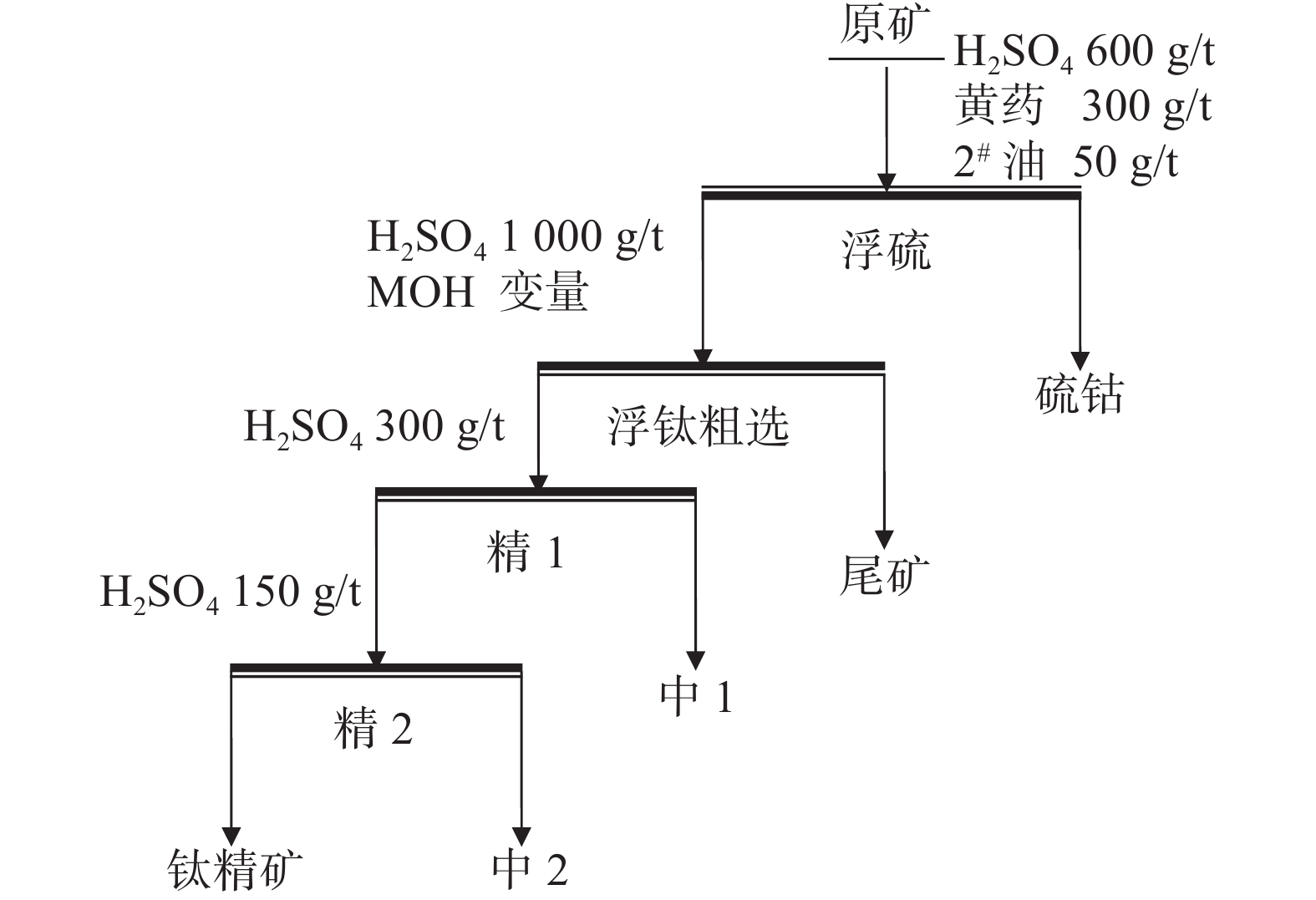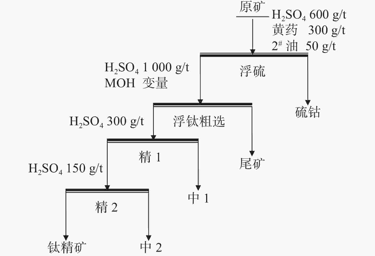 硫酸用量/(g·t−1) 产品 品位/% 产率/% 回收率/% 800 浮硫精矿 10.75 3.98 1.80 钛精矿 32.48 67.63 92.41 尾矿 4.89 28.39 5.84 原矿 23.77 100 100.00 1000 浮硫精矿 10.75 3.46 1.56 钛精矿 36.68 57.88 89.23 尾矿 5.66 38.66 9.21 原矿 23.77 100.00 100.00 1300 浮硫精矿 10.27 4.21 1.82 钛精矿 39.31 50.52 83.42 尾矿 7.75 45.27 14.76 原矿 23.77 100 100.00 1600 浮硫精矿 11.03 3.27 1.52 钛精矿 41.64 44.22 77.43 尾矿 9.53 52.51 21.05 原矿 23.77 100.00 100.00 表 13 浮钛粗选捕收剂MOH用量条件试验