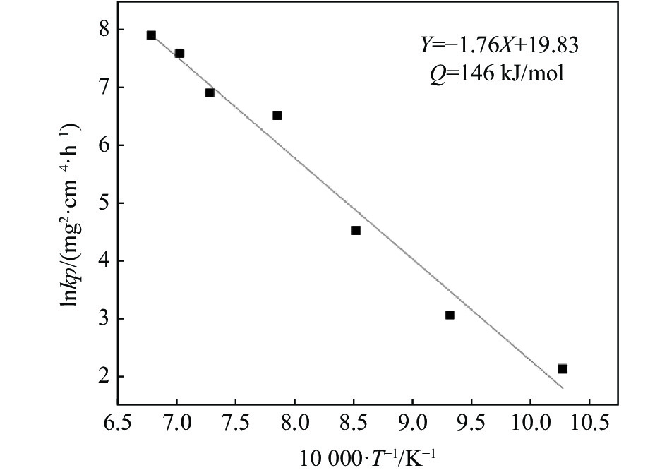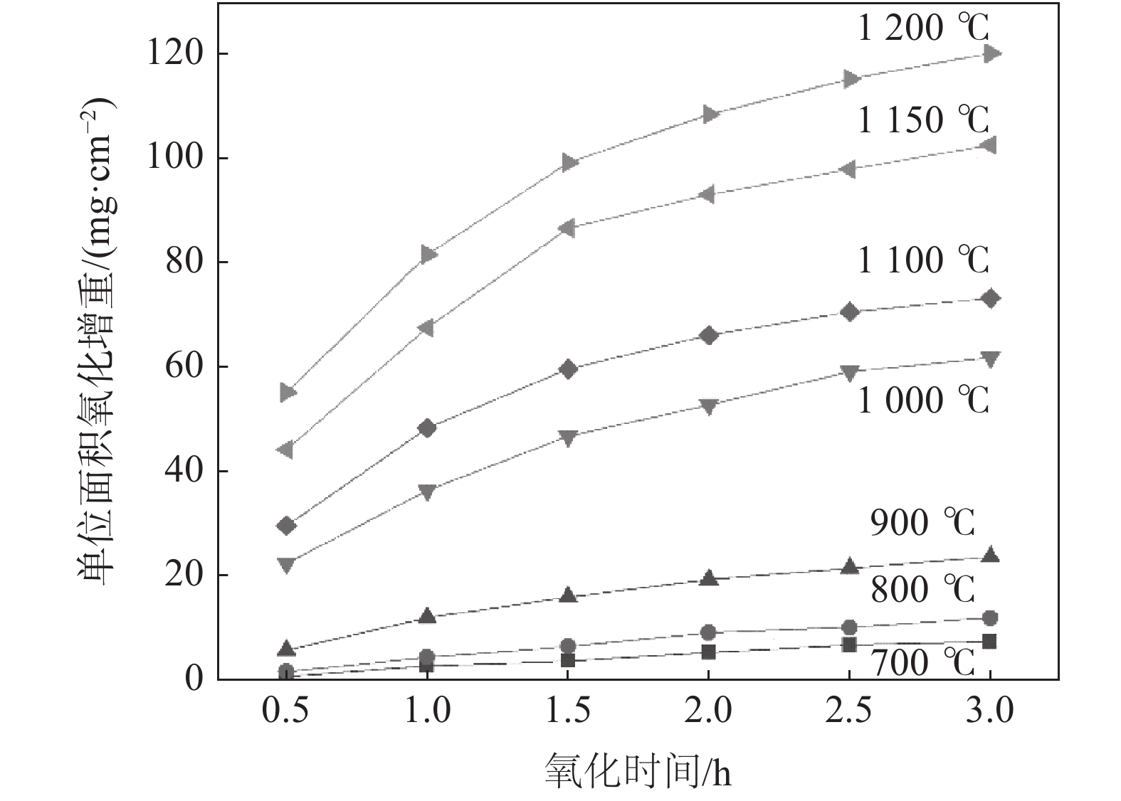 氧化温度/℃ 氧化时间/h Kp/(mg2·cm−4·h−1) 700 3 8.34 800 3 21.18 900 3 91.37 1000 3 673.11 1100 3 995.32 1150 3 1963.44 1200 3 2692.20 -