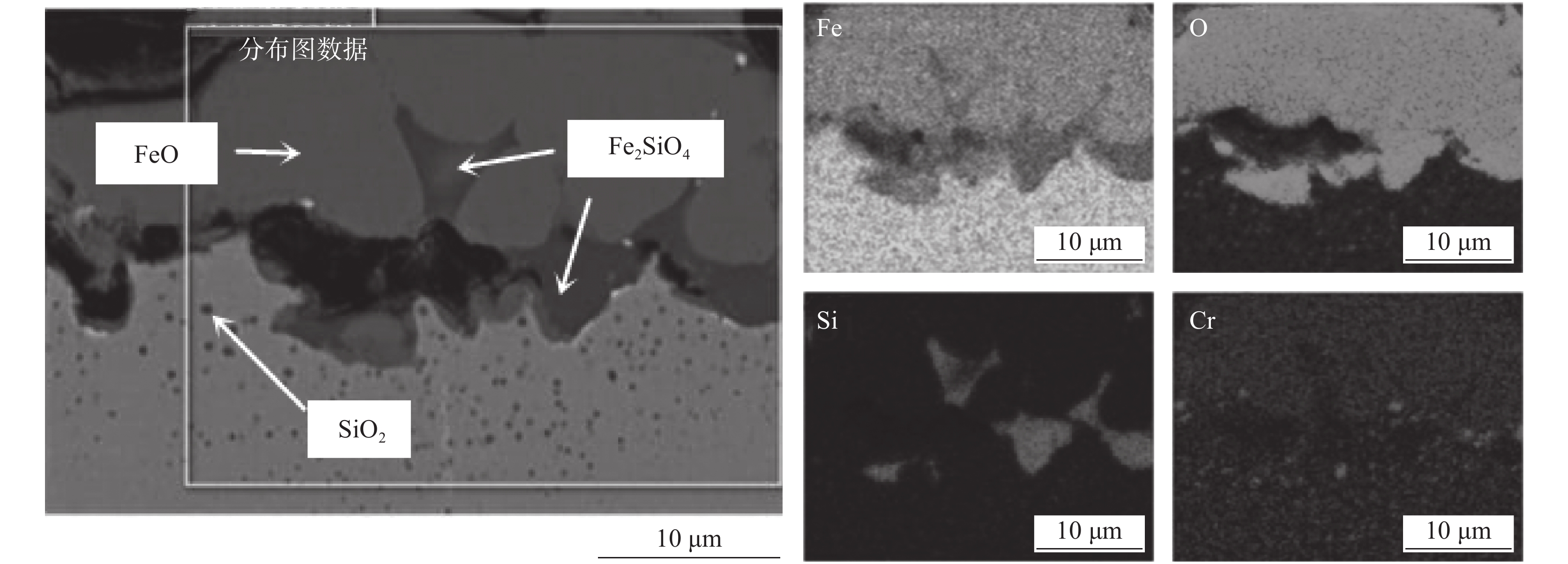 摘要: 为了明确含有Si和Cr耐候钢Q235NH的高温氧化行为,对耐候钢Q235NH在700~1200 ℃进行氧化试验,采用光学显微镜(OM)、扫描电子显微镜(SEM)和能谱仪(EDS) 以及X射线衍射仪(XRD)等手段对氧化铁皮成分进行分析,结合氧化动力学曲线,分析了其氧化结构演变过程。试验结果表明:Q235NH氧化铁皮的生成符合抛物线规律,其激活能为146 kJ/mol。氧化铁皮结构包括最外层较薄的Fe2O3和Fe3O4层,中间层为较厚的FeO和块状先共析Fe3O4组成。此外,当加热温度小于1100 ℃ 时,在氧化铁皮和基体之间还会形成较薄且连续的富硅富铬层,对铁离子的向外扩散有一定的阻碍作用,从而使得氧化更难进行,但当加热温度大于1100 ℃后,硅铬层遭到破坏,这会促进氧化的进行。Abstract: To clarify the high temperature oxidation behavior of weathering steel Q235NH containing Si and Cr, the oxidation experiment of weathering steel Q235NH was carried out at 700 ~ 1 200 ℃. The composition of iron oxide scale was analyzed by optical microscope (OM),scanning electron microscope (SEM), energy dispersive spectrometer (EDS) and X-ray diffraction (XRD). The evolution process of oxidation structure was analyzed by investigating oxidation kinetics curve. The results show that the iron oxide scale formation of Q235NH steel complies with the parabolic law, and its activation energy is 146 kJ/mol. The iron oxide scale structure consists of thin Fe2O3 and Fe3O4 layers in the outermost layer and thick FeO and massive proeutectoid Fe3O4 layers in the middle layer. In addition, when the heating temperature is lower than 1 100 ℃, a thin continuous silicon chromium rich layer will be formed between the scale and the substrate, which will hinder the outward diffusion of iron ions, making the oxidation more difficult. However, when the heating temperature is greater than 1100 ℃, the silicon chromium layer will be destroyed, which will promote the oxidation.