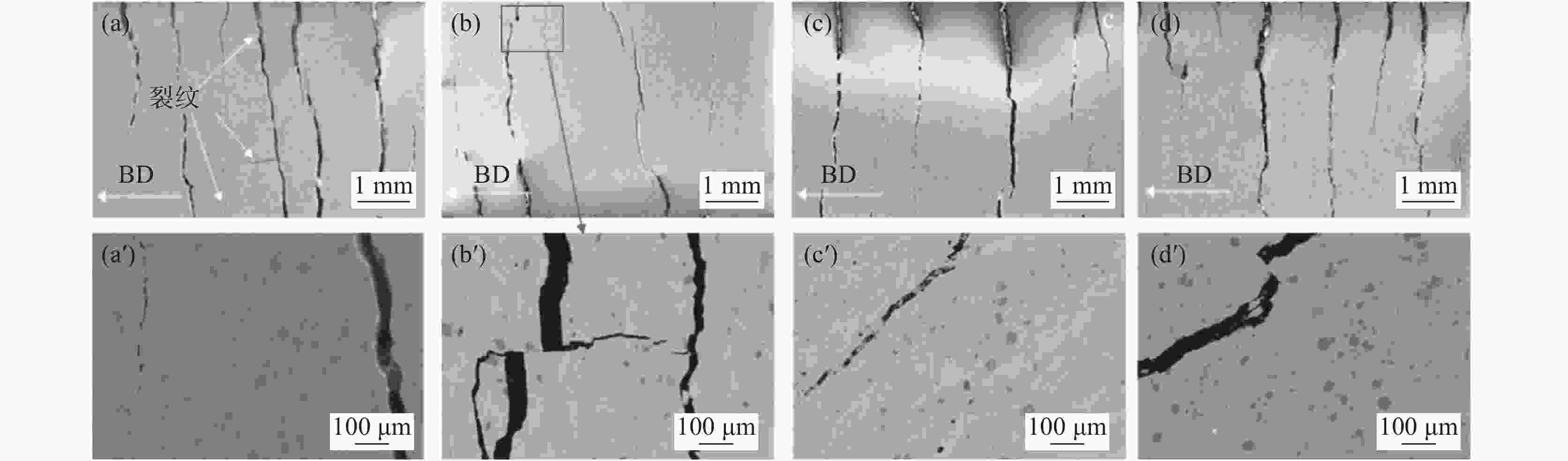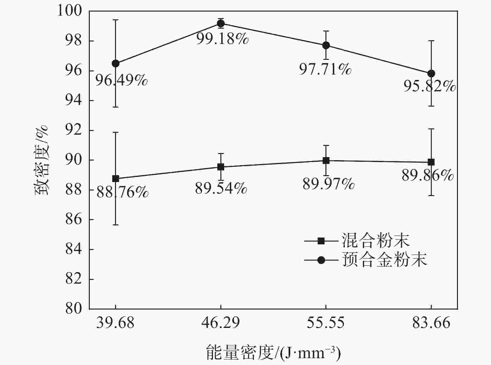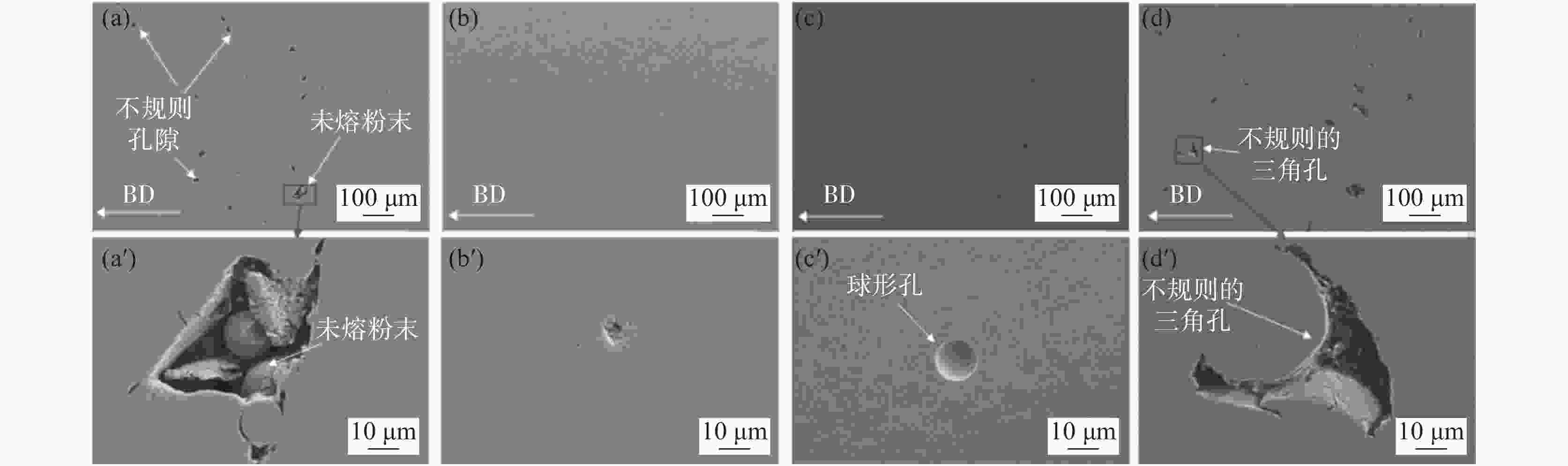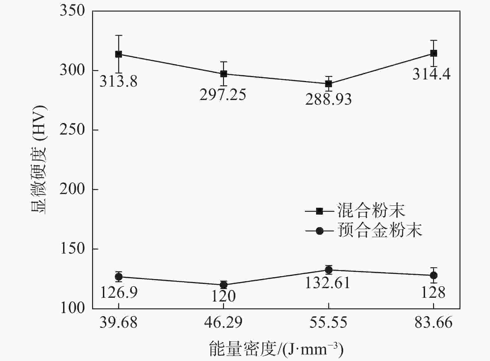 摘要: 分别以Ni+Ti元素混合粉末和NiTi预合金粉末为原料,采用选区激光熔化工艺打印成形。重点研究了在相同打印工艺参数下原料粉末对成形件致密度、物相组成、显微组织、显微硬度的影响,从而反馈说明所用打印粉末对成形件性能的影响。结果表明:在相同打印工艺参数下,整体上NiTi预合金粉末成形件的致密度较高,而Ni+Ti 混合粉末成形件的显微硬度较高。对于同一种粉末,随着能量密度的增大,成形件的致密度先增大后减小,而显微硬度先减小后增大。NiTi预合金粉末成形件有致密的微观结构且相分布均匀,但存在少量孔隙。Ni+Ti 混合粉末成形件的微观结构有和构建方向垂直的贯穿式裂纹以及不均匀的基体相,但几乎没有孔隙。Abstract: In this study, Ni + Ti mixed powder and NiTi pre-alloyed powder were used to print by selective laser melting process. The effects of raw material powder on the density, phase composition, microstructure and microhardness of formed parts under the identical processing parameters are studied, so as to feedback the effects of raw powder on the properties of formed parts. The results showed that under the identical processing parameters, the density of the formed parts fabricated by NiTi pre-alloyed powder was higher, while the microhardness of Ni + Ti mixed powder formed parts was higher. For the same powder, with increase of energy density, density of the formed parts first increased and then decreased, while microhardness first decreased and then increased. NiTi pre-alloyed powder formed parts had dense microstructure and uniform phase distribution, but there presented several pores. The microstructure of Ni + Ti mixed powder formed parts has through cracks perpendicular to the construction direction and uneven matrix phase, but there are almost no pores in the structure.
