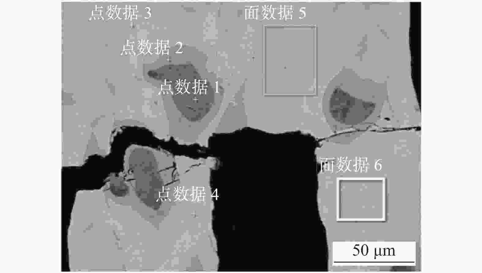 区域 y/% Ti Ni 合计 点数据1 99.62 0.38 100.00 点数据 2 73.93 26.07 100.00 点数据 3 39.98 60.02 100.00 点数据 4 39.46 60.54 100.00 面数据 5 44.25 55.75 100.00 面数据 6 42.49 57.51 100.00 -