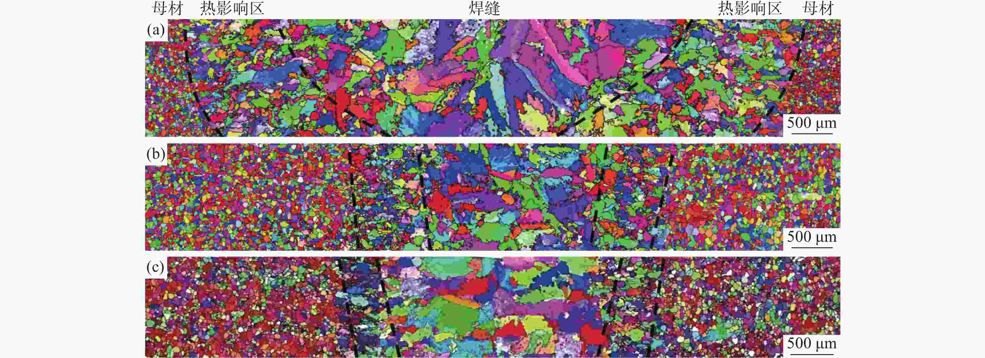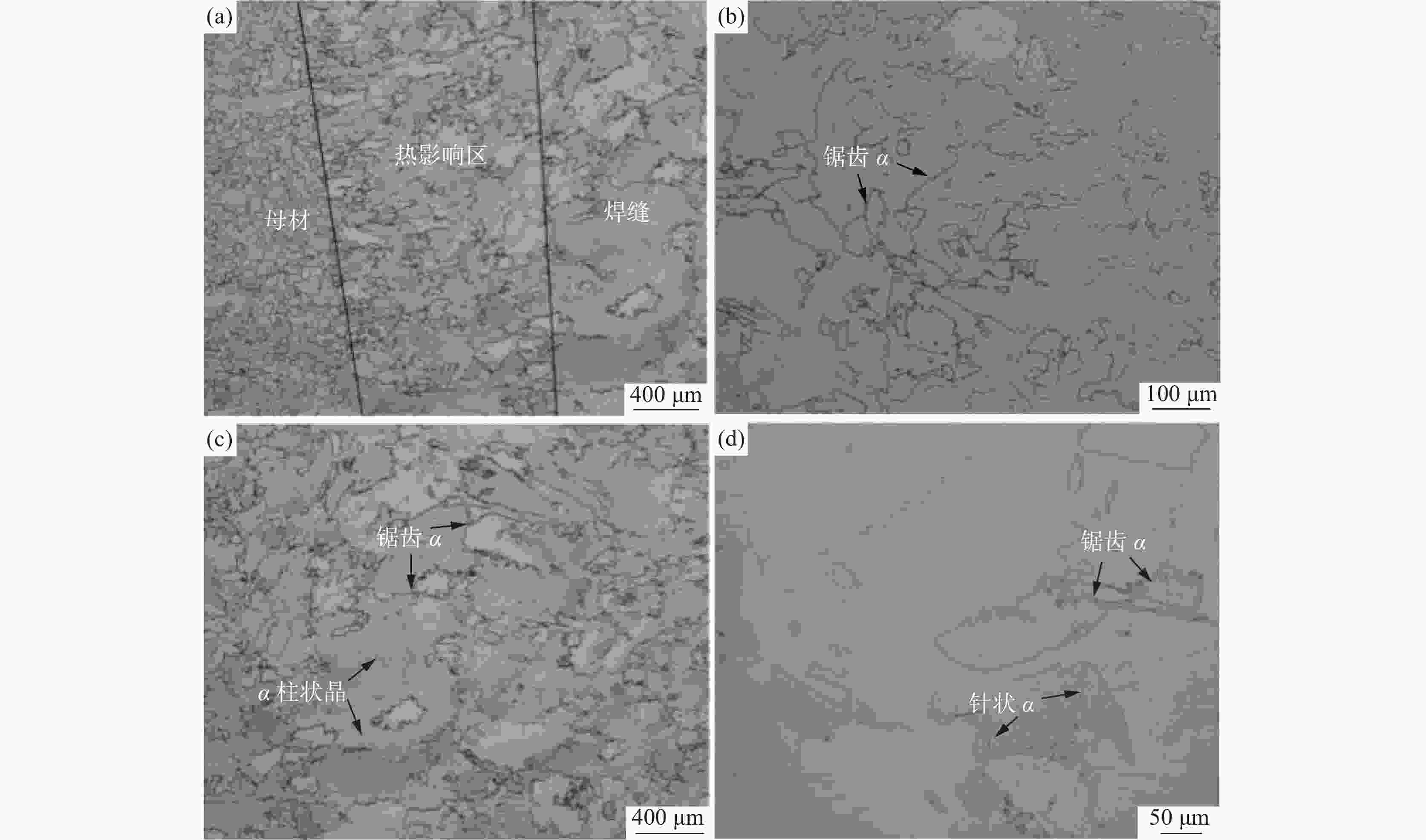 摘要: 采用真空电子束焊对30 mm厚TA1工业纯钛试板开展焊接试验,结合光学金相显微镜(OM)、维氏硬度、拉伸试验及电子背散射衍射(EBSD)对接头进行宏微观组织性能检验,分析电子束焊接过程对TA1材料微观组织与力学性能的影响及接头强化原因。结果表明:电子束焊接热循环过程使TA1母材至焊缝组织由等轴α向锯齿α转变;焊缝及热影响区的强度、硬度均高于母材;接头性能得到强化与锯齿α及针状α马氏体对硬度的提升作用、焊缝及热影响区内细小的锯齿状α晶粒以及微细孪晶对焊接组织的细化作用有关。Abstract: Electron beam welding was used to weld 30 mm thick TA1 pure titanium plates. Combined with optical microscope (OM) and electron backscatter diffraction (EBSD), the microstructure, Vickers hardness and tensile test of the joint were carried out. The influence of welding process on microstructure and mechanical properties of TA1 material and the strengthening reason of the joint were analyzed. The results show that the microstructure from TA1 base metal to weld metal changes from equiaxed α to serrated α. The strength and hardness of welding seam and the heat affected zone are higher than the base metal. The strengthening of the joint properties is related to the increasing effect of serrated α and acicular α martensite on the hardness, the existence of a large number of serrated α lower than the grain size of the base metal in the weld seam and heat-affected zone, and the refining effect of micro-twinning on the welding microstructure.