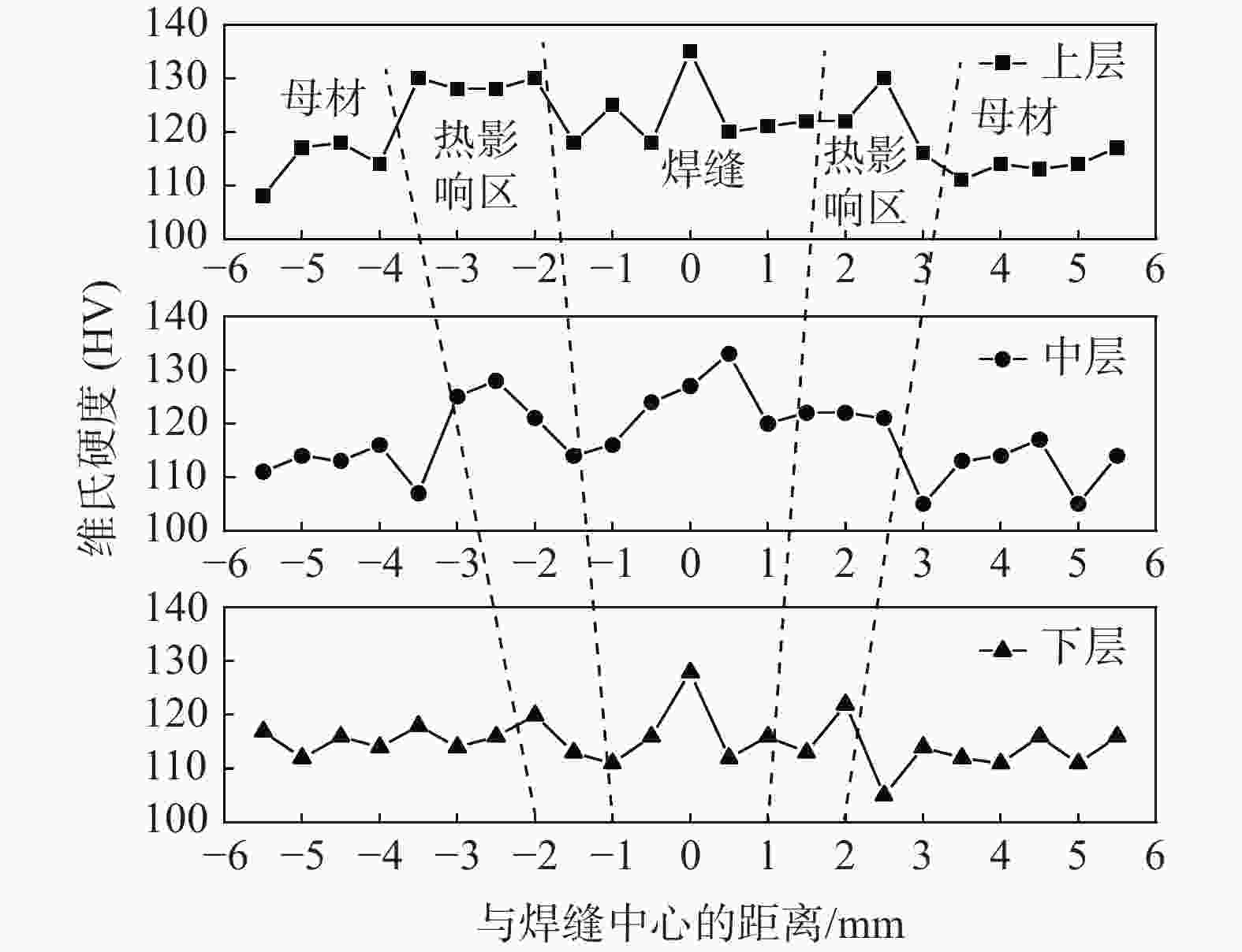 接头上层 225.7 335.3 47.7 76.0 12.4 4.6 4.2 中层 220.7 332.7 46.7 76.7 11.1 4.6 4.2 下层 216.0 335.3 45.7 76.0 9.7 4.6 4.3 注:Rp0.2-屈服强度;Rm-抗拉强度;A-断后伸长率;Z-断面收缩率。 -