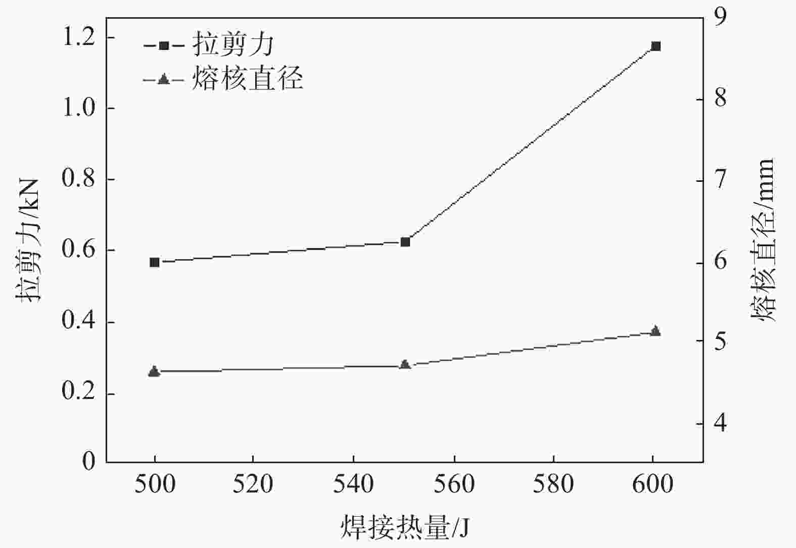 图  4  焊接热量对接头拉剪力和熔核直径的影响