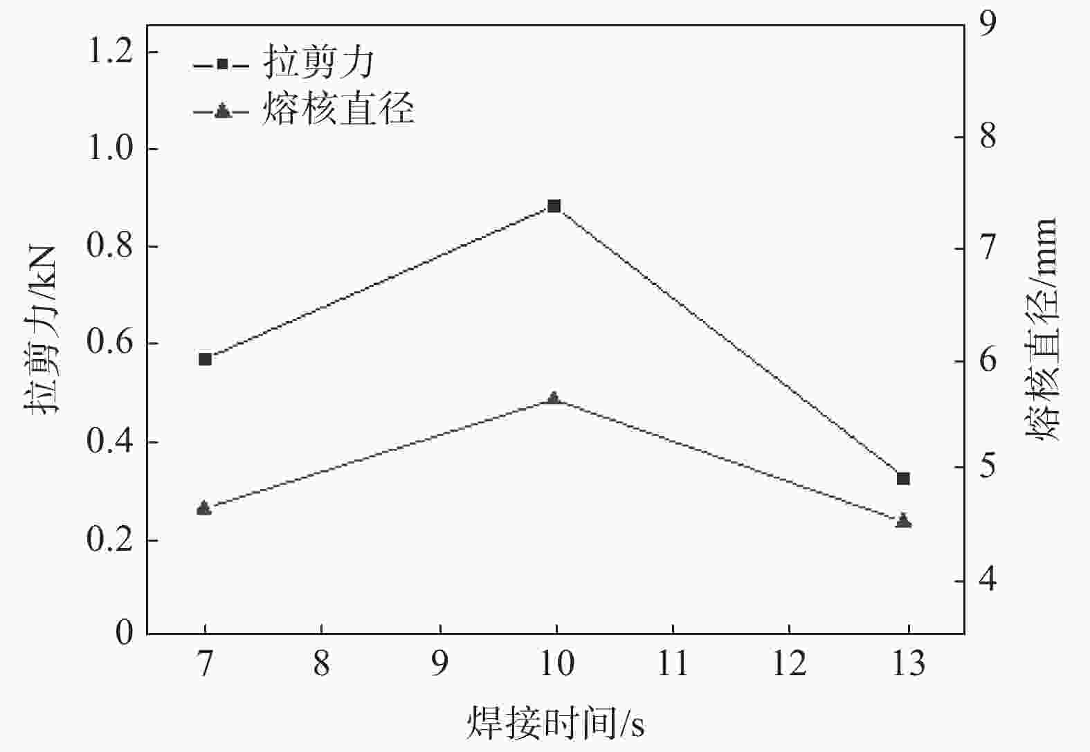 图  5  焊接时间对接头拉剪力和熔核直径的影响