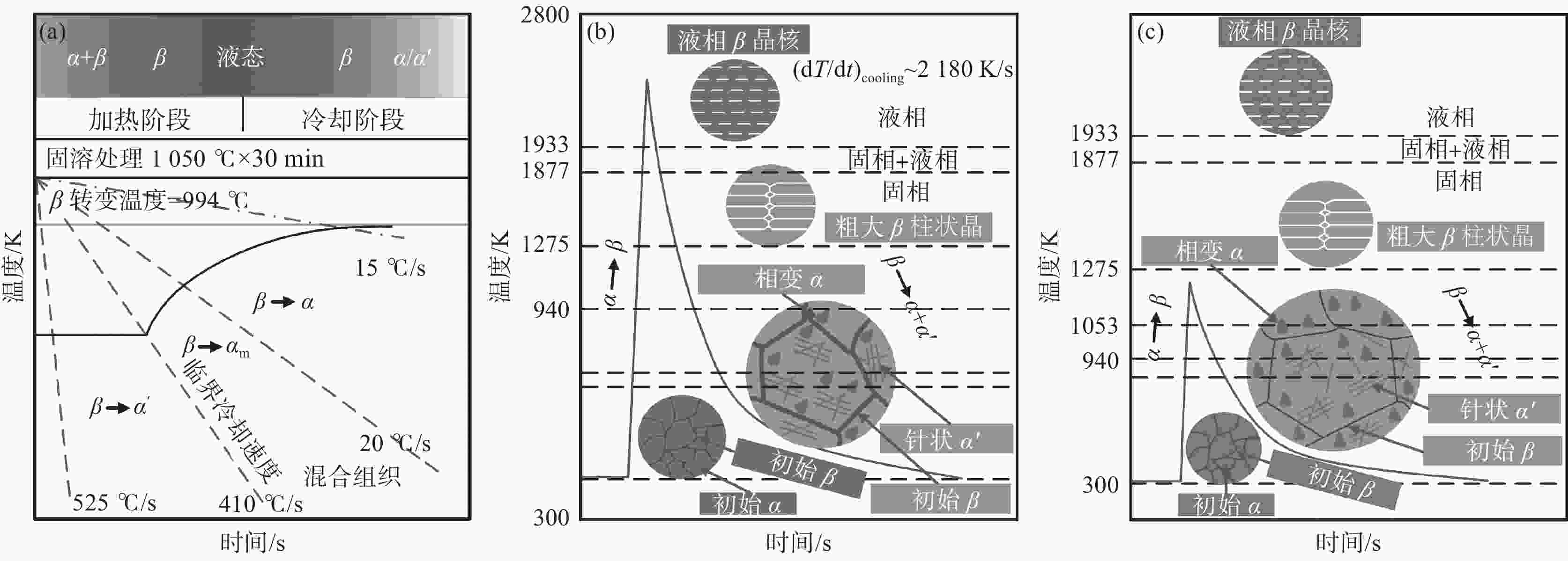 (a) TC4 β 1050 ℃固溶处理连续冷却转变; (b) 焊缝区热循环和相转变; (c)热影响区的热循环和相转变