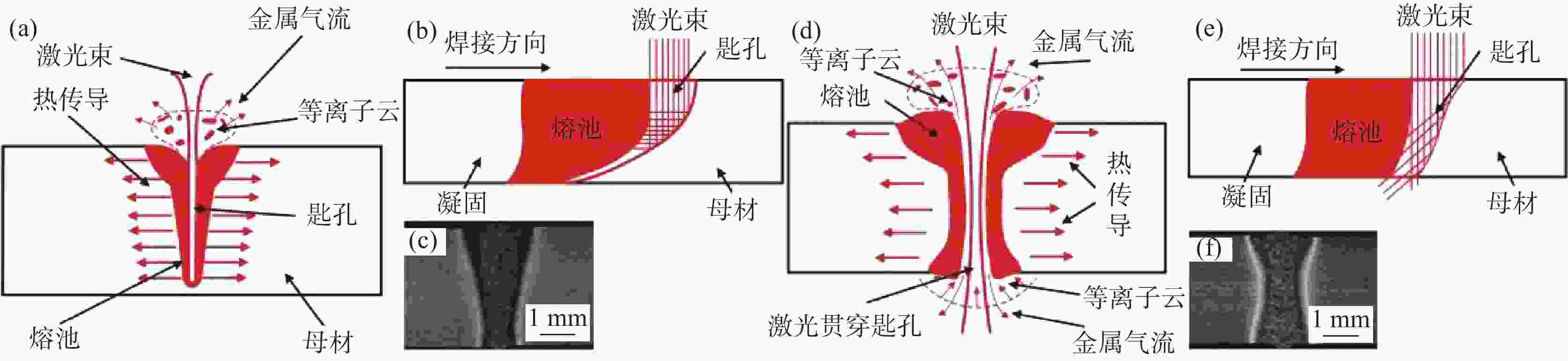 (a)和(b) 闭合匙孔模式; (c) 闭合匙孔焊缝形貌; (d)和(e) 开放匙孔模式; (f) 开放匙孔焊缝形貌