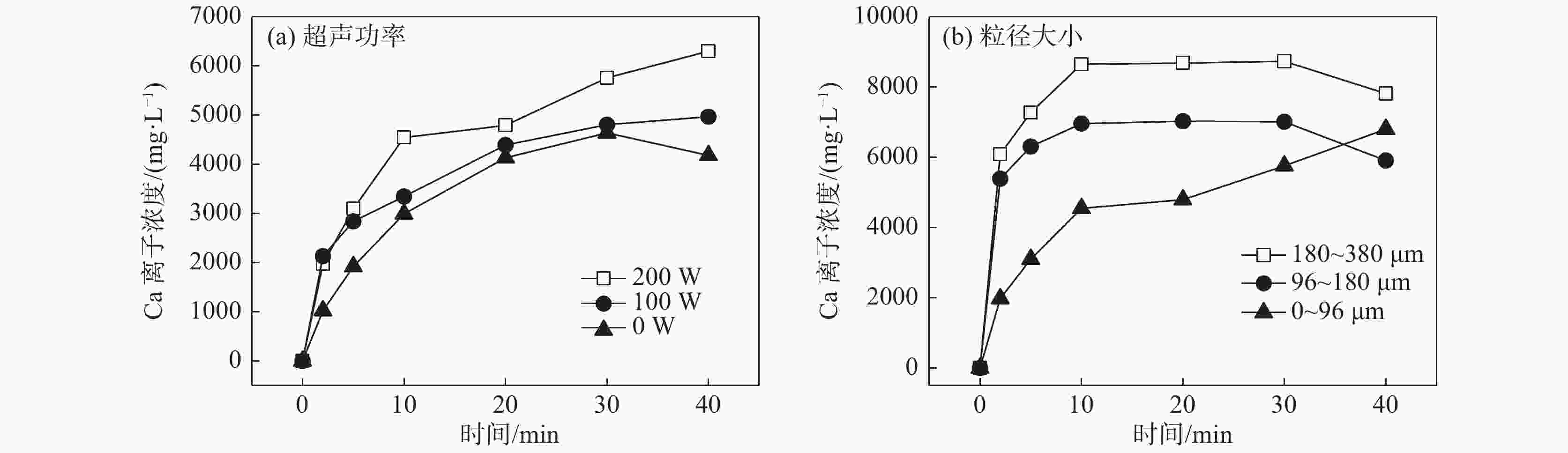 初始乙酸浓度=0.5 mol/L,温度=40 ℃, 时间=40 min(a)原料(粒度=180 ~ 380 μm);(b)机械搅拌(粒度=180 ~ 380 μm);(c)超声(超声功率=100 W, 粒度=180 ~ 380 μm);(d)超声(超声功率=200 W, 粒度=180 ~ 380 μm);(e)超声(超声功率=200 W, 粒度=0 ~ 96 μm);(f)超声(超声功率=200 W, 粒度=96 ~ 180 μm)