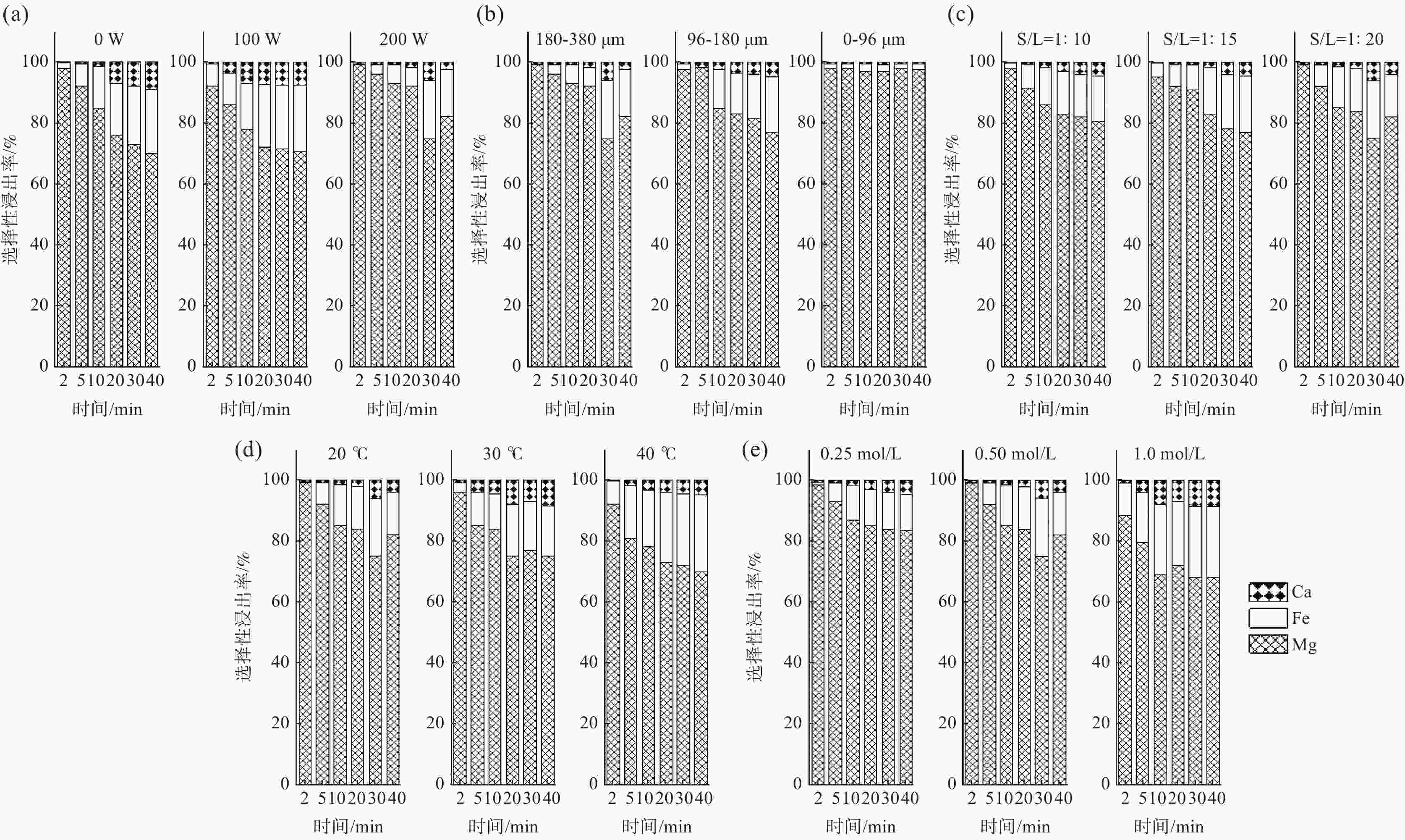 摘要: 炼钢渣是一种含有大量硅酸钙的碱性废物,可用于钢铁企业捕获CO2并合成高附加值的CaCO3。在此研究了在乙酸溶液中超声对炼钢渣中Ca的浸出率和选择性提取率的影响。试验结果表明,超声功率、液固比和乙酸溶液的初始浓度与Ca的浸出率呈正相关,但炼钢渣的粒度和温度与Ca的浸出率呈负相关。温度和乙酸溶液的初始浓度与Ca的选择性提取率呈负相关。此外,超声功率和固液比对Ca的选择性提取率影响不大,但增加超声功率和固液比会增加非钙杂质元素的浸出率。在0.5 mol/L乙酸水溶液中提取0.96 μm以下炼钢渣中的钙,反应40 min后Ca的选择性提取率高达96.7%。在浸出过程中,超声可以有效打破和去除炼钢渣颗粒表面残留的二氧化硅形成的多孔钝化层,提高Ca的浸出率。Abstract: Steelmaking slags containing large amounts of Ca silicate is a potentially alkaline waste that can be used to capture CO2 to synthesize high-quality CaCO3. Here, effect of ultrasonic on leaching efficiency and selective leaching rate of Ca in steelmaking slags was studied in acetic acid solution. Experimental results shown that ultrasound could help to strengthen leaching of Ca in acetic acid solution. Ultrasonic power, liquid-solid ratio, and initial acetic acid solution concentration were positively correlated with Ca extraction, but particle size of steelmaking slags and temperature were negatively correlated with Ca extraction. Meanwhile, temperature and initial concentration of acetic acid solation had a negative correlation to selective extraction yield of Ca, which were beneficial for the diffusion of impurity elements. Also, ultrasonic power and solid to liquid ratio were insignificant effect to selective extraction yield of Ca, but increase of ultrasonic power and solid to liquid ratio were also helpful to the diffusion of impurity elements. It was worth noting that decreasing grain size of steelmaking slags would raise selective leaching efficiency of Ca and the maximum selective leaching rate upped to 96.7%. During leaching process, ultrasonic could effectively break and remove the porous passivation layer formed by residual silica on surface of steelmaking slags particles, and improved leaching rate of Ca.