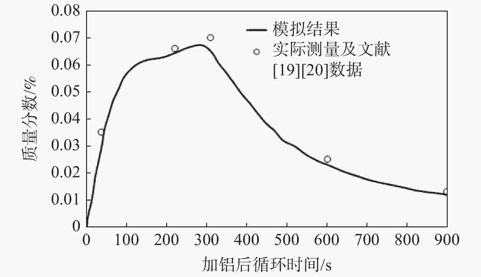 [1] 陈固军. RH真空精炼过程流体流动和夹杂物行为的数值模拟[D]. 重庆: 重庆大学, 2017.Chen Gujun. Numerical simulation of fluid flow and inclusion behavior in RH vacuum refining process[D]. Chongqing: Chongqing University, 2017. [2] 王耀. 基于分形理论模拟钢中夹杂物上浮及碰撞凝聚规律的研究[D]. 北京: 北京科技大学, 2015.Wang Yao. Research of simulation inclusion floating, collision and aggregation law in molten steel based on fractal theory[D]. Beijing: University of Science and Technology Beijing, 2015. [3] 段豪剑. 钢液中非金属夹杂物相关界面现象的基础研究[D]. 北京: 北京科技大学, 2018.Duan Haojian. Fundamental on interfacial phenomena of non-metallic inclusions in molten steel[D]. Beijing: University of Science and Technology Beijing, 2018. [4] Smoluchowski M. Versuch einer mathematischen theorie der koagulationskinetik kolloider Lösungen[J]. Zeitschrift Für Physikalische Chemie, 1917,92(3):129−168. [5] 张建, 李海键. 气体搅拌条件下基于计算流体动力学的钢液中夹杂物的长大与去除模型[C]. 北京: 中国金属学会, 2003.Zhang Jian, Li Haijian. A CFD-based model for growth and removal of inclusions in molten steel under gas-stirring conditions[C]. Beijing: The Chinese Society for Metals, 2003. [6] Wang L T, Zhang Q Y, Peng S H, et al. Mathematical model for growth and removal of inclusion in a multi-tuyere ladle during gas-stirring[J]. ISIJ International, 2005,45(3):331−337. doi: 10.2355/isijinternational.45.331 [7] Zhang J, Lee H G. Numerical modeling of nucleation and growth of inclusions in molten steel based on mean processing parameters[J]. ISIJ International, 2004,44(10):1629−1638. doi: 10.2355/isijinternational.44.1629 [8] Zhang L F, Pluschkell W. Nucleation and growth kinetics of inclusions during liquid steel deoxidation[J]. Ironmaking and Steelmaking, 2003,30(2):106−110. doi: 10.1179/030192303225001766 [9] Lindborg U, Torssell K. A collision model for the growth and separation of deoxidation products[J]. Transactions of the Metallurgical Society of AIME, 1968,242(1):94−96. [10] Pesteanu O. Short contribution to the mathematical modeling of coagulation effect on entrapped inclusion concentration in continuously cast steel[J]. ISIJ International, 2006,46(2):339−340. doi: 10.2355/isijinternational.46.339 [11] Gelbard F, Tambour Y, Seinfeld J H. Sectional representations for simulating aerosol dynamics[J]. Journal of Collioid and Interface Science, 1980,76(2):541−556. doi: 10.1016/0021-9797(80)90394-X [12] Naaoka T, Taniguchi S, Matsumoto K, et al. Particle-size-grouping method of inclusion agglomeration and its application to water model experiments[J]. ISIJ International, 2001,41(10):1103−1111. doi: 10.2355/isijinternational.41.1103 [13] Yamaguchi K, Kishimoto Y, Sakuraya T, et al. Effect of refining conditions for ultra low carbon steel on decarburization in RH degasser[J]. ISIJ International, 1992,32(1):126−135. doi: 10.2355/isijinternational.32.126 [14] Takahashi M, Matsumoto H, Saito T. Mechanism of decarburization in RH degasser[J]. ISIJ International, 1995,35(12):1452−1458. doi: 10.2355/isijinternational.35.1452 [15] Geng Dianqiao, Lei Hong, He Jicheng. Effect of different technological factors on inclusion removal in RH degasser[J]. Iron & Steel, 2009,44(10):26−30. (耿佃桥, 雷洪, 赫冀成. 不同工艺因素对RH精炼夹杂物去除过程的影响[J]. 钢铁, 2009,44(10):26−30. doi: 10.3321/j.issn:0449-749X.2009.10.007 [16] Zhao Xinyu, Zhang Jiongming, Luo Yanzhao et al. Mathematical model of decarburization processes in RH refining for ultra-low carbon steel[J]. Journal of University of Science and Technology Beijing, 2012,34(8):876−882. (赵新宇, 张炯明, 罗衍昭, 等. 超低碳钢RH冶炼脱碳过程的数学模型[J]. 北京科技大学学报, 2012,34(8):876−882. [17] Friedlander S K, Wang C S. The self-preserving particle size distribution for coagulation by brownian motion[J]. Journal of Colloid and Interface Science, 1966,22(2):126−132. doi: 10.1016/0021-9797(66)90073-7 [18] Saffman P G, Turne J Sr. On the collision of drops in turbulent clouds[J]. Journal of Fluid Mechanics, 1956,1(8):15−16. [19] Geng Dianqiao, Lei Hong, He Jicheng. Three-dimensional numerical simulation of coalescence and removal of inclusions in RH degasser[J]. Journal of Iron and Steel Research, 2009,21(12):10−13. (耿佃桥, 雷洪, 赫冀成. RH装置内夹杂物聚合与去除的三维数值模拟[J]. 钢铁研究学报, 2009,21(12):10−13. [20] Miki Y, Thomas B G, Denissov A, et al. Model of inclusion removal during RH degassing of steel[J]. Iron and Steelmaker, 1997,24(8):31−38. -