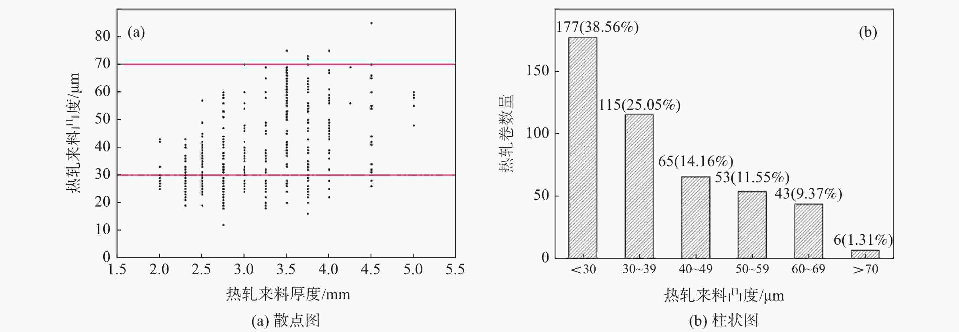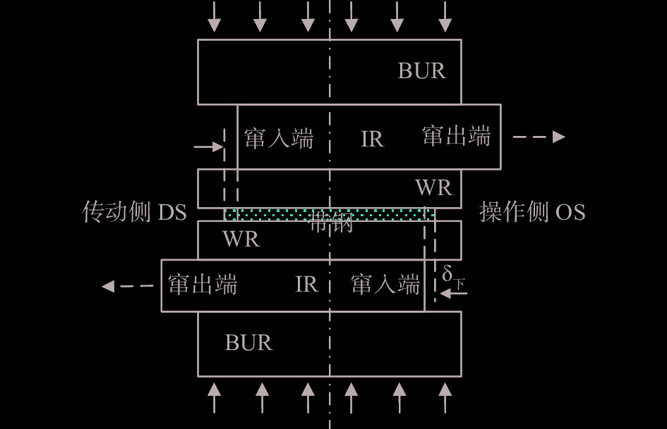 摘要: 四机架六辊HC冷连轧机组末机架在采用光辊轧制时,工作辊弯辊力常处于饱和状态,致使板形调控能力不足,板形缺陷很难消除或进一步降低,影响了板形质量的持续提升。为此,收集并统计了部分热轧卷的板凸度及其分布,结合前三机架弯辊力的分布特点,分析了热轧来料凸度与冷轧末机架承载辊缝形状的匹配关系及对弯辊力的影响。同时分析了利用中间辊负窜来降低弯辊力的在线调整方法对带钢表面质量的影响。在此基础上,提出了采用多段式凸度辊辊型来解决末机架弯辊力饱和的调控策略。在分析辊型参数对板形影响的基础上,通过多次凸度工作辊轧制试验,获得了较优的六次多项式辊型参数。辊型试验结果也表明,在末机架采用五段式正凸度工作辊可增大弯辊的调节能力,减小中间辊负窜量,能有效地解决末机架弯辊力饱和的问题,可进一步提升带钢板形质量。Abstract: The work roll bending force of the last stand of the four stands 6-Hi HC tandem cold rolling mill is usually in saturation state when the brightwork roll is used in the last stand. This production phenomenon leads to the lack of the ability to control the strip shape, and then the shape defects are difficult to eliminate or further reduce. In the meantime, these restrict the continuous improvement of the shape quality of the cold-rolled strip. Therefore, the crown data of some hot-rolled coils were collected, and then its distribution was computed. Combined with the distribution characteristics of the work roll bending force of the first three stands, the relationship between the hot-rolled strip crown and the shape of the loaded roll gap and its impact on the work roll bending force was analyzed. Meanwhile, the influence of the online adjustment method to reduce the work roll bending force by using the negative displacement of intermediate roll on the surface quality of strip was also analyzed. On these bases, a control strategy of using a multi-section positive crown work roll was proposed to solve the saturation of the work roll bending force of the last stand. With the help of analyzing the influence of work roll profile parameters on the strip shape, the optimized parameters of sixth-order polynomial work roll were finally obtained through several online crown work roll rolling tests. In addition, the test results also showed that using five sections of positive crown work roll in the last stand can increase the adjustment ability of the work roll bending and reduce the negative displacement of the intermediate roll. This phenomenon can effectively solve the problem of the saturation of the work roll bending force of the last stand and improve the quality of the strip shape’s quality.
