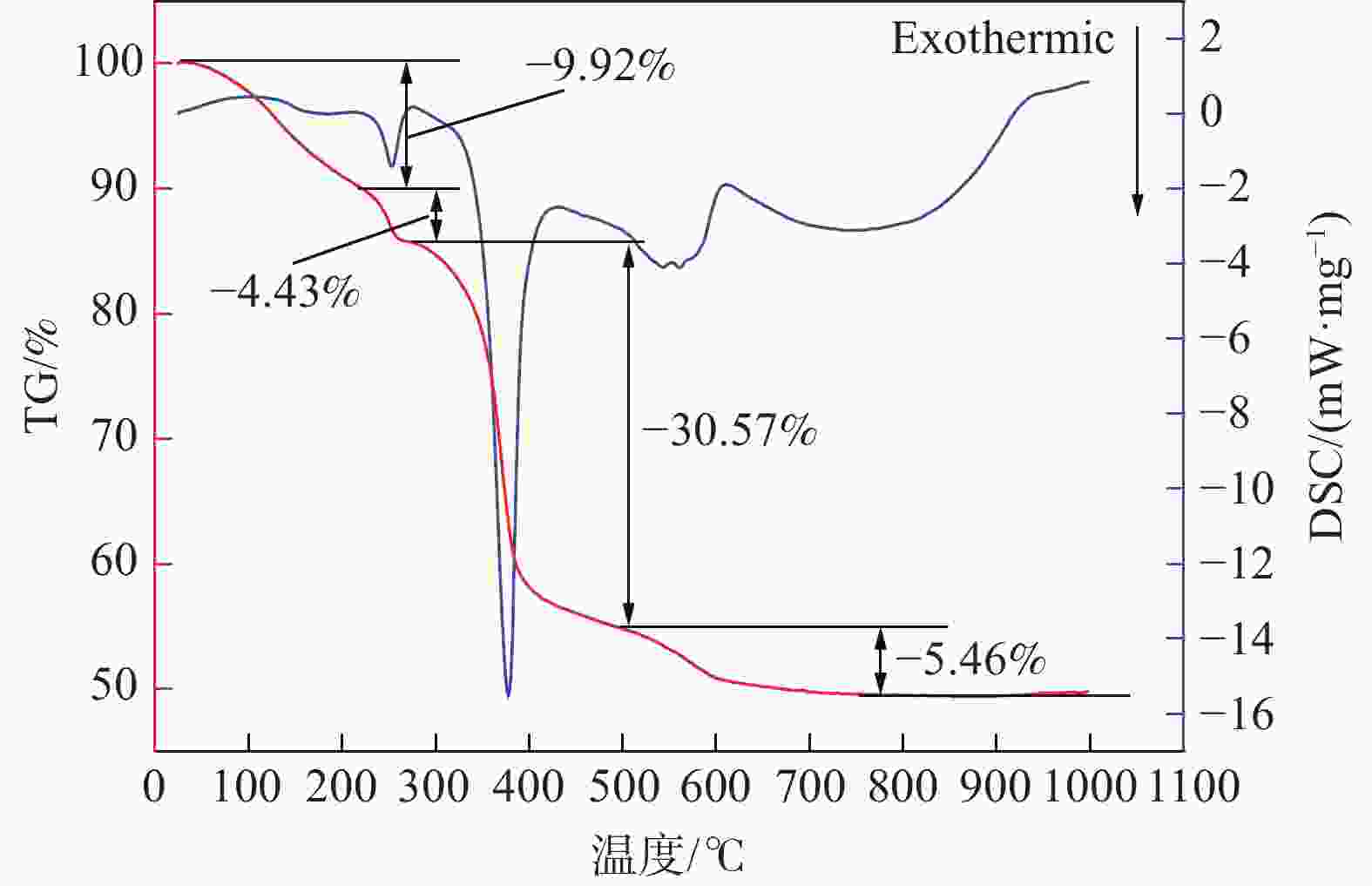 图  4  膨润土-Li2TiO3热重-差示扫描量热曲线