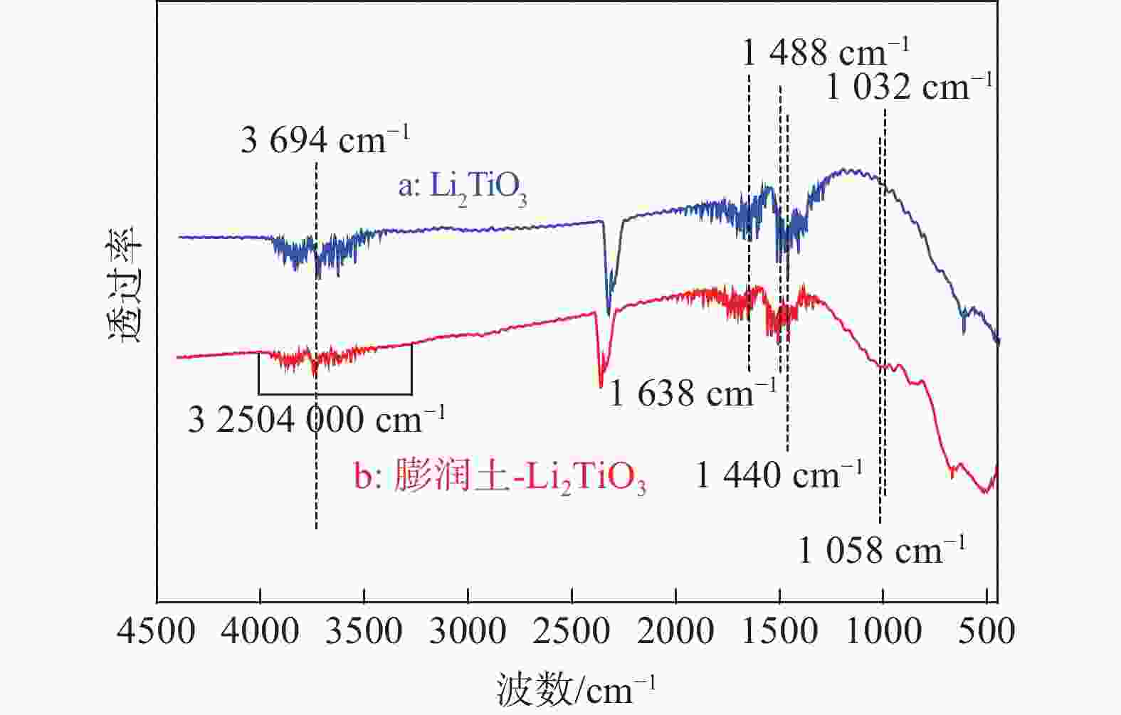图  7  Li2TiO3和膨润土-Li2TiO3(1.667 g/ L)的FTIR谱