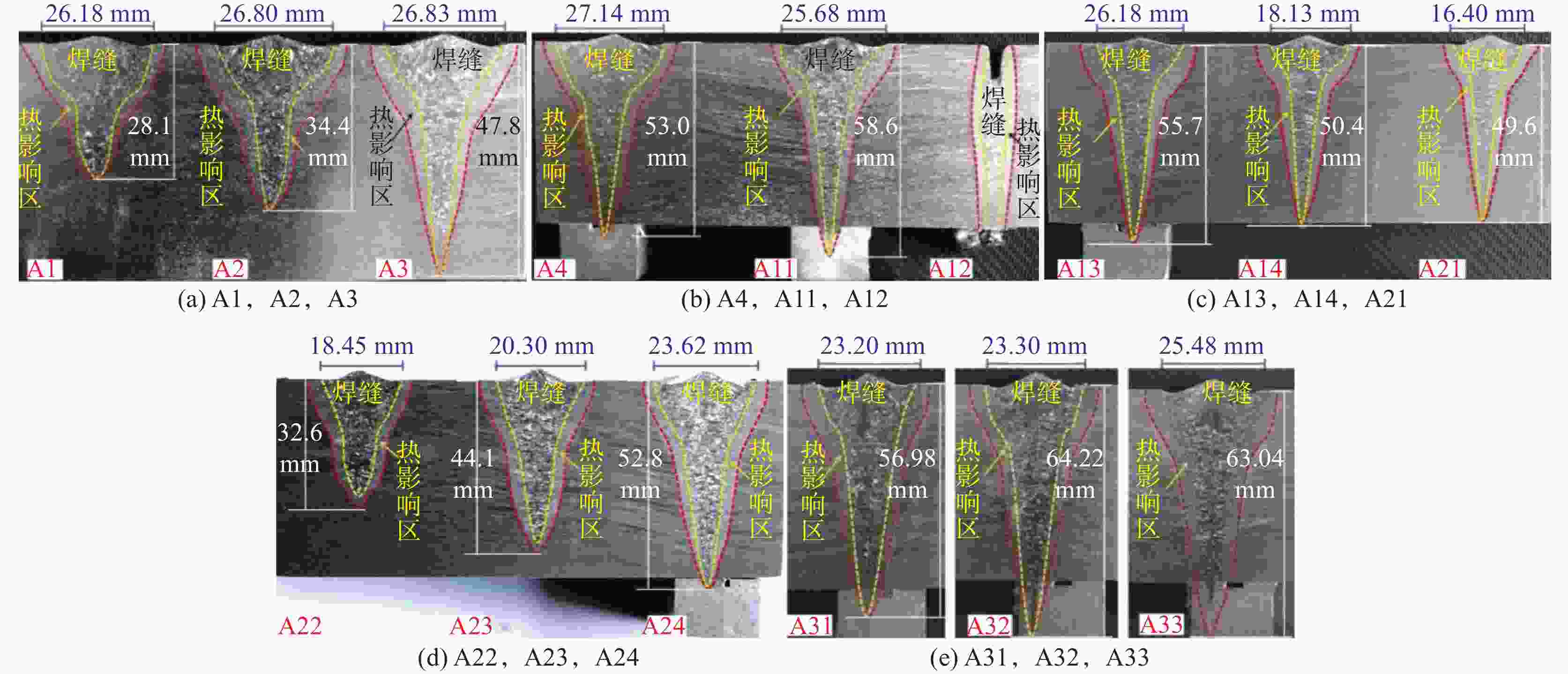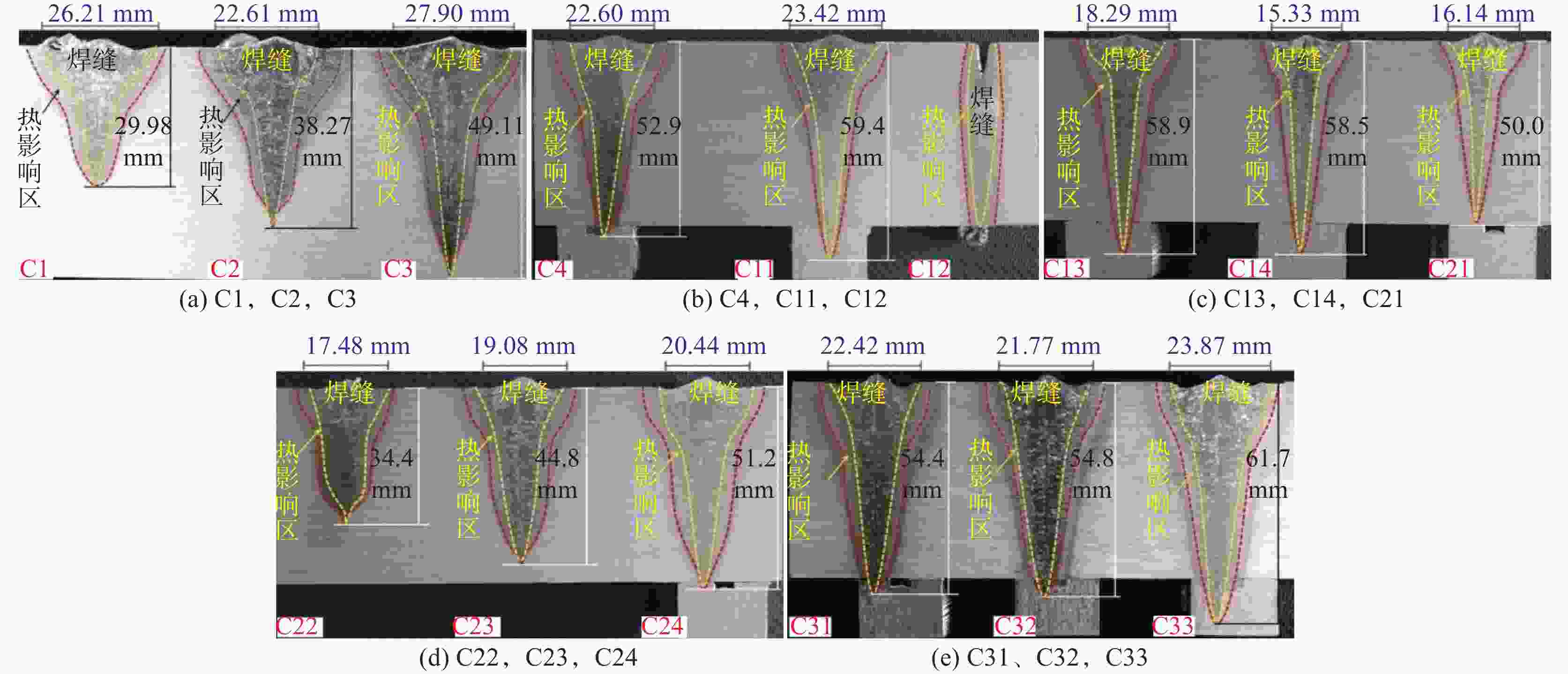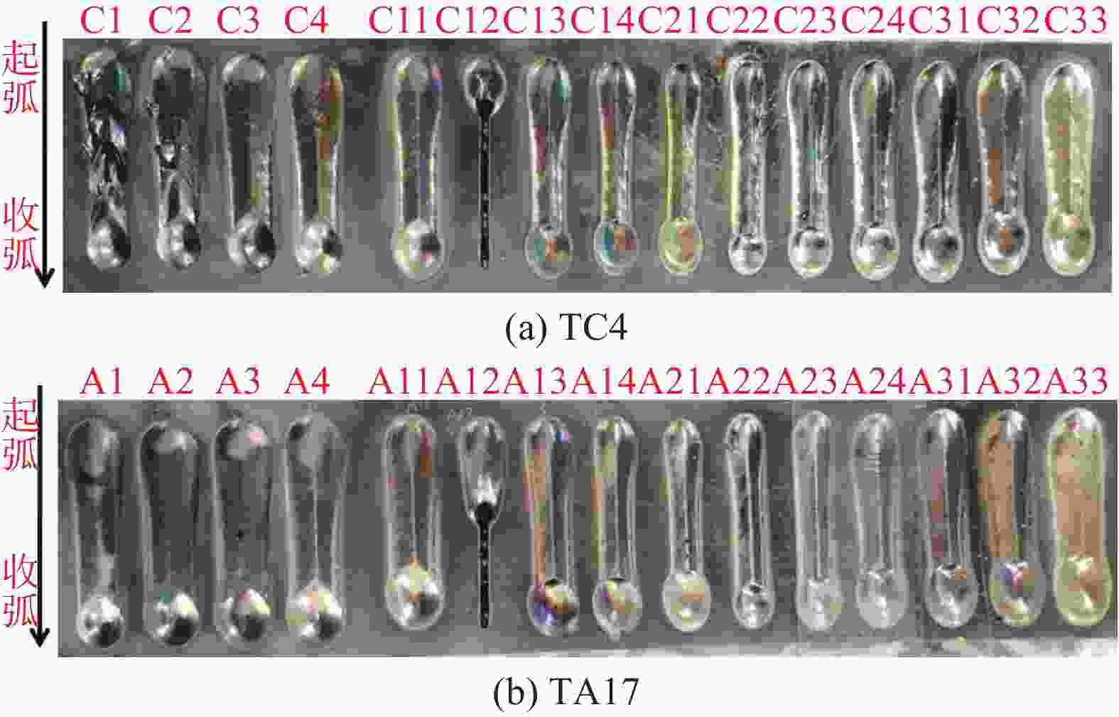 /mm焊缝成形系数 TC4 150 90 150 23.42 59.40 2.54 200 18.29 58.90 3.22 250 15.33 58.50 3.82 300 16.14 50.0 3.10 TA17 150 90 150 25.68 58.60 2.28 200 26.18 55.70 2.13 250 18.13 50.40 2.78 300 16.40 49.60 3.02 -