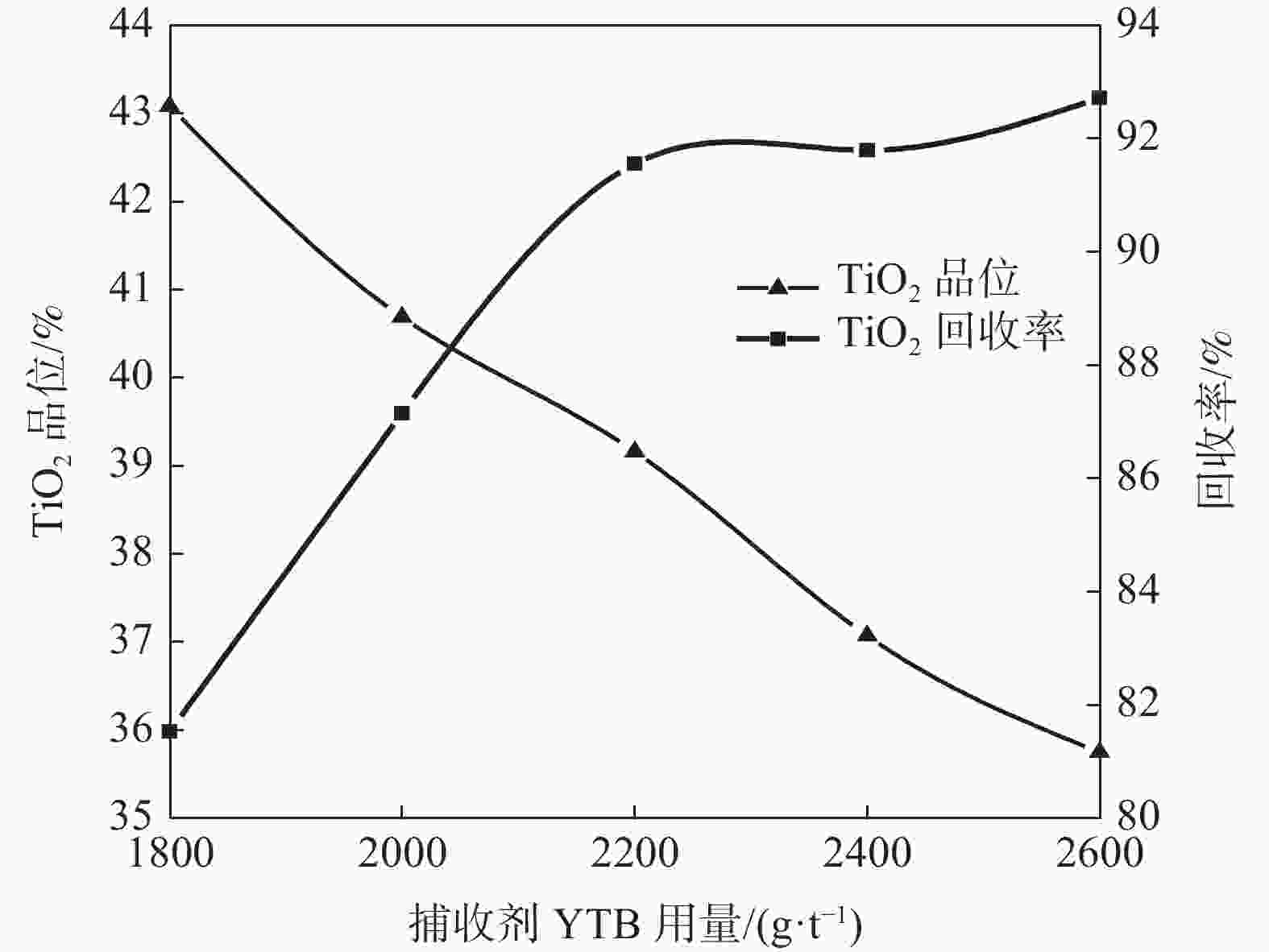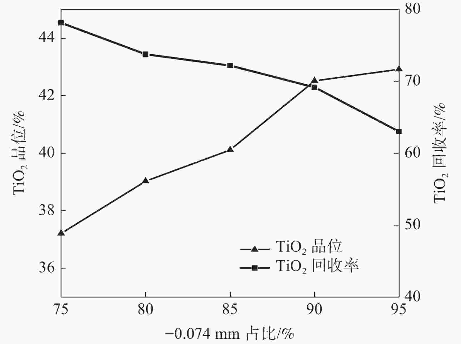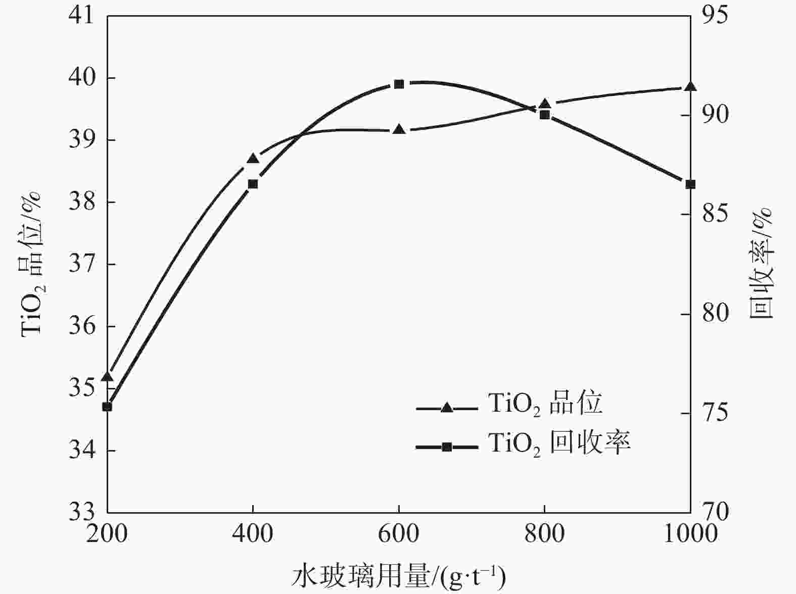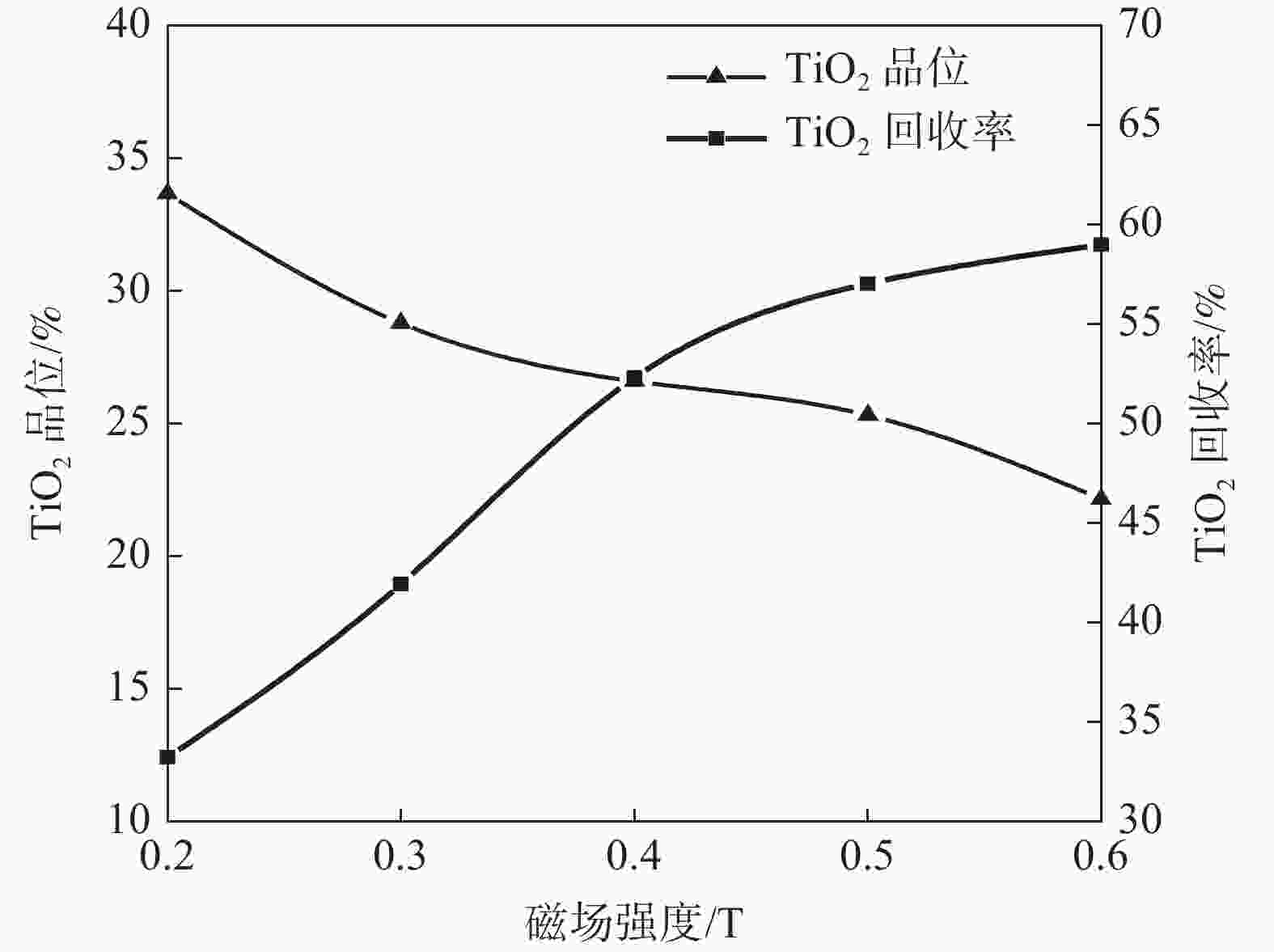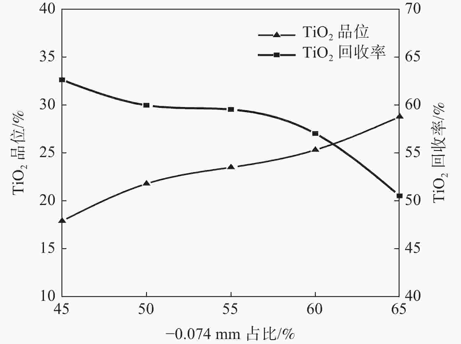 产品名称 产率/% TiO2品位/% TiO2回收率/% 精矿 8.74 47.41 50.32 尾矿 91.26 4.48 49.68 原矿 100.00 8.23 100.00 -