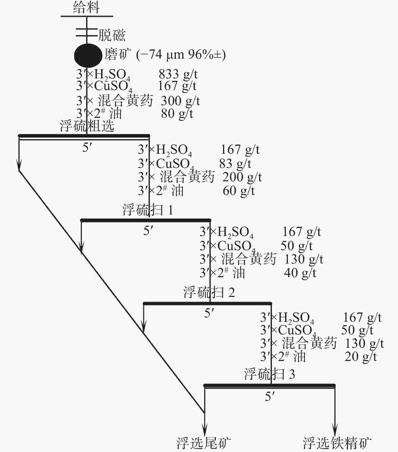 产品 产率/% TFe品位/% TFe回收率/% 粗粒铁精矿 31.06 59.14 32.61 粗料尾矿 4.70 19.51 1.63 细粒铁精矿 61.82 58.83 64.56 细粒尾矿 2.42 28.07 1.21 总精矿 92.88 58.93 97.17 总尾矿 7.12 22.42 2.83 合计 100.00 56.33 100.00 表 8 钒钛铁精矿单一浮选试验结果