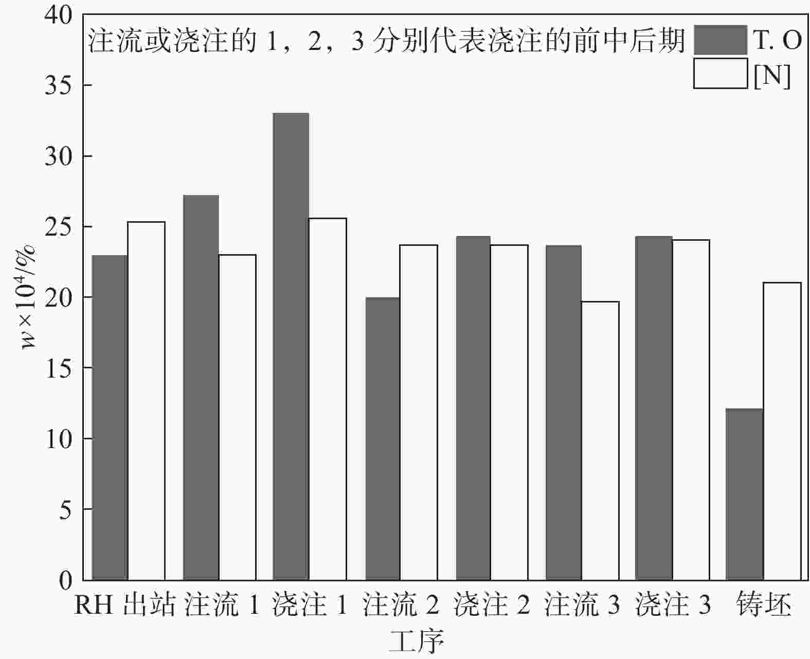 • 图  1  连铸过程钢中T.O、[N]含量的变化