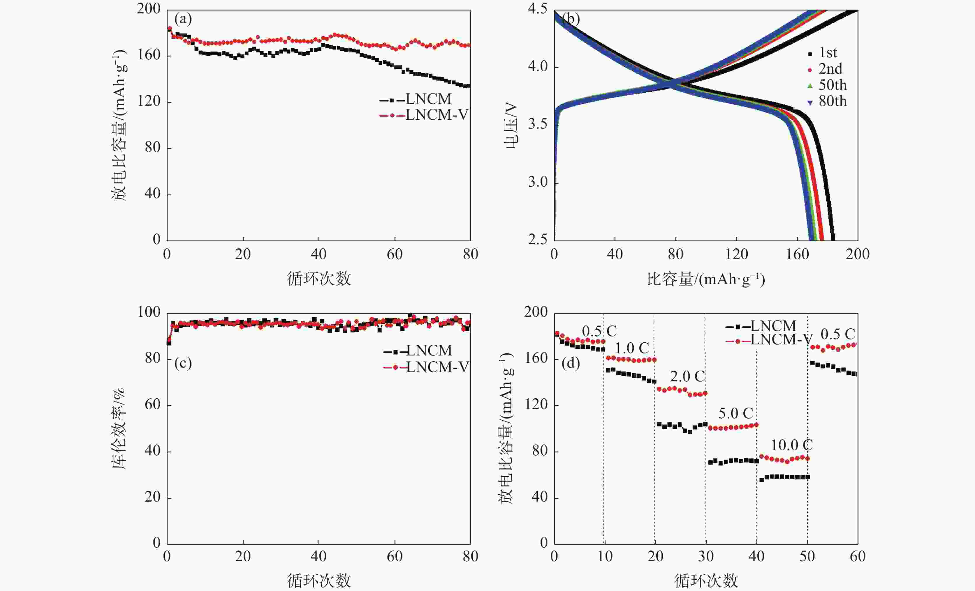 图 3 (a) LNCM和LNCM-V样品的循环性能,(b) LNCM-V样品的充放电曲线,(c) LNCM和LNCM-V样品的库仑效率,(d) LNCM和LNCM-V样品的倍率性能