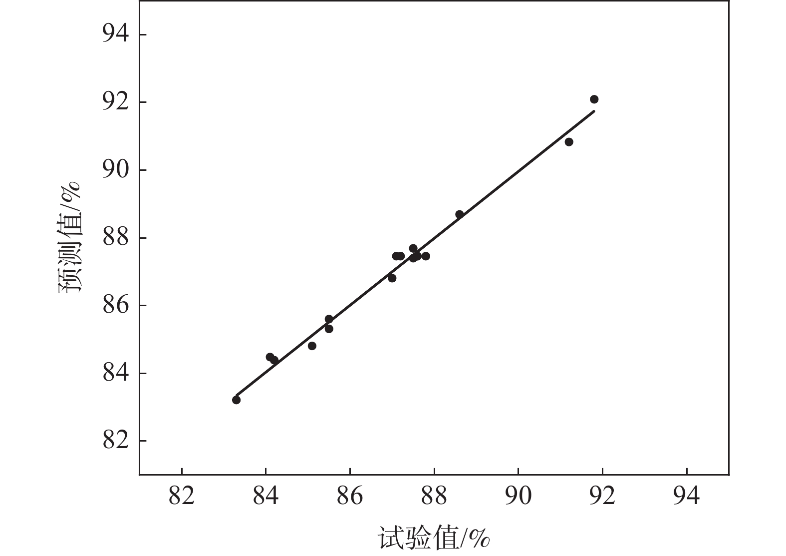 编号 因素 浸出率 /% A B C 1 −1.000 −1.000 0.000 84.1 2 1.000 −1.000 0.000 85.5 3 −1.000 1.000 0.000 87.5 4 1.000 1.000 0.000 91.2 5 −1.000 0.000 −1.000 83.3 6 1.000 0.000 −1.000 84.2 7 −1.000 0.000 1.000 85.5 8 1.000 0.000 1.000 88.6 9 0.000 −1.000 −1.000 85.1 10 0.000 1.000 −1.000 87.5 11 0.000 −1.000 1.000 87 12 0.000 1.000 1.000 91.8 13 0.000 0.000 0.000 87.2 14 0.000 0.000 0.000 87.6 15 0.000 0.000 0.000 87.6 16 0.000 0.000 0.000 87.8 17 0.000 0.000 0.000 87.1 表 4 方差分析