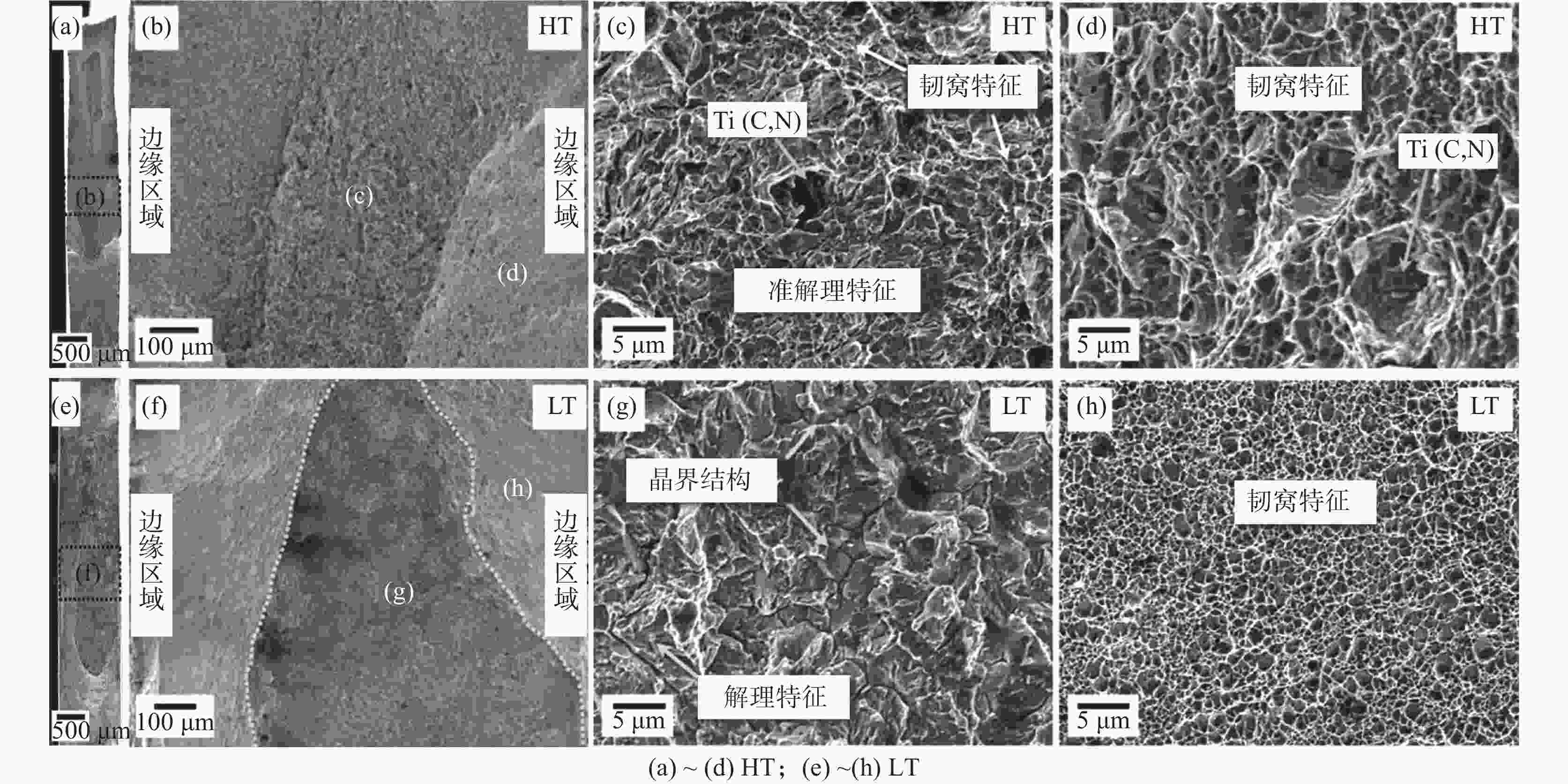摘要: 利用充氢拉伸及氢解吸试验手段对比研究了两种钛含量汽车用含Nb-Mo热成型钢的抗氢脆敏感性。试验结果表明:随着Nb-Mo热成型钢中的钛含量由0.015%增加至0.03%,其原奥氏体晶粒尺寸由5.40 μm降低至4.35 μm,晶界数量增多;新析出粗大的TiC颗粒,且(Nb,Ti)C、(Nb,Mo,Ti)C颗粒尺寸明显增大。虽然钛含量的增加会导致Nb-Mo热成型钢中析出粗大的Ti(C,N),可促进氢脆断裂行为的发生,但是粗大碳化物颗粒导致材料的氢解吸高温峰对应的氢脱附激活能由83.4 kJ/mol增加至105.9 kJ/mol,对氢原子的不可逆捕获能增加,有效减少了钢中的可扩散氢原子,且奥氏体晶界数量的增加使氢原子分布更为均匀,最终可提升Nb-Mo热成型钢的抗氢脆敏感性。Abstract: The hydrogen embrittlement resistance of two kinds of Nb-Mo hot forming steels with different Ti contents for automobile was studied by slow strain rate tensile test along with hydrogen charging and hydrogen desorption test in this paper. The results show that with increasing titanium content from 0.015% to 0.03%, the original austenite grain size of Nb-Mo hot forming steel decreases from 5.40 μm to 4.35 μm. Besides, the number of grain boundaries increased, and newly precipitated TiC particles are coarse, the size of (Nb, Ti) C, (Nb, Mo, Ti) C particles increases remarkably. The increase of Ti content leads to the precipitation of coarse Ti(C, N) in Nb-Mo hot forming steel, which promotes the occurrence of hydrogen embrittlement fracture. However, the activation energy of hydrogen desorption corresponding to the high temperature peak of hydrogen desorption is increased from 83.4 kJ/mol to 105.9 kJ/mol due to the coarse carbide particles. The energy of capturing irreversible hydrogen atom is increased, which can effectively reduce the amount of diffusible hydrogen atom in the steel. The increasing number of austenite grain boundaries can enable the hydrogen atom distribution more uniform, and finally improves the hydrogen embrittlement resistance of Nb-Mo hot forming steel.