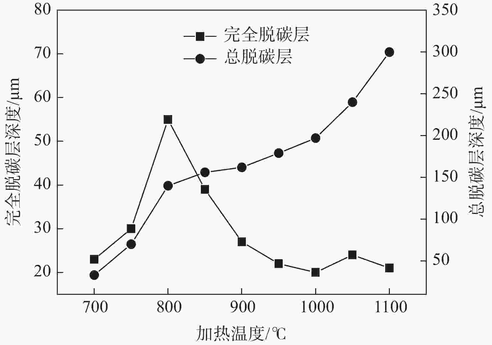 摘要: 研究了冷镦钢40CrMoV加热温度、加热时间及表面处理对脱碳层深度和组织形貌的影响,并分析了表面脱碳随温度变化的演变机理。结果表明,冷镦钢40CrMoV在700~1100 ℃加热时,其总脱碳层深度随温度的升高逐渐增大, 750~850 ℃为完全脱碳层生成的敏感温度区间,其在800 ℃时达到峰值;保温时间的延长使得脱碳层深度进一步加深;表面车削处理后使总脱碳层降低50%,完全脱碳层得到恶化。对冷镦钢40CrMoV在工业生产中表面脱碳的控制提出了建议。Abstract: The effects of heating temperature, heating time, and surface treatment on the depth of decarburized layer and microstructure of cold heading 40CrMoV steel were studied, and the evolution mechanism of surface decarburization with temperature was analyzed. The results show that when the cold heading 40CrMoV steel is heated at 700-1100 ℃, the total decarburized layer depth increases gradually with the increase in temperature. 750-850 ℃ is the sensitive temperature range for forming a complete decarburized layer, and it reaches its peak value at 800 ℃. With the extension of holding time, the depth of the decarburized layer is further deepened. Additionally, after surface turning treatment, the total decarburized layer is reduced by 50%, and the complete decarburized layer deteriorates. As a summary, the control of surface decarburization of cold heading 40CrMoV steel in industrial production is proposed.