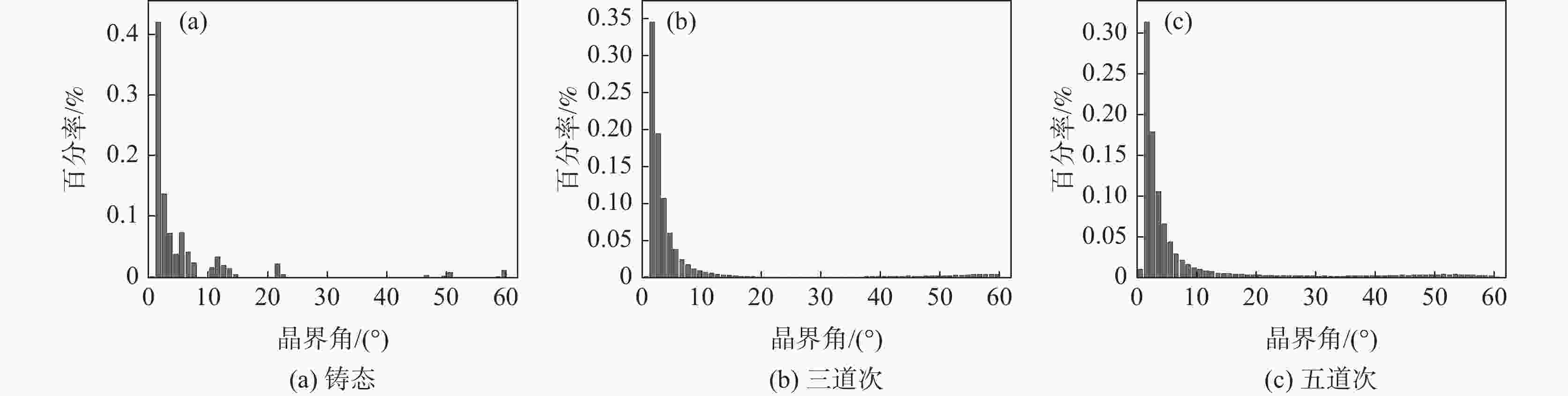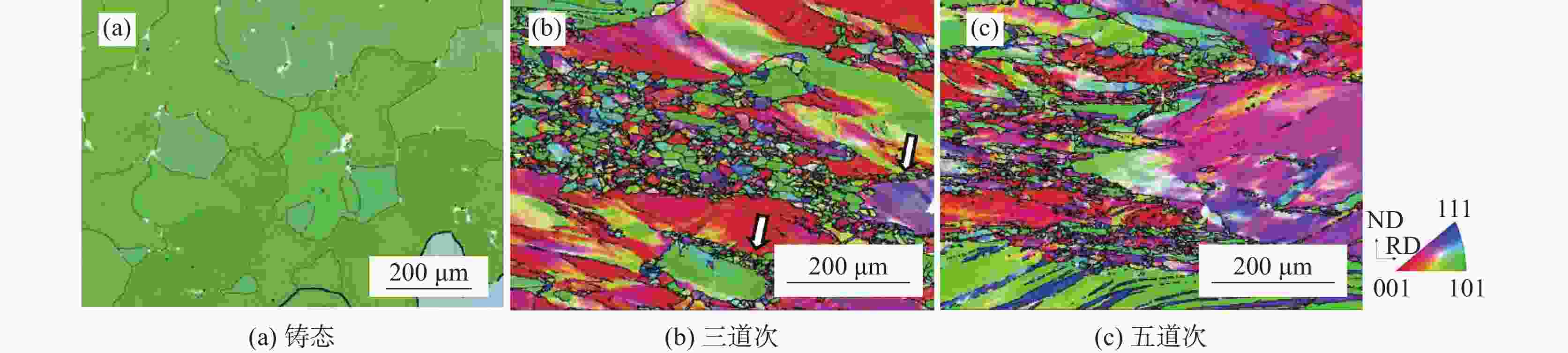 摘要: 对Mn18Cr18N电渣重熔钢进行三道次和五道次的轧制及固溶处理。借助电子背散射仪(EBSD)观察微观组织,发现随着轧制道次的增加,再结晶晶粒沿着晶界生长,呈现项链状分布,大角度晶界向小角度晶界逐渐迁移后趋于稳定,并出现大量剪切变形带,结果表明,较大的单道次压下量或较高的终轧温度有利于轧制后的Mn18Cr18N铸态奥氏体不锈钢再结晶。固溶处理后,发现晶粒细化并长大,退火孪晶增多,组织主要发生静态再结晶。对Mn18Cr18N钢进行力学性能测试,发现随着轧制道次的增加,抗拉强度由950 MPa增加至1 090 MPa,屈服强度增加,断后伸长率由43.46%降至29.55%,塑性降低;相应试样固溶处理后,抗拉强度由904 MPa降至870 MPa,屈服强度降低,断后伸长率由42%升高到48%,塑性提高,结果表明固溶处理改善了材料的组织和性能。