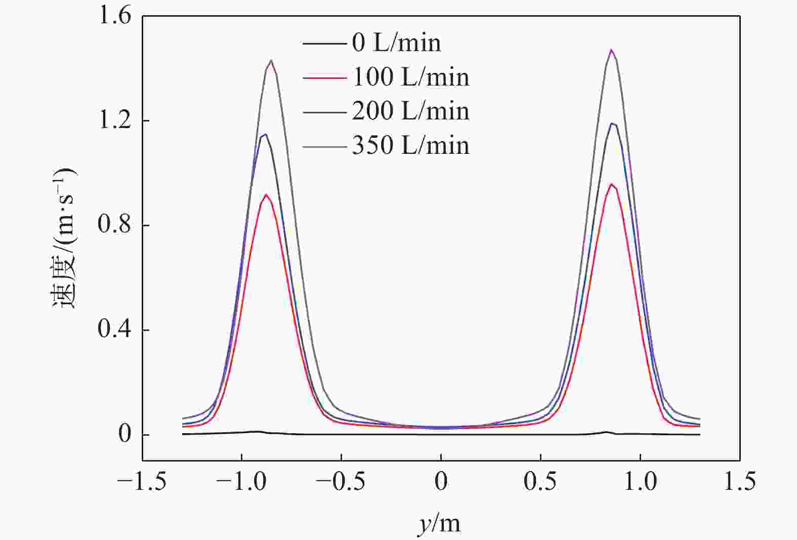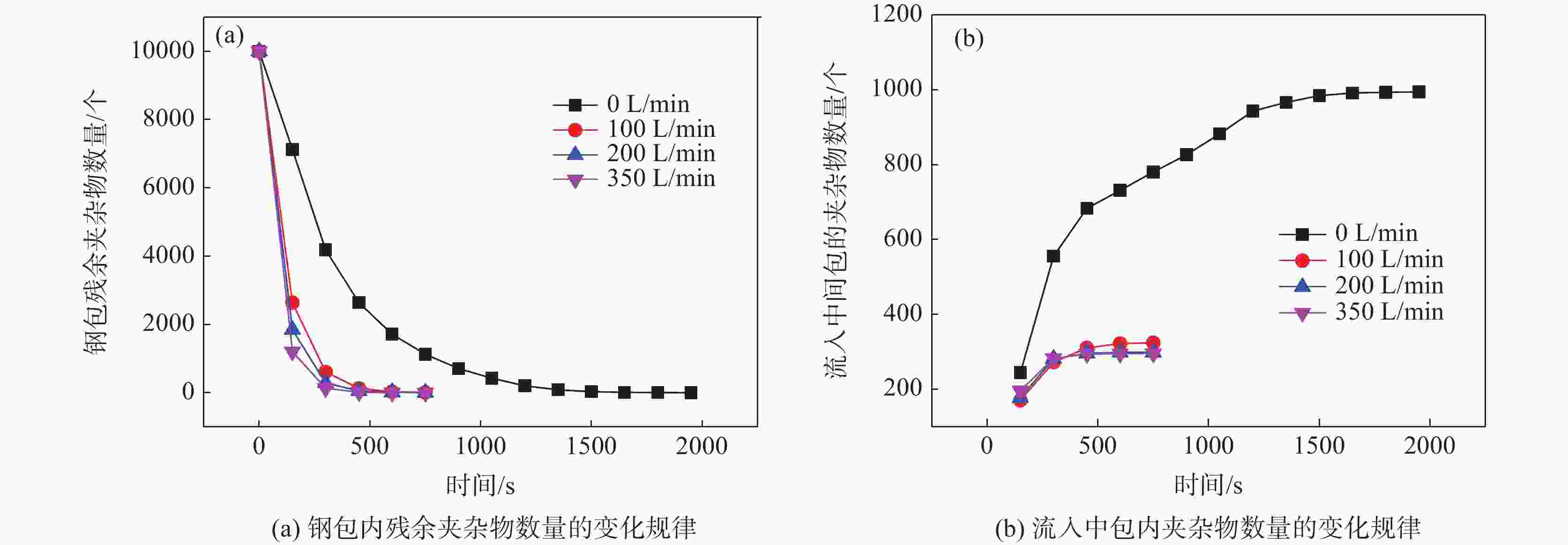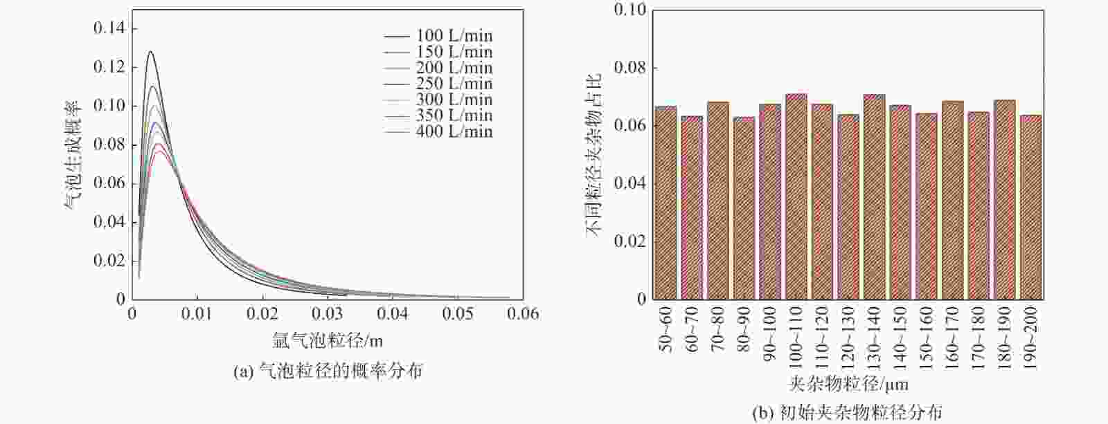 密度/(kg.m−3) 黏度/(Pa·s) 表面张力/(N·m−1) 拉速/(m·min−1) 吹氩流量/(L·min−1) 结晶器尺寸/m 空气 氩气 钢液 渣相 夹杂物 空气 钢液 渣相 钢/渣 钢/气 渣/气 1.225 1.6228 7020 3500 3500 1.79×10−5 0.0055 0.1 1.15 1.82 0.58 1.0 0, 100, 200, 350, 500 0.23×1.6 -