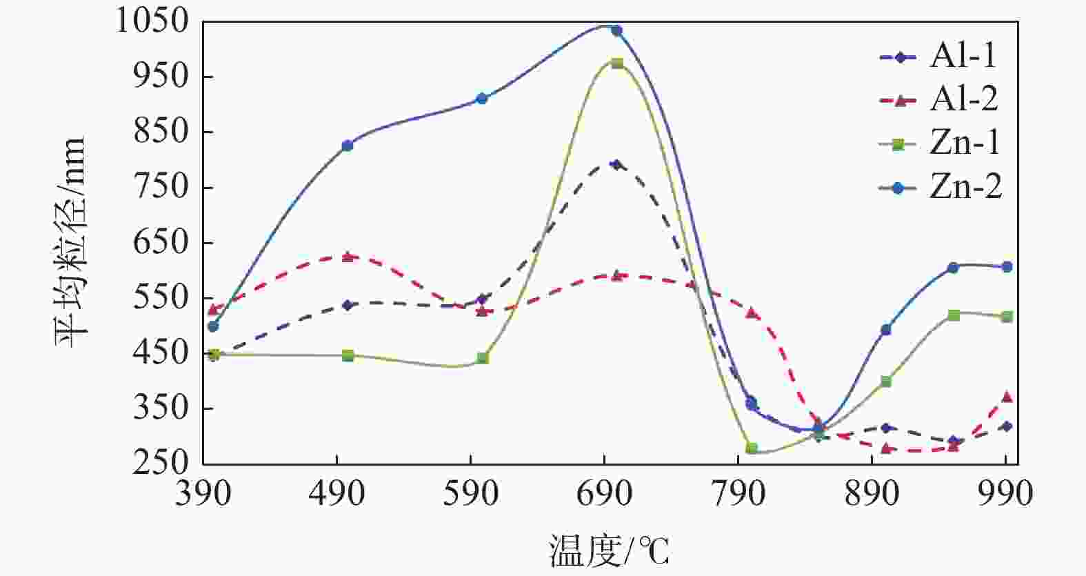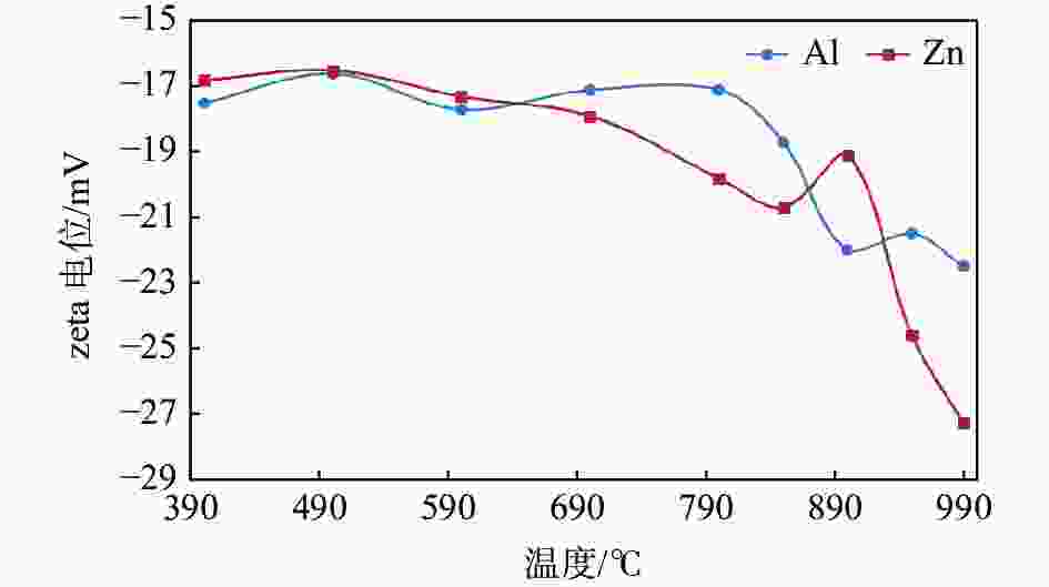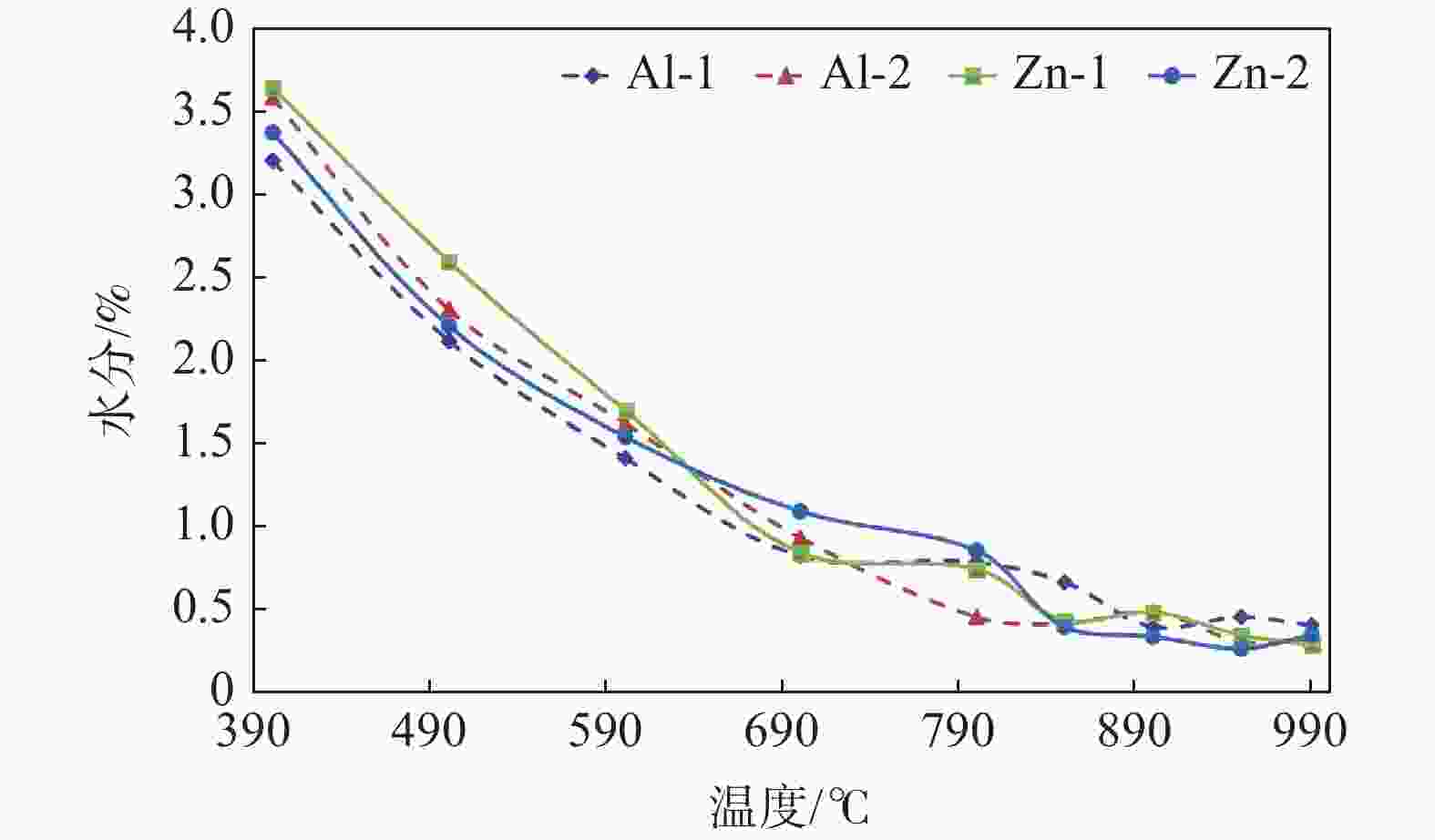 摘要: 分别选取攀枝花某钛白粉厂锌系盐处理和铝系盐处理后的窑前压榨料作为试验原料,开展从室温到990 ℃匀速升温的煅烧过程中二氧化钛粒子性质变化规律研究。首先,通过水分分析仪分析了煅烧过程中不同温度下的样品水分变化,表明800 ℃以上基本不存在结构脱水。进一步通过纳米激光粒度仪和SEM对粒子粒径和形貌进行考察,表明脱水过程中先形成边界清晰的团聚体,脱水完全后,团聚体逐渐解体,一次粒子逐渐长大,边界逐渐清晰。当金红石含量达到98%以上时,TiO2粒子SEM平均粒径随着温度升高而增大的同时,粒径标准差也随之增大。脱硫对TiO2粒子表面zeta电位影响较脱水更加明显,且金红石含量的变化对粒子表面zeta电位变化影响显著。Abstract: In this paper, the titanium dioxide filter cakes after zinc or aluminum salt treatment from a titanium dioxide factory in Panzhihua were selected as test materials to study the properties of titanium dioxide particles during the calcination process from room temperature to 990 ℃ under the condition of constant heating rate. Firstly, the moisture changes of the samples at different temperatures during calcination were analyzed by moisture analyzer. The results showed that there was basically no structural dehydration above 800 ℃. The morphology and particle size of the particles were further investigated by ZS90 and SEM, which showed that the aggregates with clear boundaries were formed first in the process of dehydration. After complete dehydration, the aggregates gradually disintegrated, and the primary particles gradually grew and the boundaries became clear. When the rutile content reaches more than 98%, the SEM average particle size of TiO2 particles increases with the increase of temperature, and the standard deviation of particle size also increases. The effect of desulfurization on the zeta potential on the surface of TiO2 particles is more obvious than that of dehydration, and the change of rutile content has a significant effect on the change of the zeta potential on the surface of the particles.