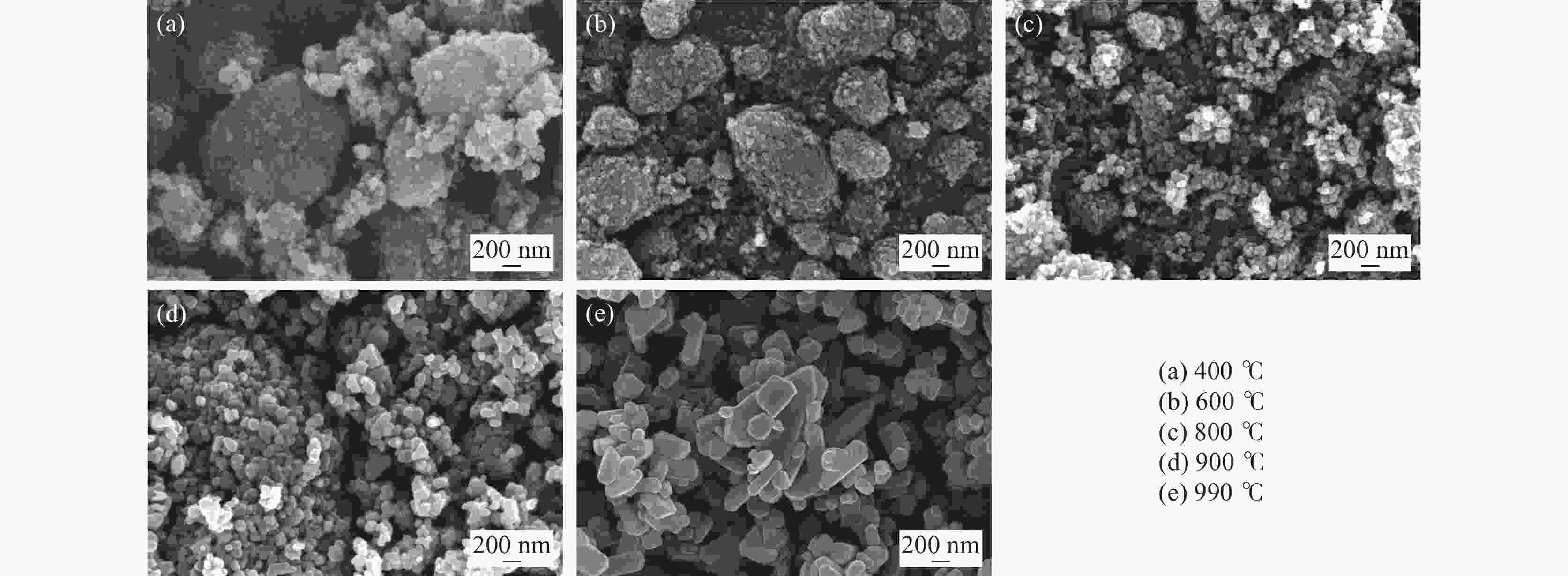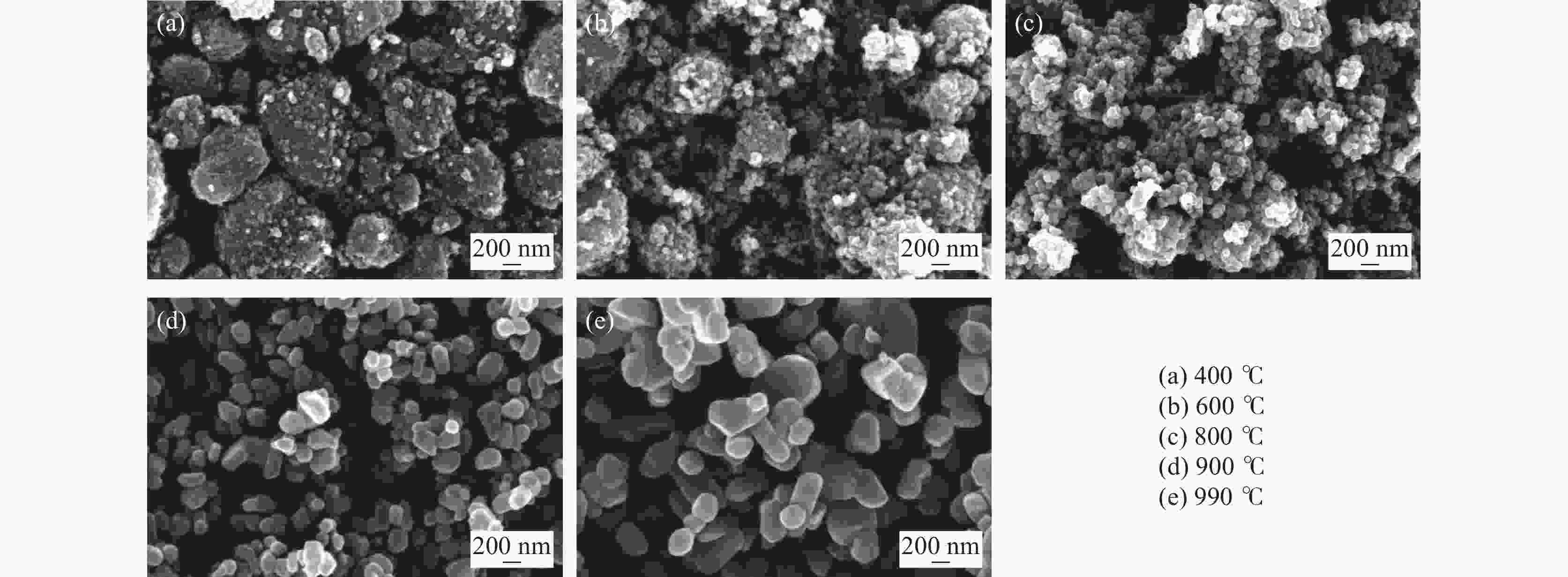 温度/℃ 锐钛型 金红石型 w(A-TiO2)/% 晶粒尺寸/nm a = b c w(R-TiO2)/% 晶粒尺寸/nm a = b c 400 95.2 7 3.787782 9.512359 4.8 600 94.7 15 3.789909 9.516574 5.3 800 83.1 53 3.784297 9.511685 16.9 900 0.7 99.3 >100 4.593194 2.958295 990 0.4 99.6 >100 4.593047 2.958407 -