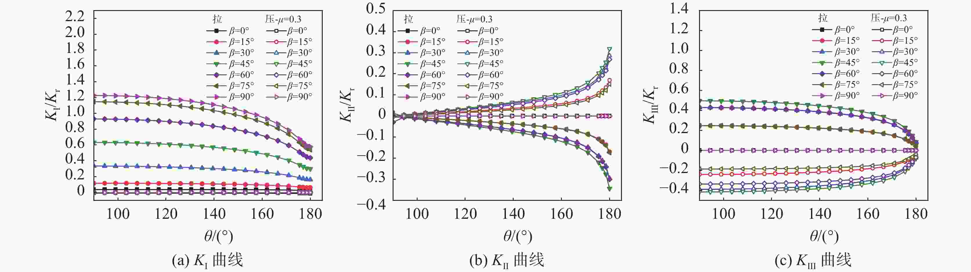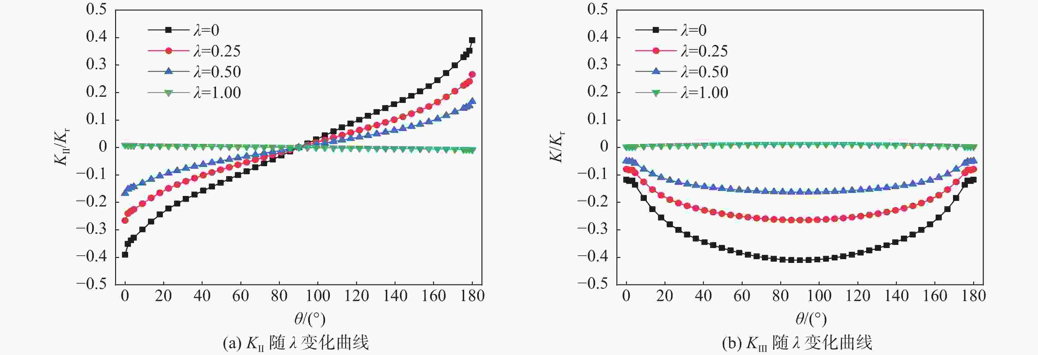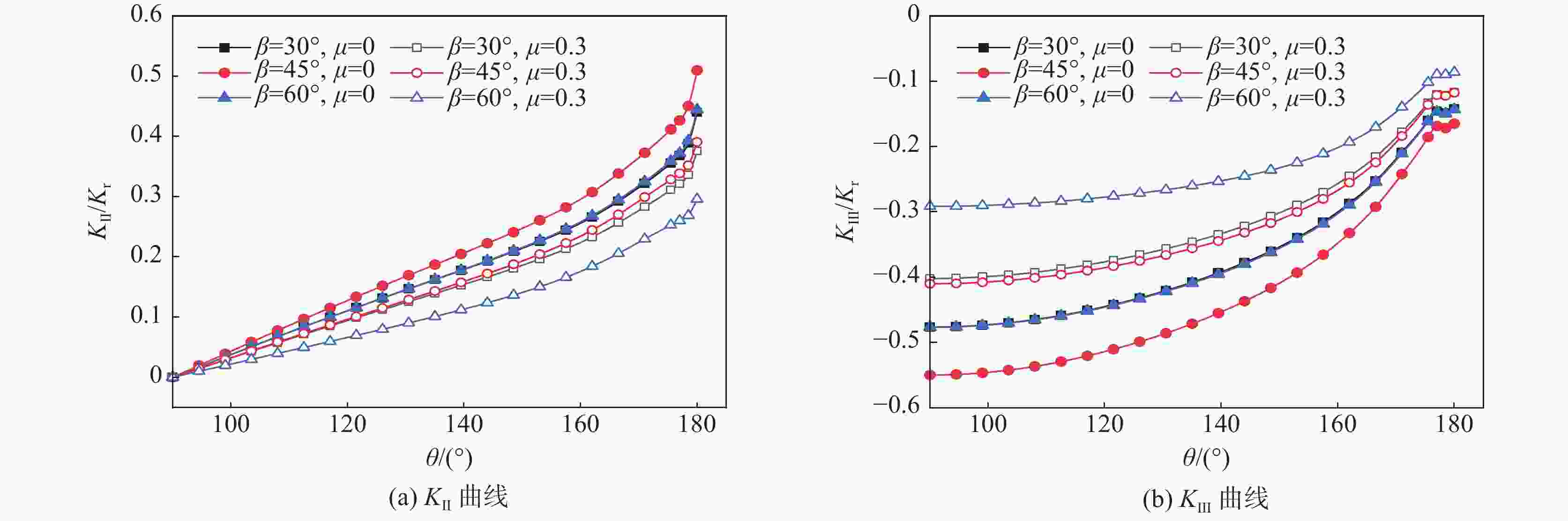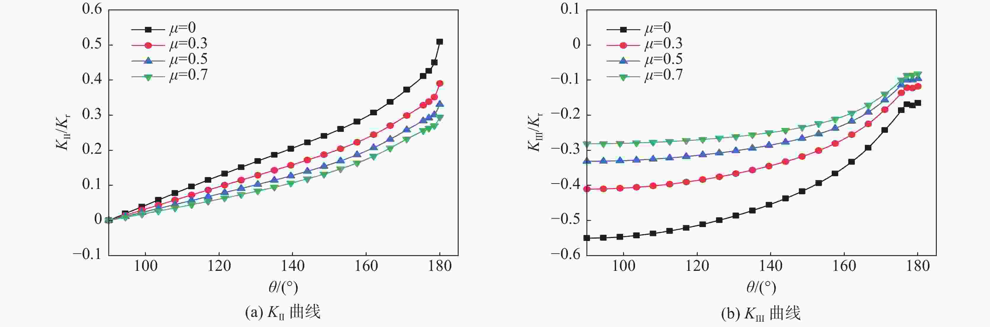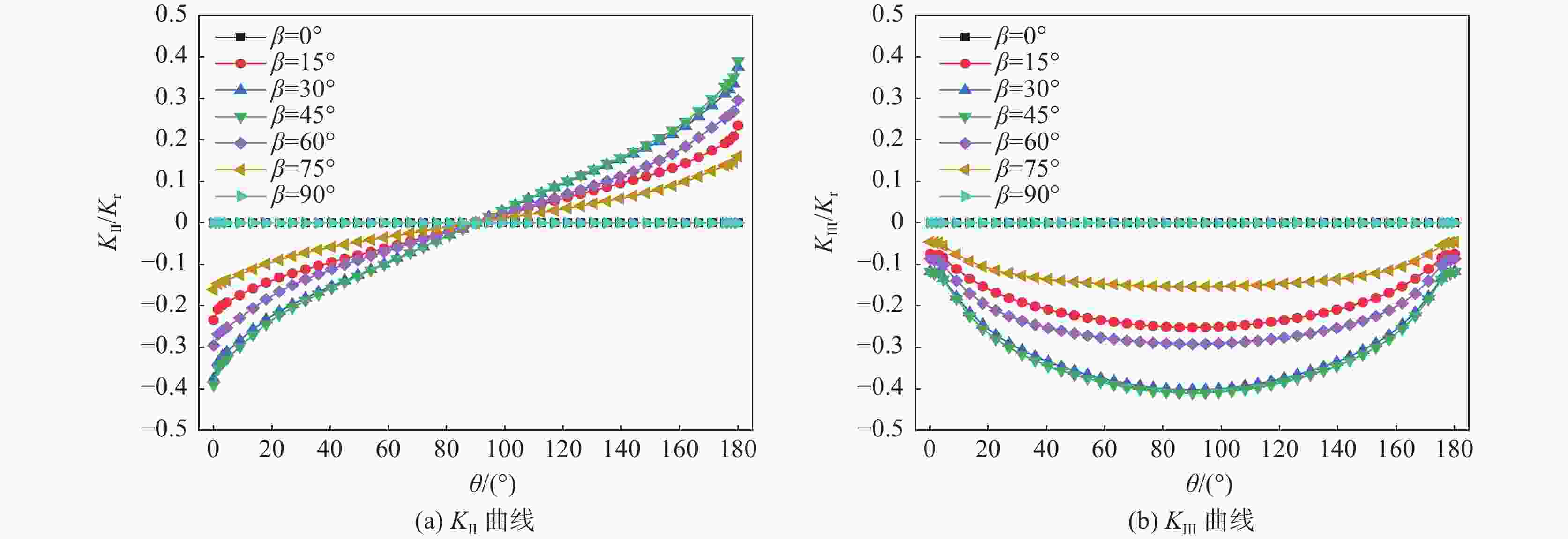 裂尖周向网格数 KⅡ/(MPa·mm1/2) KⅢ/(MPa·mm1/2) 90 −30.15 −124.46 120 −29.43 −121.16 150 −29.14 −119.88 180 −29.65 −120.74 注:KⅡ最大相对误差3.47%,KⅢ最大相对误差3.82%. 表 3 裂纹表面点处KⅡ对比