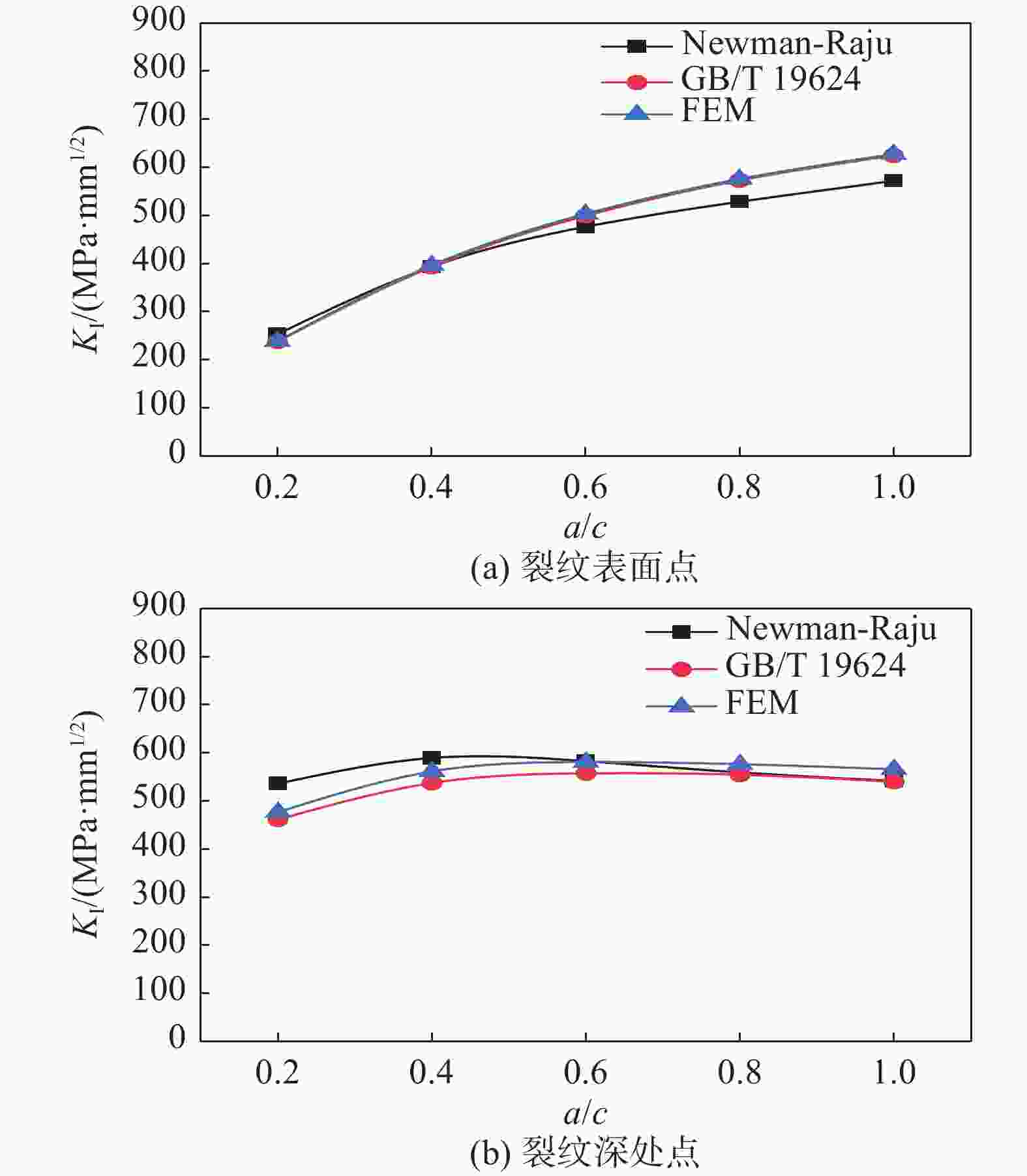 a/t KⅢ(a/c=0.2) KⅢ(a/c=0.4) KⅢ(a/c=0.6) KⅢ(a/c=0.8) 近似解 FEM解 近似解 FEM解 近似解 FEM解 近似解 FEM解 0.2 −161.54 −167.24 −203.96 −206.79 −220.27 −218.38 −224.1 −218.28 0.4 −169.45 −173.9 −209.62 −210.68 −223.97 −220.99 −226.30 −219.86 0.6 −187.01 −184 −221.20 −218.56 −231.25 −226.75 −230.46 −224.22 0.8 −213.32 −211.61 −236.21 −239.74 −239.91 −242.18 −234.98 −236.22 注:a/c为0.2、0.4、0.6、0.8时,KⅢ平均相对误差依次为2.14%、1.15%、1.27%、2.18%。 -
