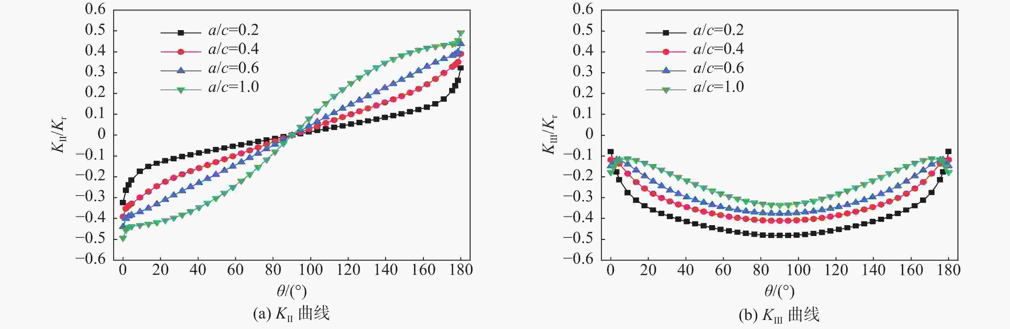 最小网格尺寸/mm KⅡ/(MPa·mm1/2) KⅢ/(MPa·mm1/2) 0.025 −29.25 −120.20 0.05 −29.30 −120.26 0.1 −29.43 −121.16 0.15 −29.44 −121.44 0.2 −29.43 −121.13 注:KⅡ最大相对误差0.06%,KⅢ最大相对误差1.03%. 表 2 裂纹前缘裂尖周向网格敏感性分析(a/c=0.2,a/t=0.4,β=45°,θ=30°)
