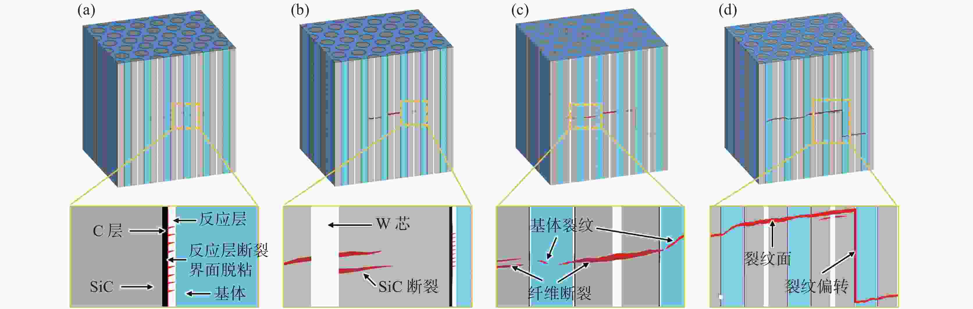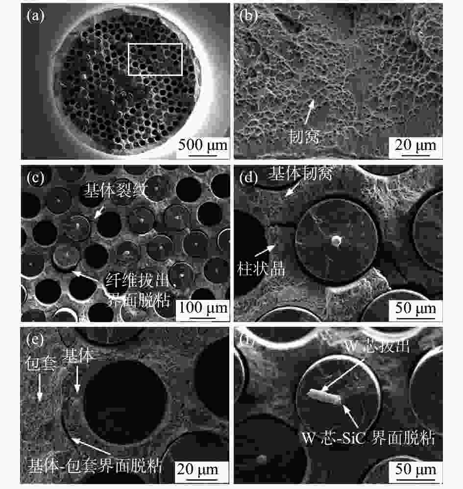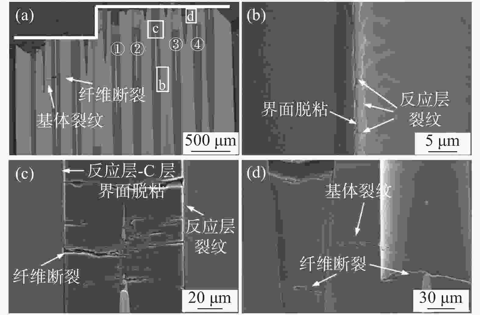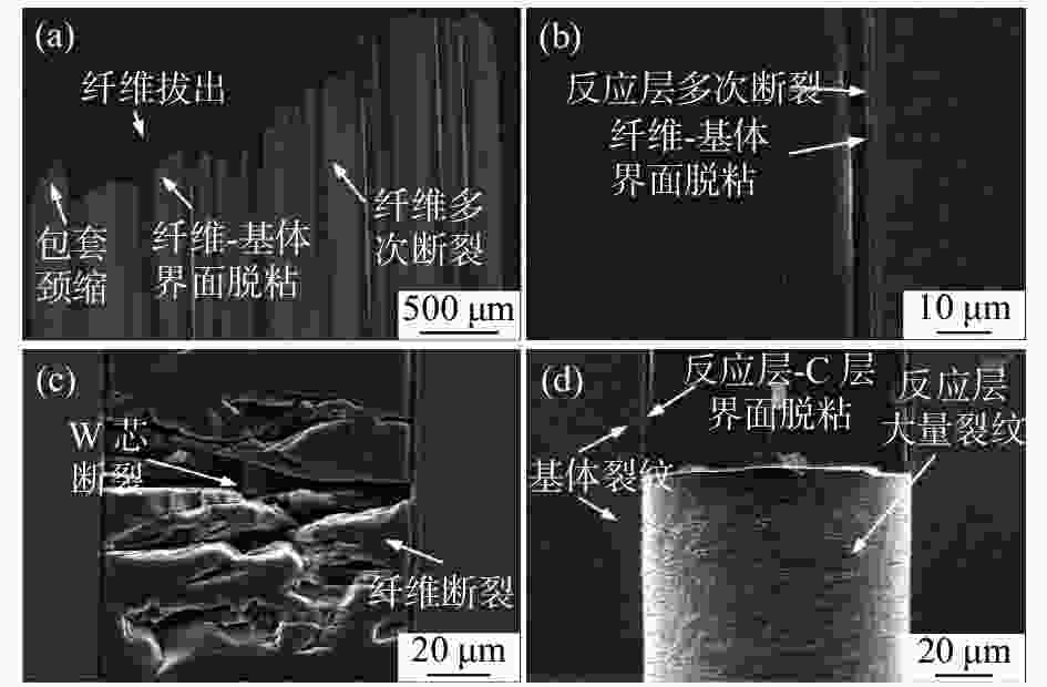 摘要: 采用磁控溅射先驱丝法和热等静压工艺制备SiCf/TC11复合材料,研究了SiCf/TC11复合材料室温和500 ℃拉伸性能及断裂机制。结果表明,SiCf/TC11复合材料室温和500 ℃抗拉强度分别为1 530 MPa和1 553 MPa,明显高于基体TC11钛合金,与TC11钛合金相比,抗拉强度分别提升了~57%和~133%,纤维增强效果显著。通过观察SiCf/TC11复合材料室温、500 ℃拉伸断口和纵剖面断裂特征,指出了室温和500 ℃拉伸断裂机制主要包括反应层多次断裂、纤维一次断裂、纤维多次断裂、纤维-基体界面脱粘、纤维拔出、W芯-SiC界面脱粘、基体断裂、包套断裂等,揭示了SiCf/TC11复合材料室温和500 ℃拉伸载荷下多组元失效断裂过程。Abstract: In this paper, SiCf/TC11 composites were prepared by magnetron sputtering precursor wire method and hot isostatic pressing. Tensile properties and fracture mechanism of SiCf/TC11 composites at room temperature and 500 ℃ were studied. The experimental results show that the tensile strength of SiCf/TC11 composite at room temperature and 500 ℃ are 1 530 MPa and 1 553 MPa, respectively, which are significantly higher than that of the matrix TC11 titanium alloy. Compared with TC11 titanium alloy, the tensile strength increases by ~57% and ~133%, respectively, and the fiber reinforcement effect is remarkable. By observing the fracture characteristics and longitudinal section of SiCf/TC11 composites, it is proposed that the tensile fracture mechanism at room temperature and 500 ℃ mainly includes reaction layer multiple fracture, fiber single fracture, fiber multiple fracture, fiber-matrix interface debonding, fiber pulling out, W core -SiC interface debonding, matrix fracture, sheath fracture, etc. In this paper, the multi-component fracture process of SiCf/TC11 composites under tensile loading at room temperature and 500 ℃ is revealed.