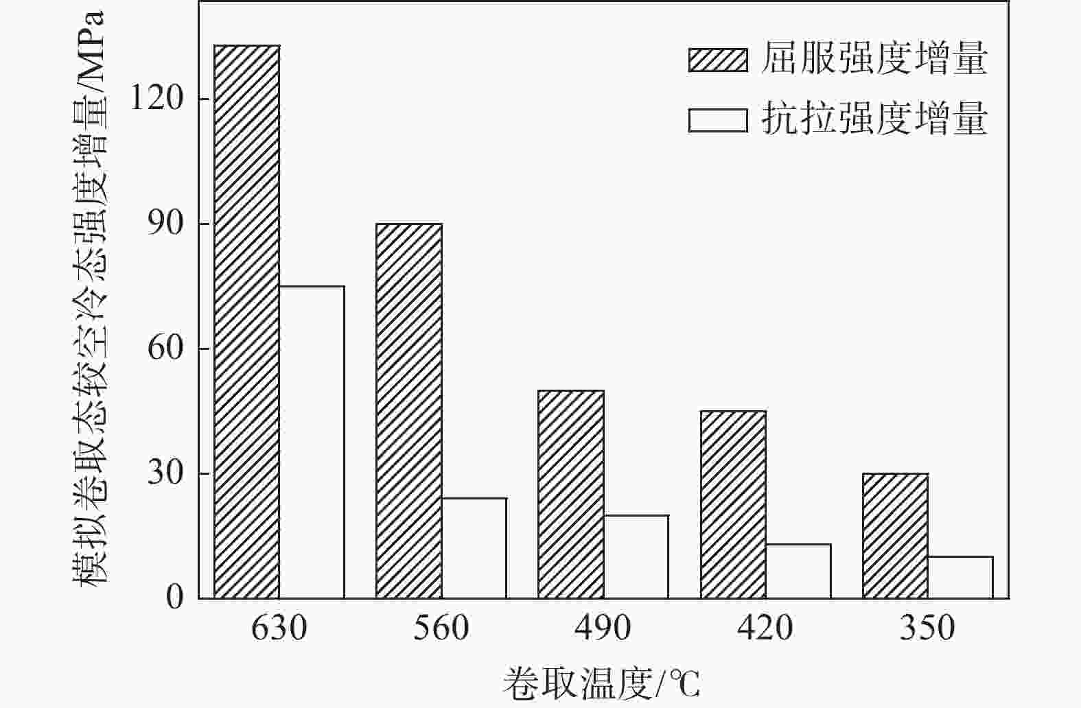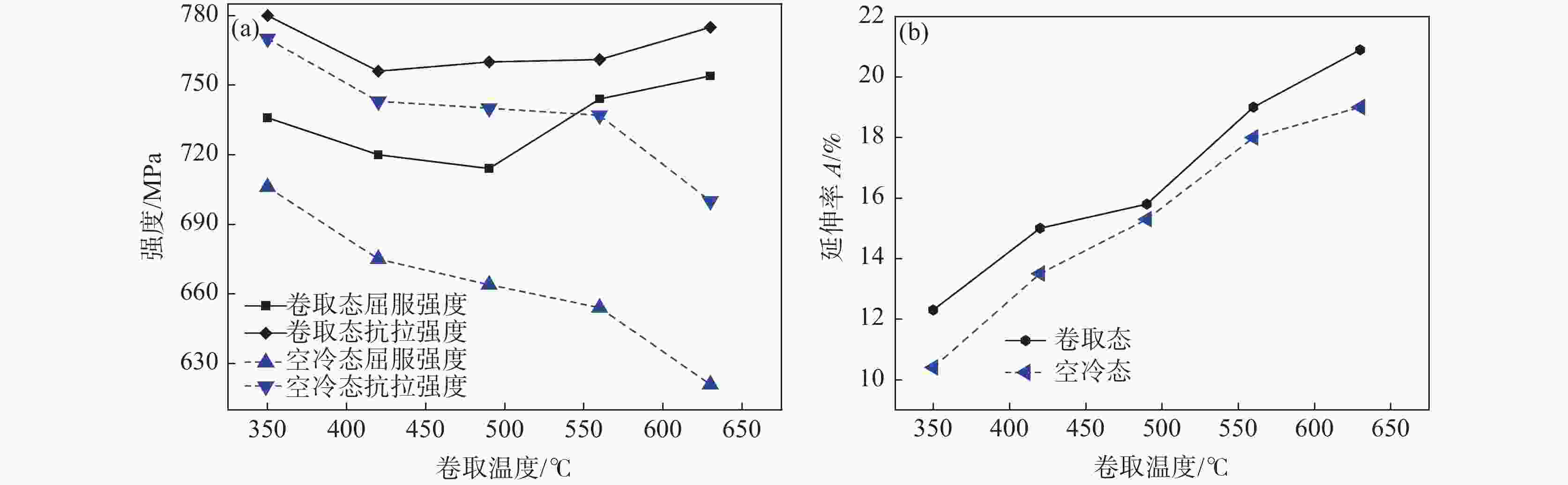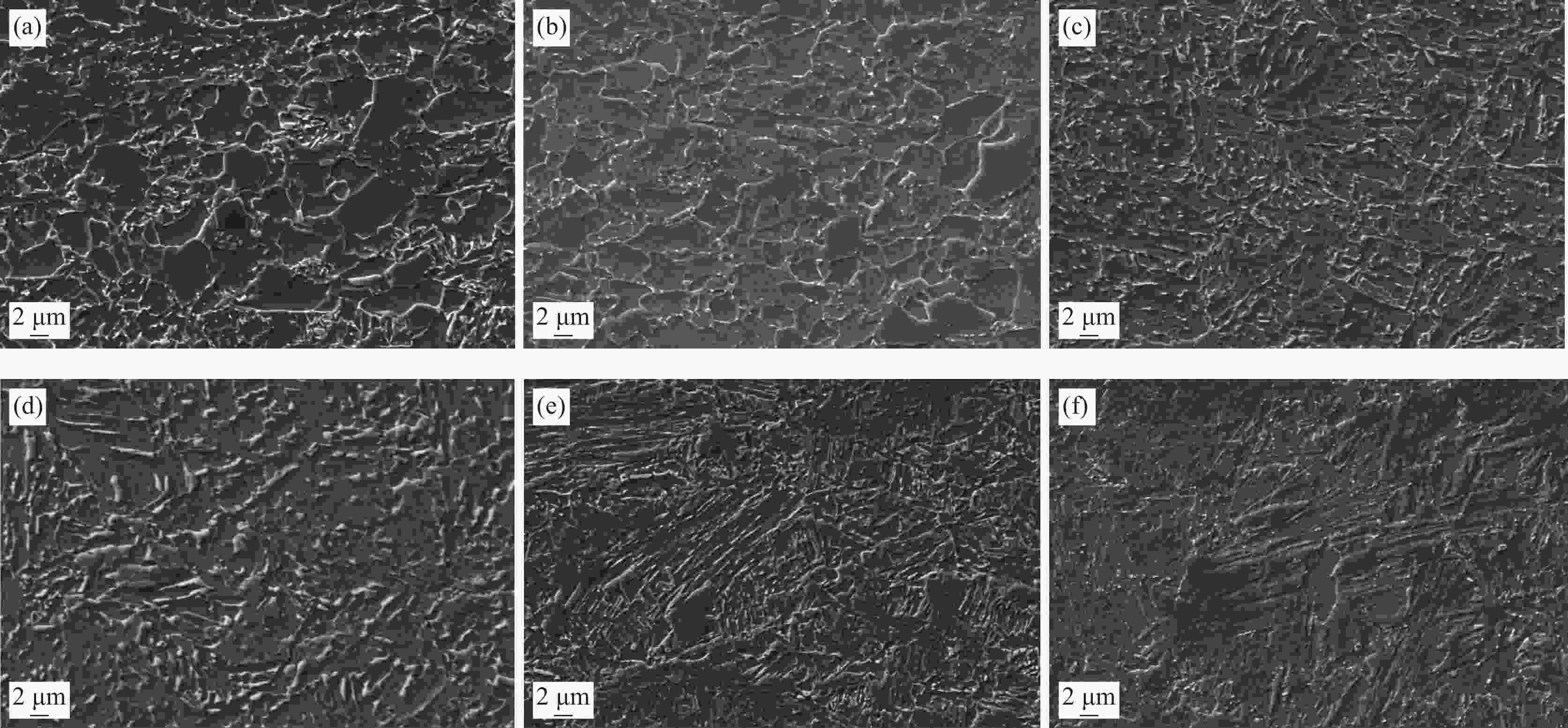 摘要: 利用试验轧机和热处理炉进行了低碳Ti-Nb微合金钢的模拟轧制和卷取试验,研究卷取温度对微观组织和力学性能的影响。结果表明,随着卷取温度的降低,钢的相变过程逐步由扩散型相变过渡到切变型相变,微观组织由等轴铁素体依次转变为多边形铁素体、粒状贝氏体、板条贝氏体;由于析出强化和相变强化的综合作用,卷取态试验钢强度先降低后升高,延伸率持续降低;卷取过程微合金碳氮化物的析出强化导致卷取态试验钢强度高于空冷态试验钢,且随着卷取温度的降低,卷取态试验钢较空冷态试验钢强度的增量逐步降低;Ti-Nb微合金钢的卷取温度设定在560~630 ℃时,钢屈服强度744~754 MPa,延伸率19%~20.9%,可获得良好的综合性能。Abstract: The effect of coiling temperature on the microstructure and mechanical property of a Ti-Nb microalloyed steel was studied by simulated hot rolling and coiling tests conducted on a pilot hot rolling mill and heat treatment furnace. The results show that the phase transformation process of steel gradually changes from diffusion-type phase transformation to shear-type phase transformation, and the microstructure changes from equiaxed ferritic grain to polygonal ferrite, granular bainite, and lath bainite with the coiling temperature decreases. In addition, the strength first decreases and then increases, while the elongation decreases due to precipitation strengthening and phase transformation strengthening. The strength of the steel at the coiling state is higher than that of the steel after air-cooled due to the precipitation and strengthening of micro-alloy carbonitride during the coiling. With the decrease in coiling temperature, the strength increment of steel at the coiling state gradually decreases compared with the steel after air-cooled. The yield strength is 744~754 MPa, and the elongation is 19%~20.9%, which can obtain good comprehensive properties when the coiling temperature of Ti-Nb microalloyed steel is set at 560~630 ℃.