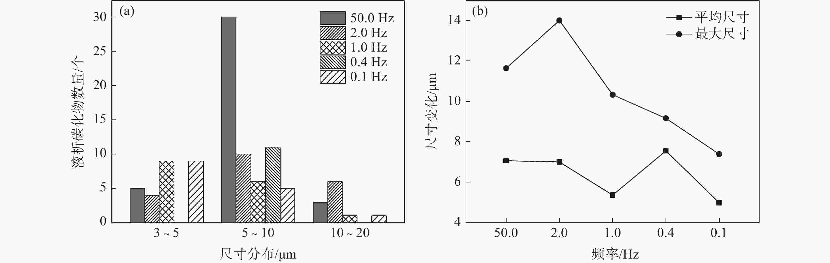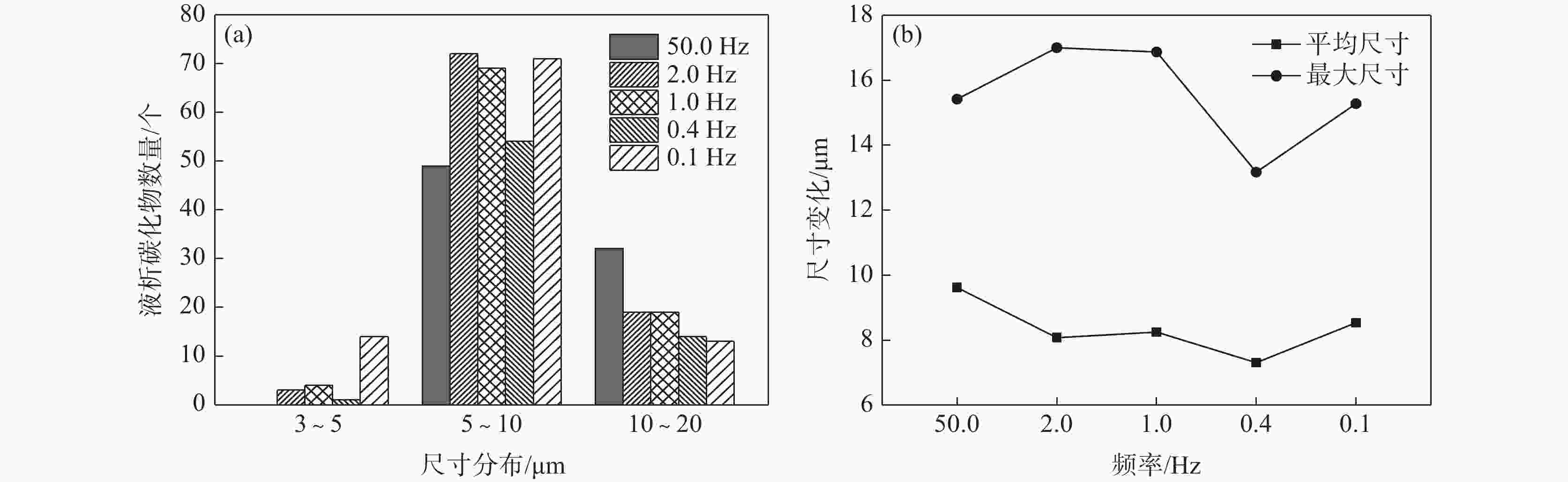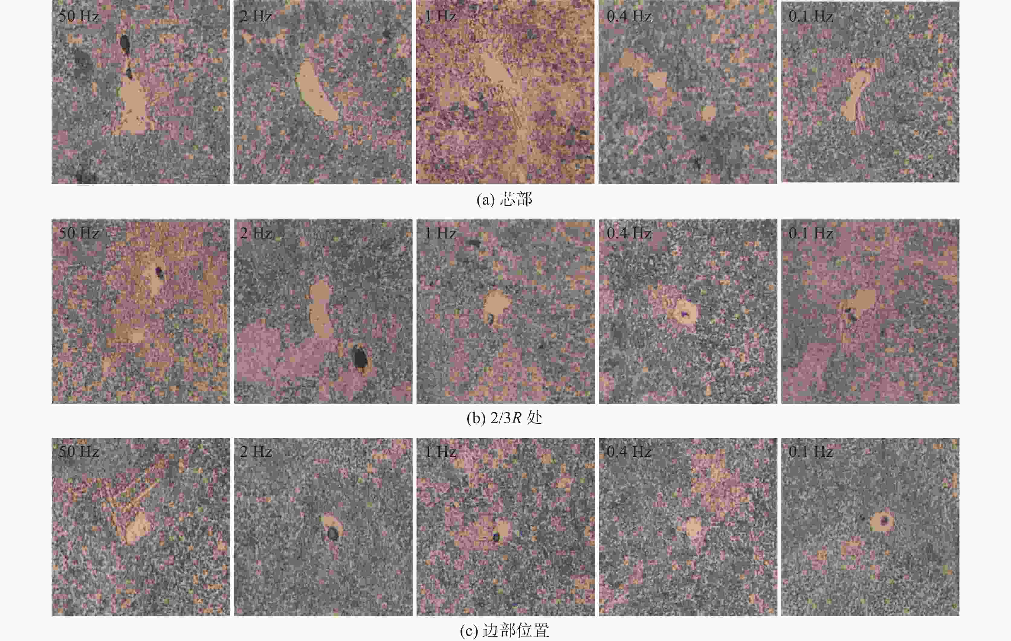 频率/Hz 取样位置 最小尺寸/μm 最大尺寸/μm 平均尺寸/μm 50 边部 4.26 11.64 7.06 2/3R处 4.53 20.58 9.08 芯部 5.13 15.42 9.62 2 边部 5.12 14.01 7.00 2/3R处 4.91 16.29 8.34 芯部 3.02 17.00 8.08 1 边部 3.64 10.33 5.36 2/3R处 4.66 18.68 8.45 芯部 3.92 16.87 8.25 0.4 边部 5.72 9.16 7.55 2/3R处 4.30 12.61 7.35 芯部 4.92 13.17 7.31 0.1 边部 3.64 7.39 4.98 2/3R处 4.27 22.67 7.65 芯部 3.45 15.28 8.54 -