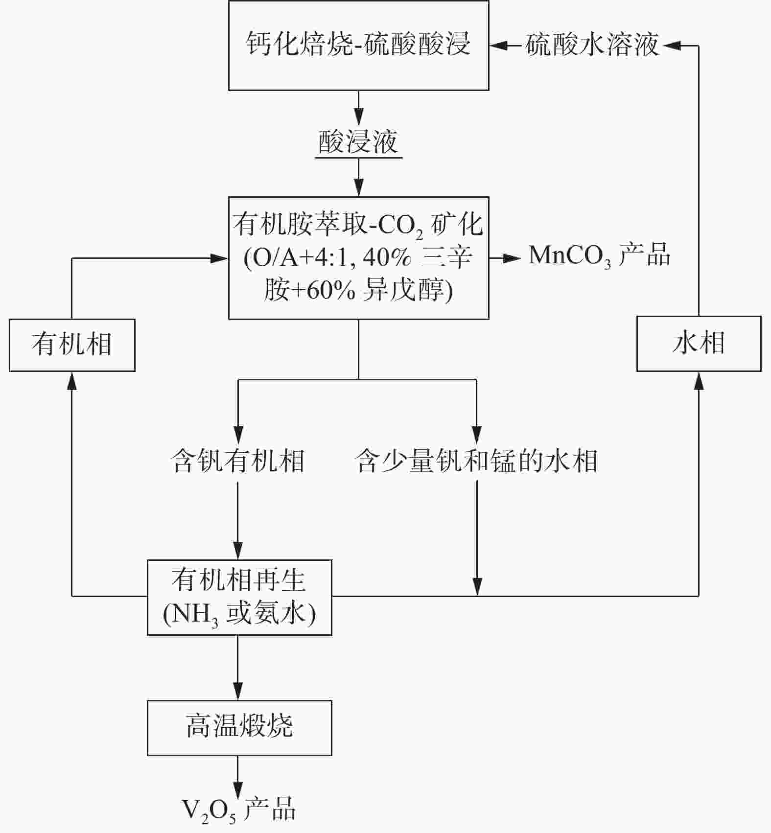 [1] Li Peng, Xiang Guohong, Wang Yongjun, et al. A review on the application of vanadium[J]. Chemical Enterprise Management, 2021,(1):72−73. (李鹏, 向国洪, 王勇军, 等. 钒的应用研究综述[J]. 化工管理, 2021,(1):72−73. doi: 10.19900/j.cnki.ISSN1008-4800.2021.01.036Li Peng, Xiang Guohong, Wang Yongjun, et al. A review on the application of vanadium[J]. Chemical Enterprise Management, 2021(1): 72-73. doi: 10.19900/j.cnki.ISSN1008-4800.2021.01.036 [2] Yu Tangxia, Cao Jing, Wen Jing, et al. Selection of additives for vanadium slag calcification roasting and process optimization[J]. Journal of Materials and Metallurgy, 2020,19(3):176−184. (余唐霞, 曹婧, 温婧, 等. 钒渣钙化焙烧添加剂选择及工艺优化[J]. 材料与冶金学报, 2020,19(3):176−184.Yu Tangxia, Cao Jing, Wen Jing, et al. Selection of additives for vanadium slag calcification roasting and process optimization[J]. Journal of Materials and Metallurgy, 2020, 19(3): 176-184. [3] Aimbetova I, Jimenez-Castaneda R, Clavijo-Blanco J, et al. Investigation of optical and physico-chemical properties of titanium-doped V2O5 nanofilms[J]. Kompleksnoe Ispolzovanie Mineralnogo Syra, 2023,(2):47−52. [4] Lv Changxiao, Zhang Ting'an, Zhang Ying, et al. Comprehensive recovery of vanadium from calcification roasting-acid leaching tailings[J]. Chinese Journal of Rare Metals, 2020,44(11):1208−1214. (吕昌晓, 张廷安, 张莹, 等. 从钙化焙烧-酸浸尾渣中综合回收钒的研究[J]. 稀有金属, 2020,44(11):1208−1214.Lü Changxiao, Zhang Ting, an, Zhang Ying, et al. Comprehensive recovery of vanadium from calcification roasting-acid leaching tailings[J]. Chinese Journal of Rare Metals, 2020, 44(11): 1208-1214. [5] Yin Danfeng, Peng Yi, Sun Zhaohui, et al. Influencing factors of calcified roasting and thermal analysis to the process of vanadium slag produced from Pangang[J]. Metal Mine, 2012,(4):91−94. (尹丹凤, 彭毅, 孙朝晖, 等. 攀钢钒渣钙化焙烧影响因素研究及过程热分析[J]. 金属矿山, 2012,(4):91−94. doi: 10.3969/j.issn.1001-1250.2012.04.024Yin Danfeng, Peng Yi, Sun Zhaohui, et al. Influencing factors of calcified roasting and thermal analysis to the process of vanadium slag produced from Pangang[J]. Metal Mine, 2012(4): 91-94. doi: 10.3969/j.issn.1001-1250.2012.04.024 [6] Liu Zishuai, Zhang Yiming, Dai Zilin, et al. Coextraction of vanadium and manganese from high-manganese containing vanadium wastewater by a solvent extraction-precipitation process[J]. Frontiers of Chemical Science and Engineering, 2020,14(5):902−912. doi: 10.1007/s11705-019-1887-z [7] Cai Zhenlei, Feng Yali, Li Haoran, et al. Selective separation and extraction of vanadium(IV) and manganese(Ⅱ) from co-leaching solution of roasted stone coal and pyrolusite via solvent extraction[J]. Industrial & Engineering Chemistry Research, 2013,52(38):13768−13776. [8] 李道玉, 刘波, 陈婷. 去除含钒浸出液中锰的方法: 中国, CN110331298 A[P]. 2019-10-15.Li Daoyu, Liu Bo, Chen Ting. Methods for removing manganese from vanaium-containing leaching solution: China, CN110331298A[P]. 2019-10-15. [9] Mei Ying, Xue Yuhua, Ye Hengpeng, et al. Selective separation and recovery of manganese from manganese-bearing wastewater using carborn dioxide[J]. Journal of Chemical Industry and Engineering, 2017,68(7):2798−2804. (梅颖, 薛余化, 叶恒朋, 等. 利用二氧化碳选择性分离回收含锰废水中的锰[J]. 化工学报, 2017,68(7):2798−2804. doi: 10.11949/j.issn.0438-1157.20161737Mei Ying, Xue Yuhua, Ye Hengpeng, et al. Selective separation and recovery of manganese from manganese-bearing wastewater using carborn dioxide[J]. Journal of Chemical Industry and Engineering, 2017, 68(7): 2798-2804. doi: 10.11949/j.issn.0438-1157.20161737 [10] Bong-Yeolm Yeom, Lee Chang Soo, Hwang Taek-Sung. A new hybrid ion exchanger: Effect of system parameters on the adsorption of vanadium (V)[J]. Journal of Hazardous Materials, 2009,166(1):415−420. doi: 10.1016/j.jhazmat.2008.11.032 [11] Heo Seo-Jin, Jeon Jong-Hyuk, Kim Rina, et al. Separation of vanadium and tungsten from spent SCR DeNOX catalyst by ion-exchange column[J]. Resources Recycling, 2021,30(4):54−63. doi: 10.7844/kirr.2021.30.4.54 [12] Cai Zhenlei, Feng Yali, Zhou Yuzhao, et al. Selective separation and extraction of vanadium (V) over manganese (II) from co-leaching solution of roasted stone coal and pyrolusite using solvent extraction[J]. Jom, 2013,65(11):1492−1498. doi: 10.1007/s11837-013-0768-z [13] Kumar Jyothi Rajesh, Shin Shun Myung, Yoon Ho Sung, et al. Separation and recovery of vanadium from synthetic leach liquor solutions containing iron, calcium, sodium, aluminum, and manganese by the solvent extraction technique[J]. Separation Science and Technology, 2014,49(6):819−828. doi: 10.1080/01496395.2013.863925 [14] 刘长军, 胡可, 刘颖颖, 等. 一种有机胺萃取耦合CO2矿化分离钙化焙烧酸浸液中钒和/或锰的方法: CN115074529A[P]. 2022-09-20.Liu Changjun, Hu Ke, Liu Yingying, et al. A method for separating vanadium and/or manganese from calcified acid leaching solution by organic amine extraction coupled with CO2 mineralization: China, CN115074529A[P]. 2022-09-20. [15] Shen Biao. Temperature control of acid leaching process for calcified clinker of vanadium slag[J]. Iron Steel Vanadium Titanium, 2018,39(5):30−36. (申彪. 钒渣钙化焙烧熟料酸浸工艺温度控制[J]. 钢铁钒钛, 2018,39(5):30−36. doi: 10.7513/j.issn.1004-7638.2018.05.006Shen Biao. Temperature control of acid leaching process for calcified clinker of vanadium slag[J]. Iron Steel Vanadium Titanium, 2018, 39(5): 30-36. doi: 10.7513/j.issn.1004-7638.2018.05.006 [16] GB/T 8704.5-2020. 钒铁 钒含量的测定 硫酸亚铁铵滴定法和电位滴定法[S].GB/T 8704.5-2020. Ferrovanadium. Determination of vanadium content. The ammonium ferrous sulfate titrimetric method and the potentiometric titrimetric method[S]. [17] GB/T 15
