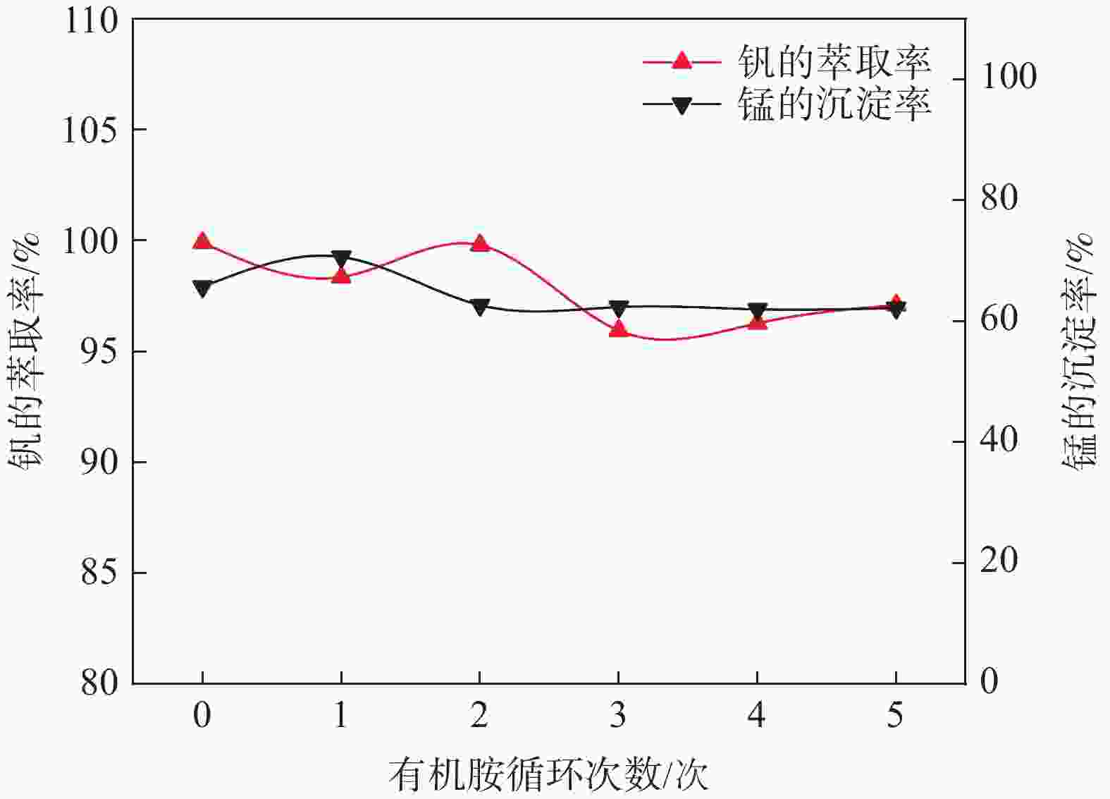 g/L V Mn Ca Al Mg Cr Si Ti 23.44 3.247 0.9646 0.0808 3.631 0.01135 0.0835 0.0325 表 2 酸浸液主要金属元素在有机萃取相和水相中的平衡浓度