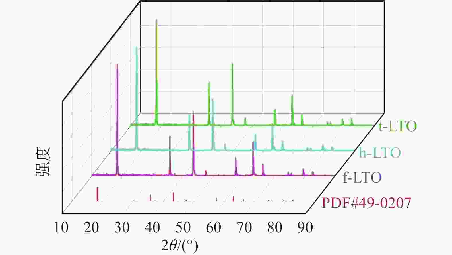 • 图  1  t-LTO、h-LTO及f-LTO的XRD衍射图谱