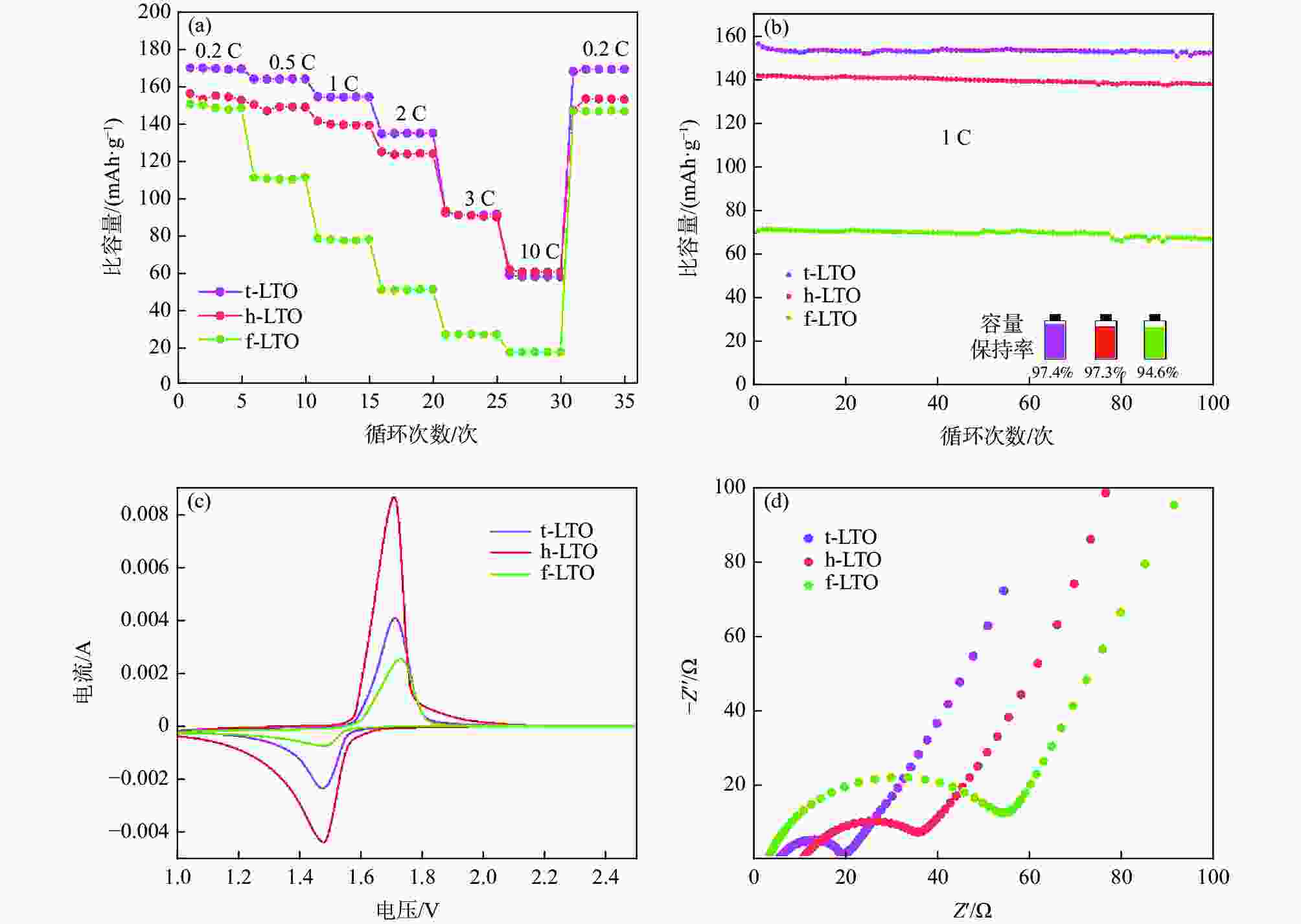 图  3  (a)t-LTO、h-LTO和f-LTO在不同速率下的倍率性能; (b) t-LTO、h-LTO和f-LTO在1 C下的循环性能;(c) t-LTO、h-LTO和f-LTO在0.5 mV/s下的CV曲线; (d) t-LTO、h-LTO和f-LTO的EIS曲线