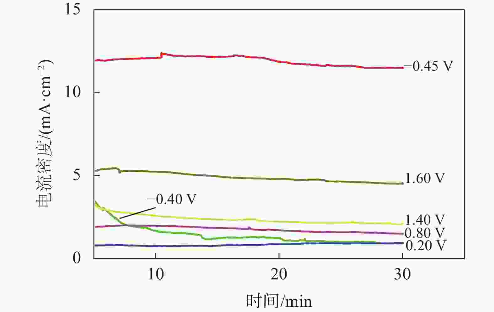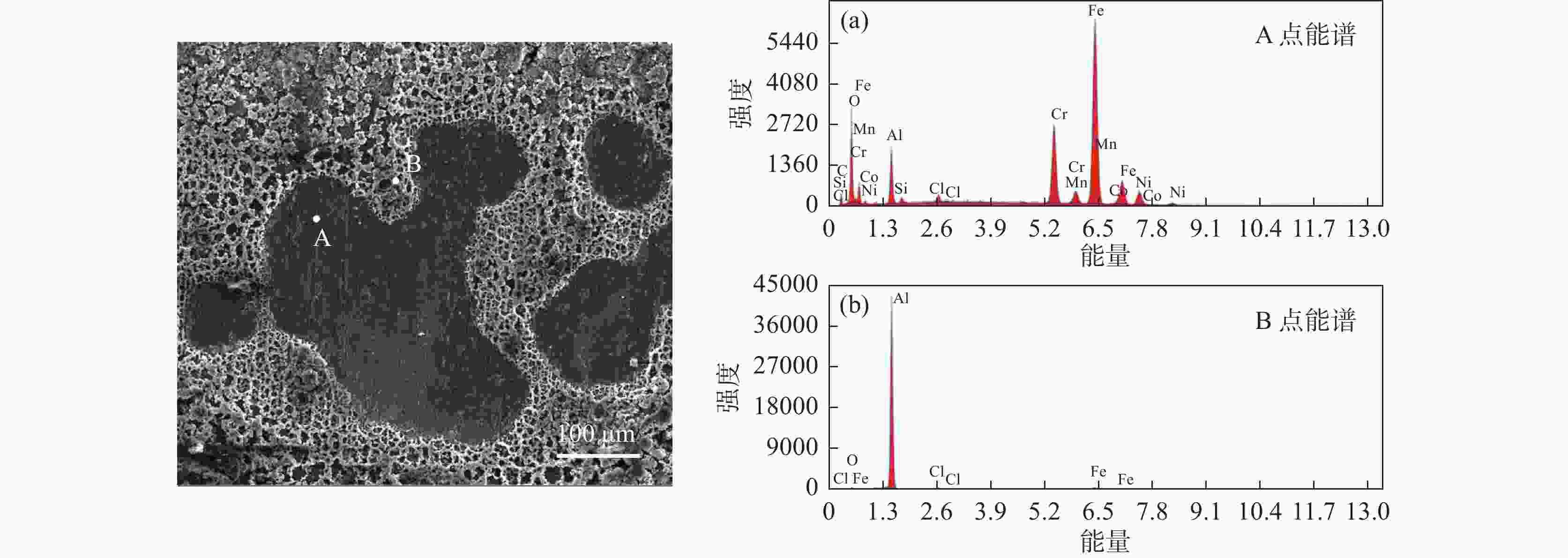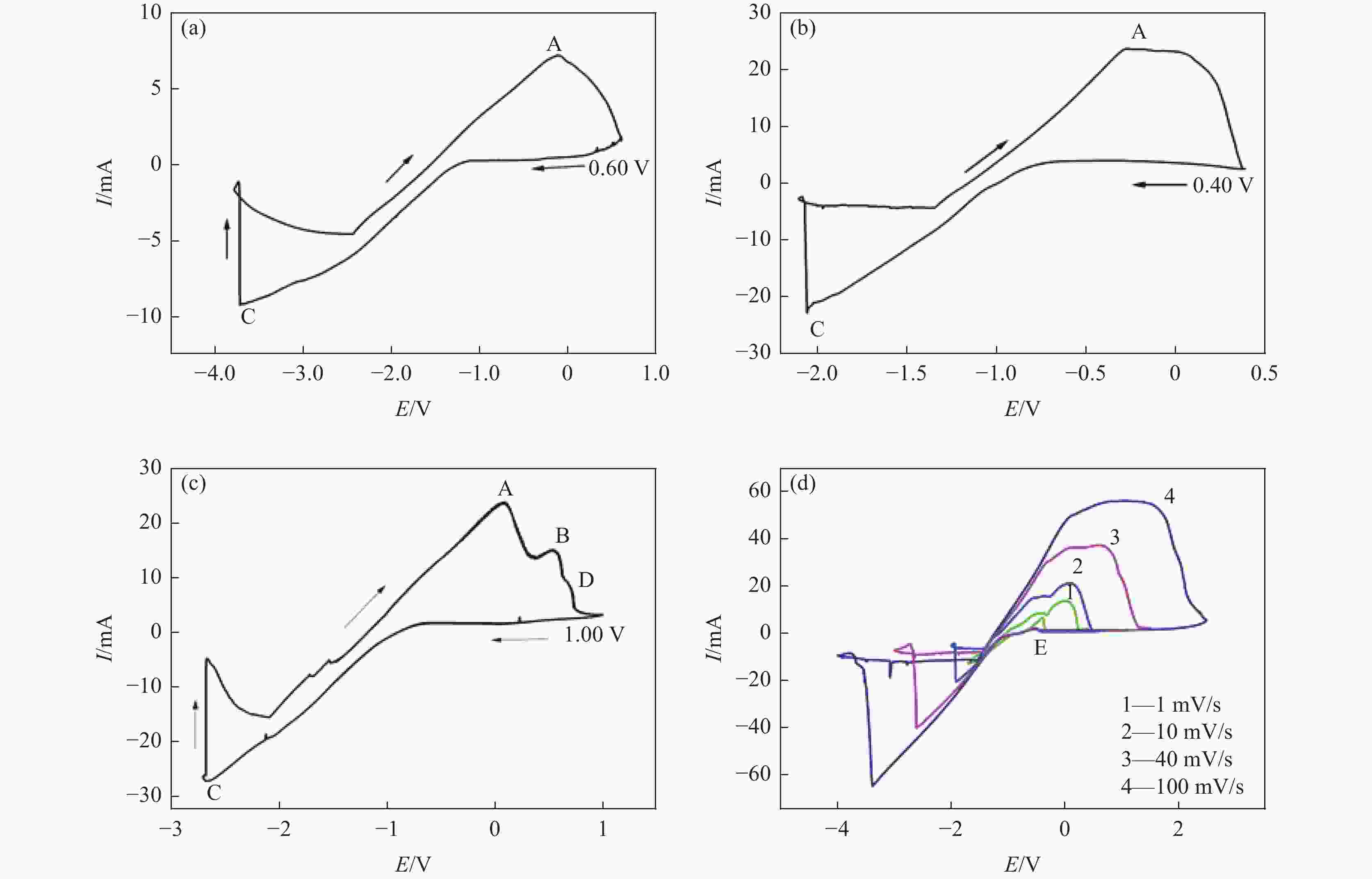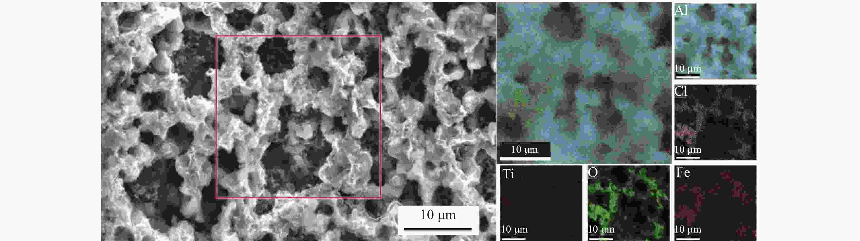 摘要: 为实现钛铝合金的二次回收与分离利用,以钛铝合金为牺牲阳极,1-丁基-3-甲基咪唑氯铝酸盐(BMIC-AlCl3)作为电解液,进行钛铝合金的脱合金化研究。采用循环伏安曲线、动电位极化和恒电位极化对电解过程的脱合金行为进行电化学分析;使用SEM对电解前后样品微区形貌进行表征,使用ICP-AES对电解前后钛铝合金样品中的Al含量进行定量分析。结果表明,钛铝合金在BMIC-AlCl3中的脱合金反应为准可逆反应,且长时间电解过程中电流保持稳定,可实现持续电解脱铝;通过扫描电子显微镜发现阴极沉积层为纯度较高且呈现多孔结构的金属铝。ICP-AES对电解前后的钛铝合金中Al元素含量的分析结果表明,电解后钛铝合金中Al元素含量相对于电解前下降10.67%。Abstract: In order to realize the secondary recycling and separation of Al-Ti alloys, the dealloying of Al-Ti alloys was studied with 1-butyl-3-methyl imidazolium chloride (BMIC)-aluminum chloride (AlCl3) as the electrolyte and Ti-Al alloys as the sacrificial anode. Cyclic voltammetry, potentiodynamic polarization method, and potentiostatic polarization method were performed to analyze the dealloying behavior during electrolysis. SEM-EDS was used to characterize the micromorphology of the samples before and after electrolysis. The Al content in the Ti-Al alloy samples was quantified by ICP-AES. The results showed that the dealloying reaction of Ti-Al alloy in BMIC-AlCl3 is quasi-reversible. The current remains stable during the long-time electrolysis, indicating that the electrolytic dealloying could be achieved continuously. The cathodic deposition layer was found to be metallic aluminum with high purity and porous structure by scanning electron microscopy. The content of Al in titanium aluminum alloy after electrolysis decreased by 10.67% compared with that before electrolysis based on the ICP-AES analysis.