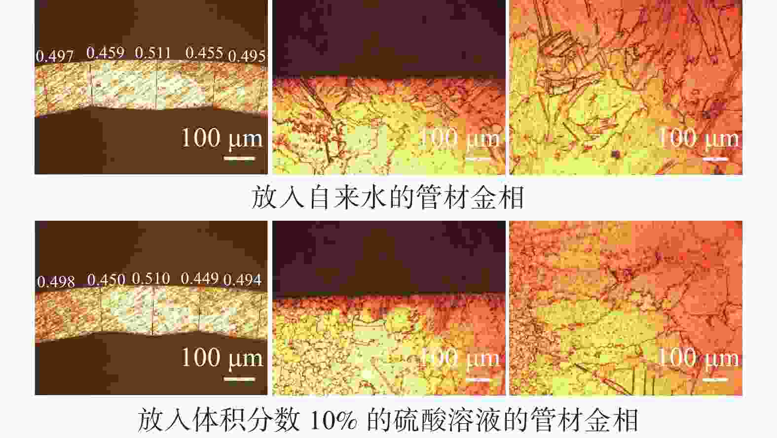 摘要: 模拟不同工况条件,通过宏观尺寸检测、金相分析、力学性能测试等,研究钛焊管在自来水、质量分数为5%的氯化镁水溶液、海水、体积分数为10%的硫酸溶液中长时浸泡的耐腐蚀性能。结果表明,钛焊管在自来水、质量分数为5%的氯化镁水溶液、海水三种溶液中浸泡长达7年,几乎不出现腐蚀现象,腐蚀速率分别为0.333、0.466、0.466 μm/a,具备良好的耐腐蚀性能。钛焊管在体积分数为10%的硫酸溶液中长期浸泡,会出现腐蚀现象,壁厚减薄,减薄率为2%,腐蚀速率为1.398 μm/a,耐腐蚀性能较其他三种溶液下差。该研究对钛焊管在生活用水、制盐、海洋工程、海水淡化等环境的应用具有重要意义。Abstract: Simulating different operating conditions the corrosion resistance of titanium welded pipe in tap water, 5% magnesium chloride aqueous solution, seawater and 10% sulfuric acid solution soaked for a long time was studied through macro-size detection, metallographic analysis and mechanical properties test. The results show that there is almost no evident corrosion of titanium welded pipe after long-term immersion in tap water, 5% magnesium chloride aqueous solution and seawater. The corrosion rate is 0.333, 0.466 μm /year and 0.466 μm/year, respectively, representing a predominant corrosion resistance of titanium welded pipe. The titanium welded pipe can be corroded after a long-term immersion in 10% sulfuric acid solution. The wall of titanium welded pipe becomes thinned with a reduction rate of 2% . The corrosion rate is 1.398 μm/year, and the corrosion resistance is worse than the other three solutions. This research is of great significance to the application of titanium welded pipe in domestic water, salt making, ocean engineering and seawater desalination.
