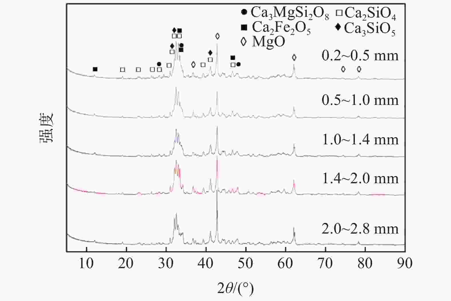 % 样品 CaO SiO2 MgO Al2O3 TFe FeO Fe2O3 MFe TiO2 转炉钢渣 38.52 13.96 11.92 6.02 17 1.88 20.2 1.4 0.74 气淬钢渣 47.06 18.52 14.68 3.16 6.04 3.58 1.21 表 2 气淬钢渣的表观密度