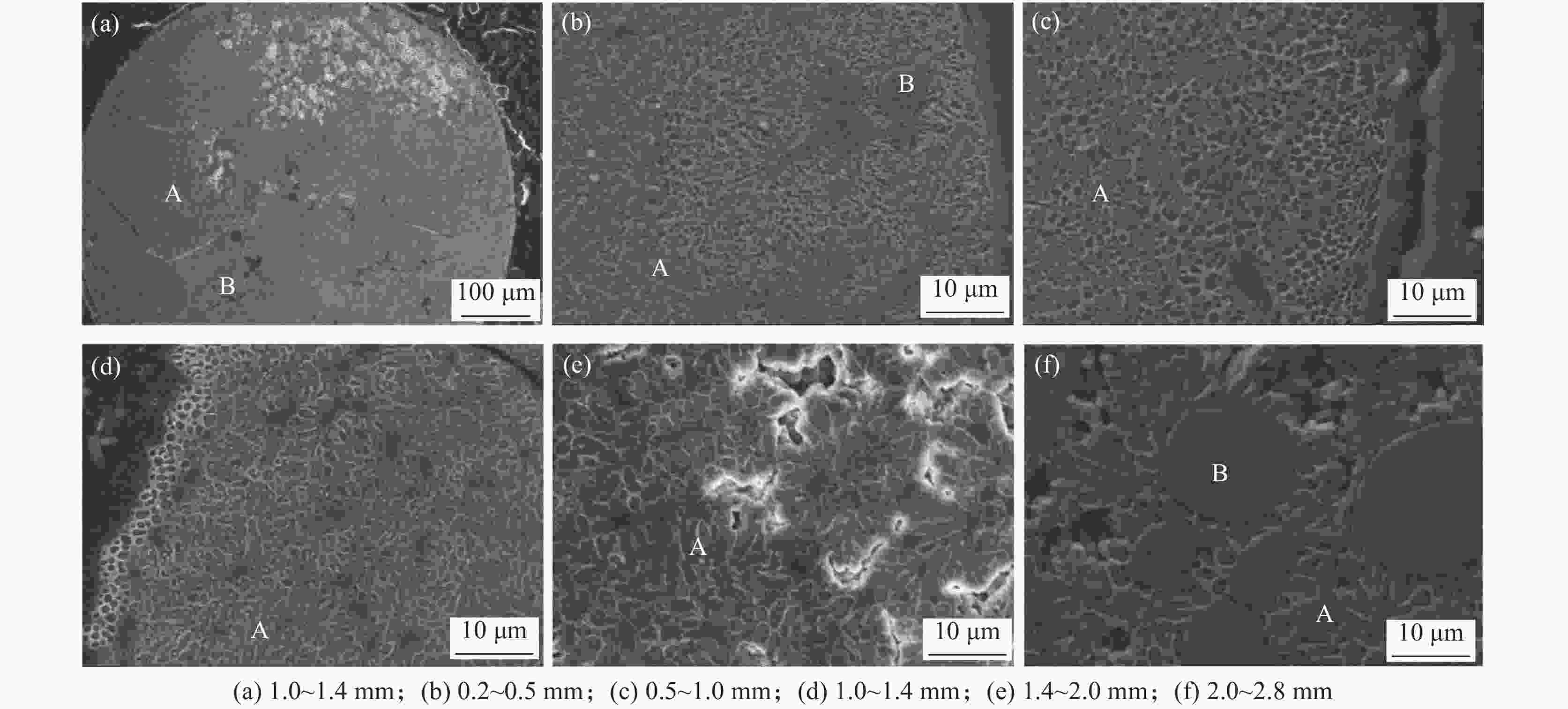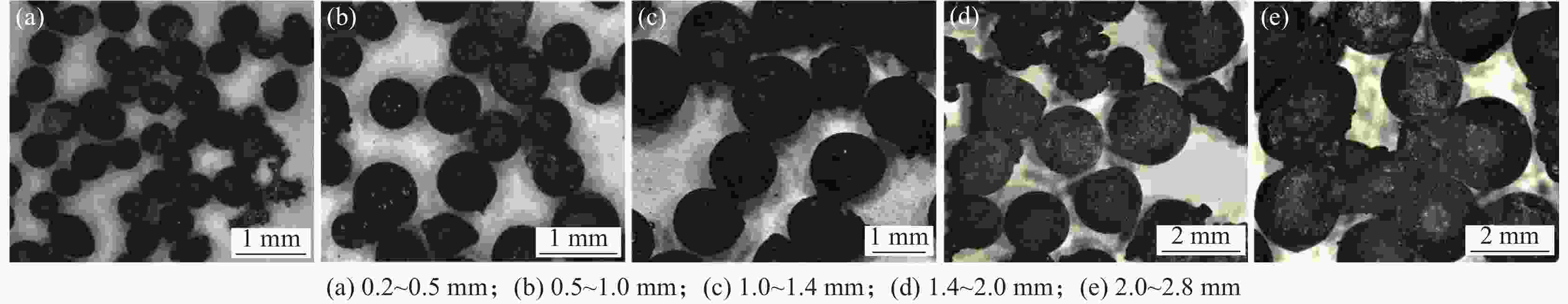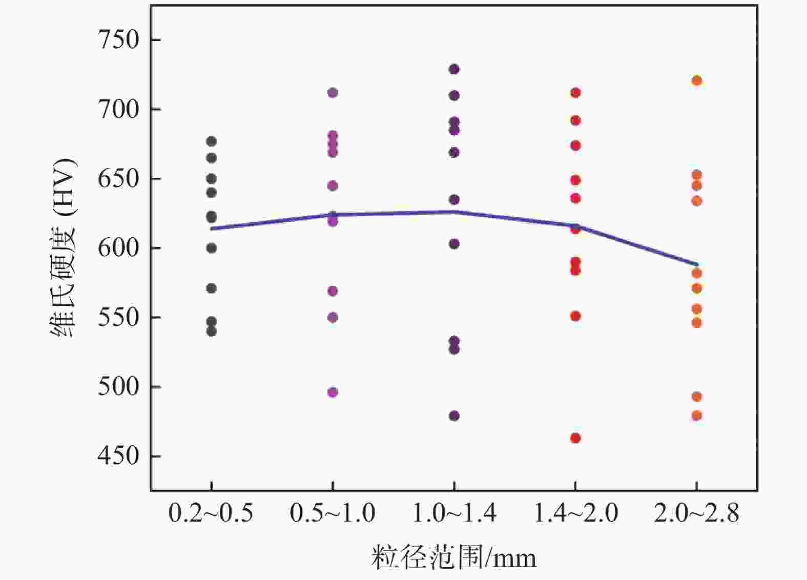 摘要: 以固态钢渣为原料,经电弧炉高温重熔后,采用气淬法制备了不同粒径的钢渣。对比不同粒径气淬钢渣在物相组成、显微结构、表观密度、形貌特征以及硬度方面的异同,并分析气淬钢渣用作喷砂磨料的可行性,选择磨料性能较好的气淬钢渣进行喷砂试验。结果表明,不同粒径气淬钢渣的物相组成基本一致,主要为硅酸钙相和方镁石相;表观密度随着粒径增大而减小,均符合非金属磨料的密度标准;五个粒径的气淬钢渣维氏硬度(HV)平均值均超过588,适合用作喷砂磨料。综合考虑不同粒径下气淬钢渣磨料的性能和喷砂效果,0.5~1.0 mm的气淬钢渣最适合用作喷砂磨料。Abstract: Using solid steel slag as raw material, steel slag with different particle sizes was prepared by air quenching after high-temperature remelting in an electric arc furnace. the differences and similarities of air-quenched steel slag with different particle sizes in terms of phase composition, microstructure, apparent density, morphological characteristics and hardness were compared, and the feasibility of using air-quenched steel slag as sandblasting abrasive was analyzed. The air-quenched steel slag with better abrasive properties was selected for sandblasting experiment. The results show that the phase composition of air-quenched steel slag is similar, mainly calcium silicate phase and cubic magnesite. The apparent density decreases with the increase of particle size, which conforms to the density standard of nonmetallic abrasives. The average Vickers hardness of the five particle sizes of air-quenched steel slag is more than 588, which is suitable for abrasive blasting. Considering the performance and blasting effect of different particle sizes of air-quenched steel slag, 0.5~1.0 mm air-quenched steel slag is the most suitable for abrasive blasting.
