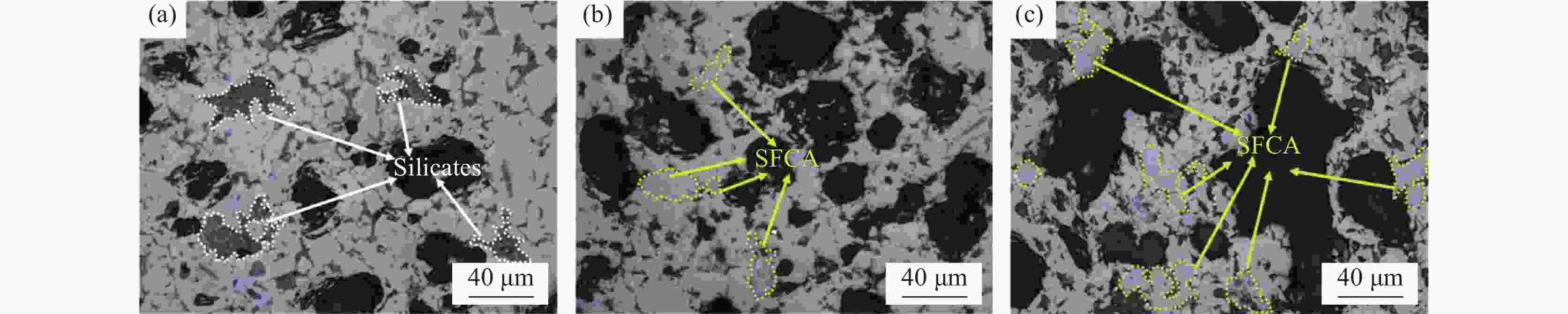 Abstract: In view of the problems of low yield, poor strength and high energy consumption in the sintering process of vanadium titanomagnetite, a new sintering technology of preformed calcium ferrite is proposed in this paper, and its feasibility and theoretical basis are revealed through the tablet sintering and thermal analysis test. The results show that with the increase of substitution ratio (preformed calcium ferrite to partially substitute CaO), the microstructure of roasted products changes from granular structure to melting corrosion structure, the content of SFCA increases, while perovskite content decreases. In addition, the quantity of melts increases, the coalesce of sintering bubbles is promoted, the average porosity decreases from 42.9% to 36.2%, and the densification of the matrix is promoted. The formation of calcium ferrite melts in the heating process can be divided into three reactions, according to the formation temperature from low to high, it is the eutectic reaction of CF+CF2 → L, the melting of SFCA-I and SFCA, respectively; the addition of preformed calcium ferrite can reduce the generation temperature of initial melts, and increase the total sintering melts by about 9 %; promote the melting of iron oxides into the initial melts, increase the content of calcium ferrite, and promote solid-liquid assimilation reaction.-