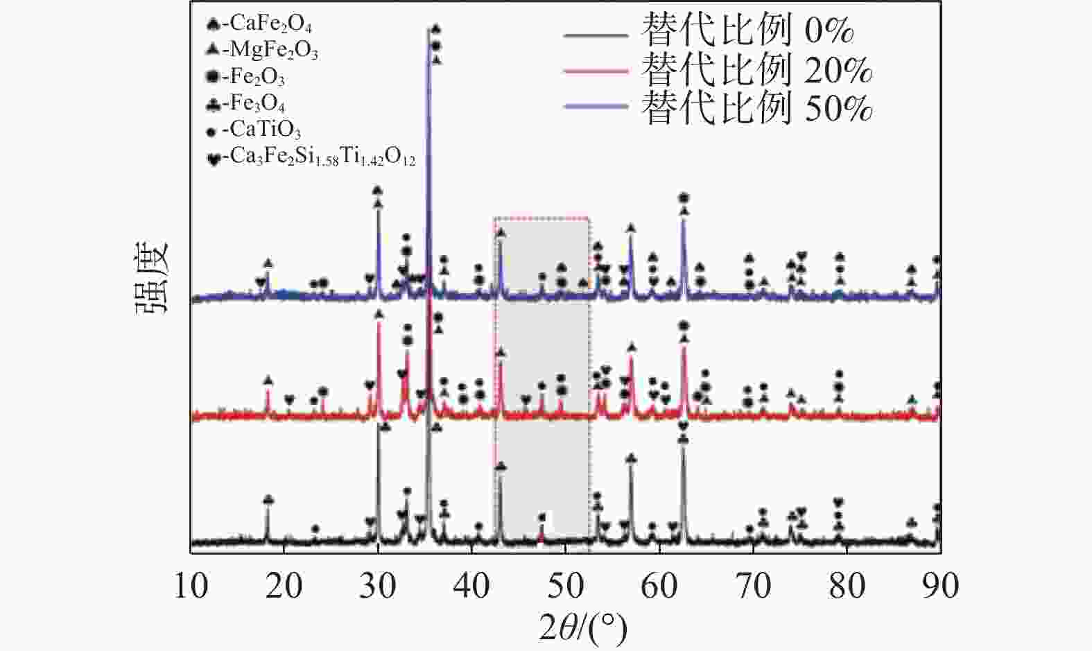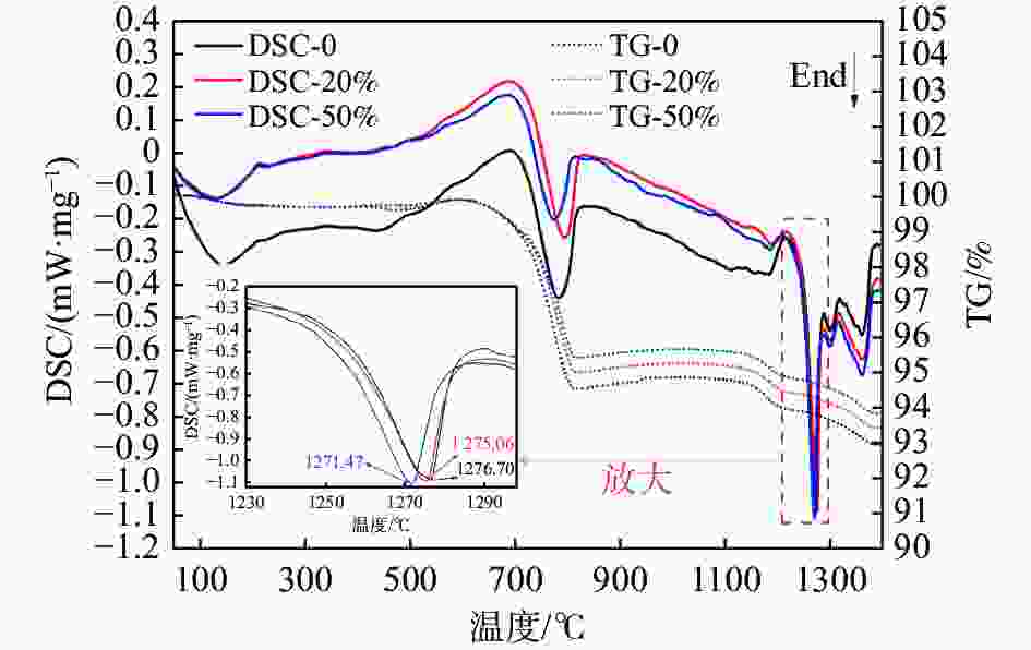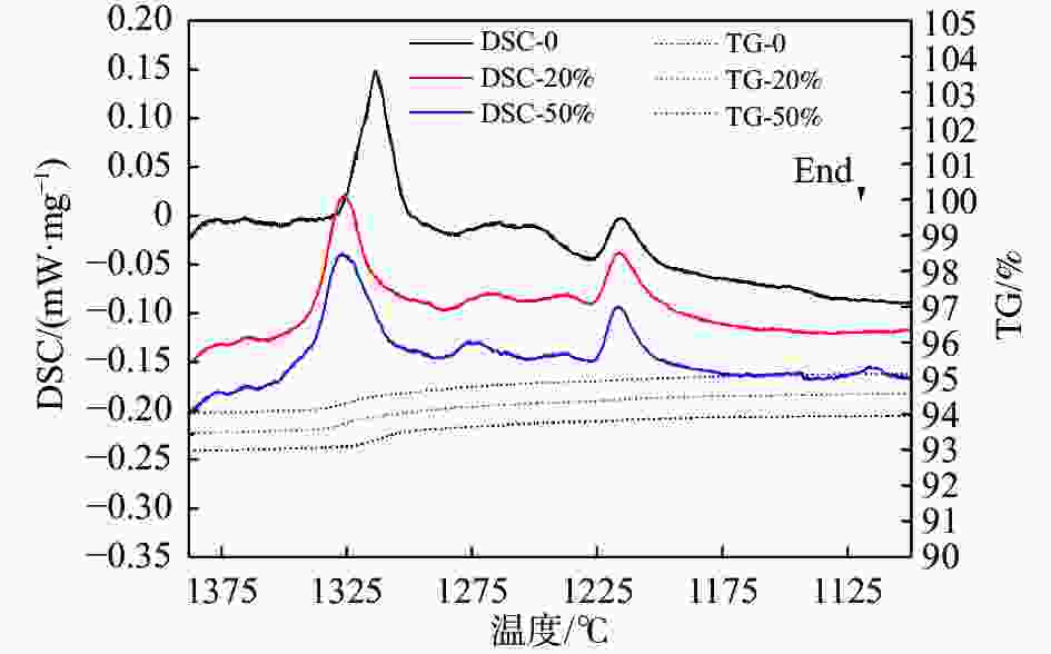 替代比例/% 温度区间/ ℃ 峰值/ ℃ 曲线特征 DSC峰面积分/(J·g−1) 物理化学变化 TG DSC 0 1336~1281 1313 略有