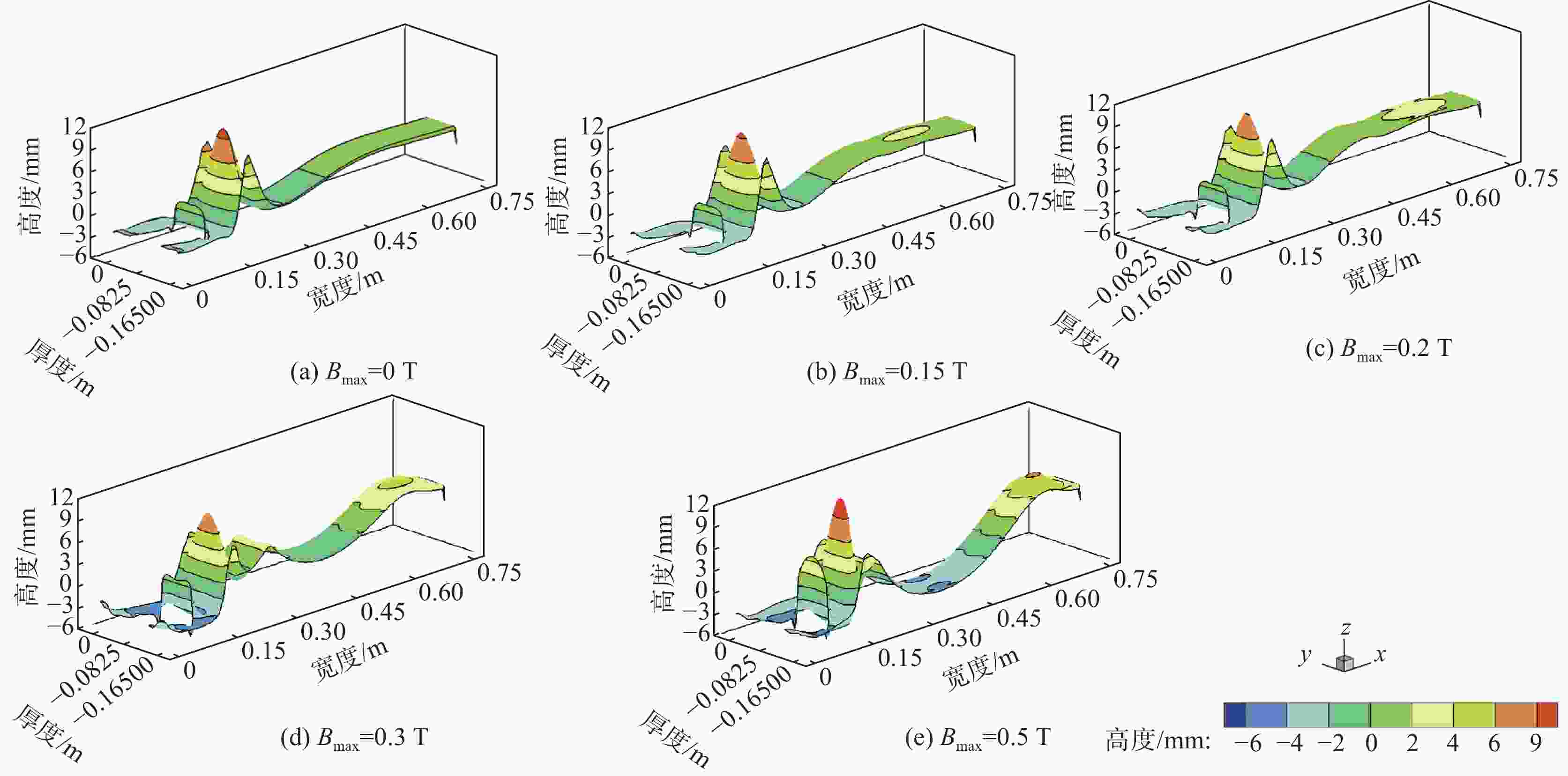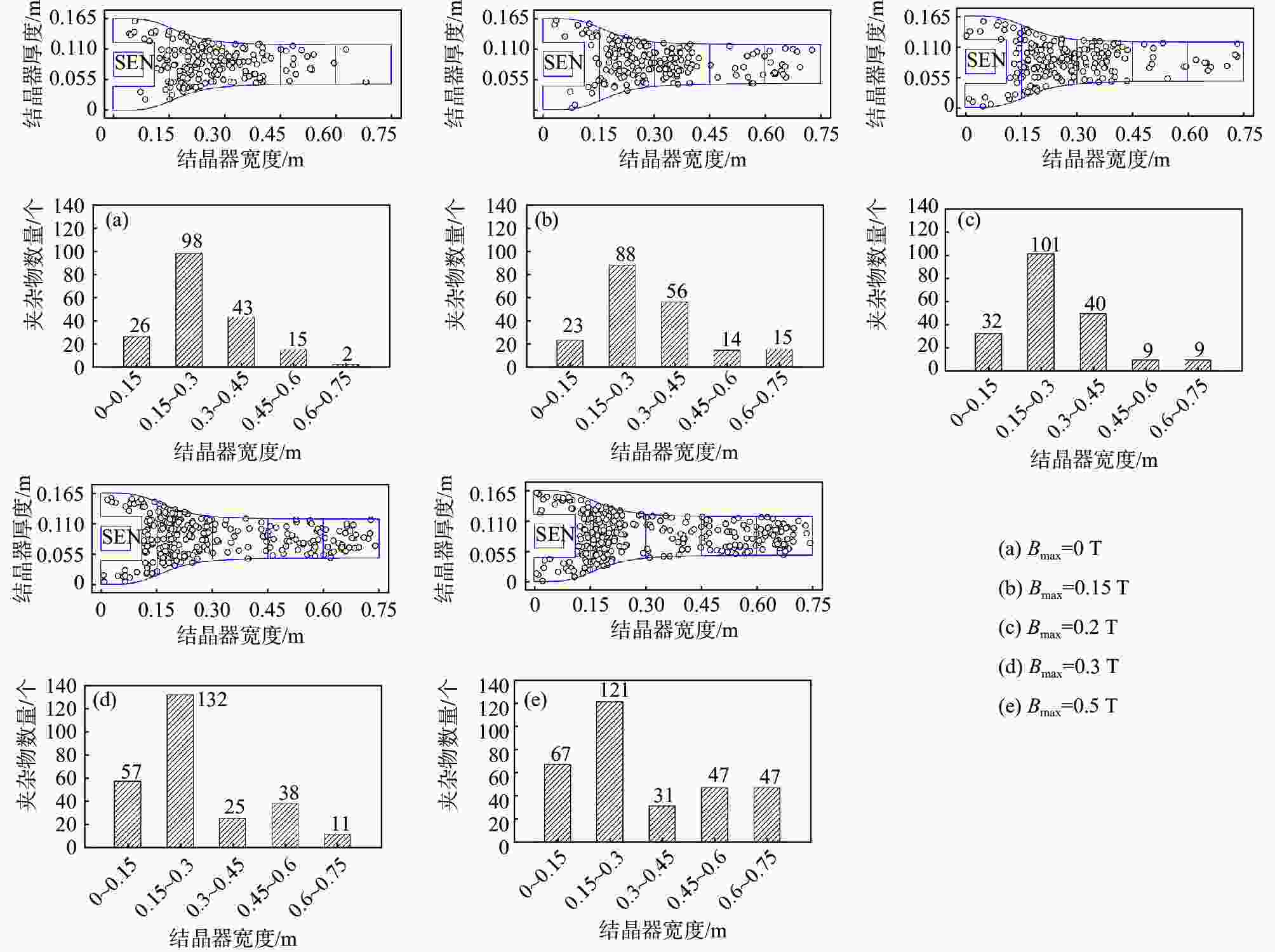 摘要: 为研究薄板坯连铸全幅一段电磁制动冶金效果,以漏斗形FTSR结晶器为研究对象,利用建立的三维多场数学模型,模拟全幅一段电磁制动作用下电磁参数变化对FTSR结晶器钢液流动、传热凝固及夹杂物迁移行为的影响。结果表明,施加全幅一段电磁制动后,结晶器内钢液温度分布的均匀性提高,钢液流股对熔池的穿透深度减小,这不仅利于下回流钢液夹带的夹杂物上浮去除,还促使上回流钢液将热量输送到弯月面区,避免弯月面处熔渣凝固而形成渣圈。此外,通过适当增加磁感应强度,可降低钢液表面流速,控制上吐出孔处液面波动。当磁感应强度达到0.3 T时,钢液表面最大流速降低至0.27 m/s,上吐出孔处液面峰值降低至7.3 mm。Abstract: For the research object of flexible thin slab rolling (FTSR) funnel-shaped mold, a three-dimensional (3-D) multi-field coupling mathematical model was established for describing the electromagnetic braking (EMBr) continuous casting process. To investigate the metallurgical effect of Ruler-EMBr device, the effects of various electromagnetic parameters on the behaviors of molten steel flow, heat transfer, solidification, and inclusions motion in the FTSR mold were discussed. The results indicate that the application of Ruler-EMBr can improve the uniformity of molten steel temperature distribution and reduce the penetration depth of downward backflow in the FTSR mold. This is beneficial to the floating removal of inclusions entrained in the downward backflow. Moreover, it is also conducive to the upward backflow to transport more heat to the meniscus region, avoiding slag solidification and slag rim formation. The parametric study also shows that the molten steel surface velocity can be reduced and the surface fluctuation at the upper ports of submerged entry nozzle (SEN) can be controlled with the increase of magnetic flux density appropriately. When the magnetic flux density reaches to 0.3 T, the maximum molten steel surface velocity decreases to 0.27 m/s, and the surface peak value at the upper ports of SEN decreases to 7.3 mm.