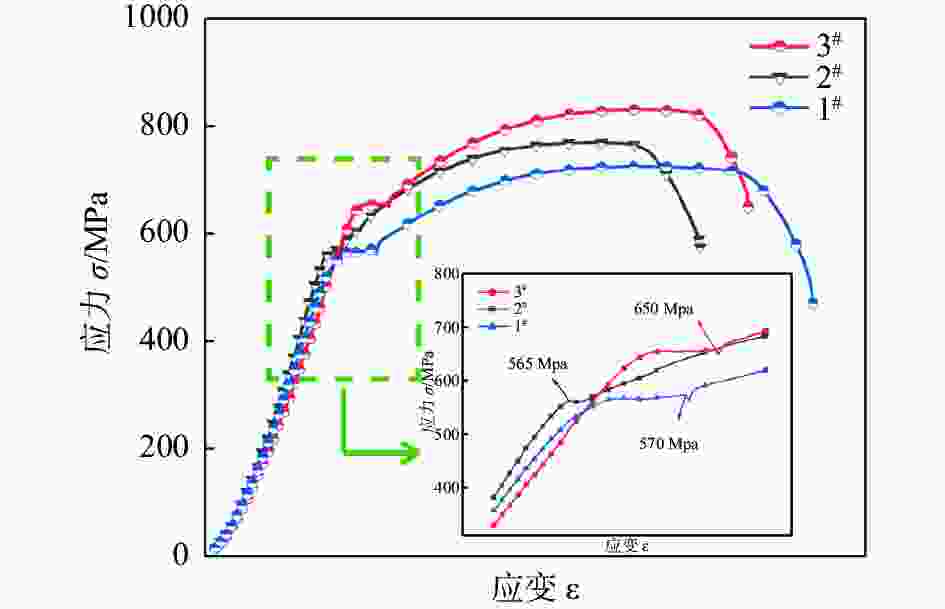 % 编号 C Si Mn P S V Nb N 1# 0.23 0.49 1.44 0.028 0.018 0.066 0.012 0.0169 2# 0.23 0.53 1.50 0.022 0.020 0.078 0.012 0.0186 3# 0.26 0.72 1.52 0.021 0.006 0.149 0.012 0.0223 表 2 三种试验钢的力学性能